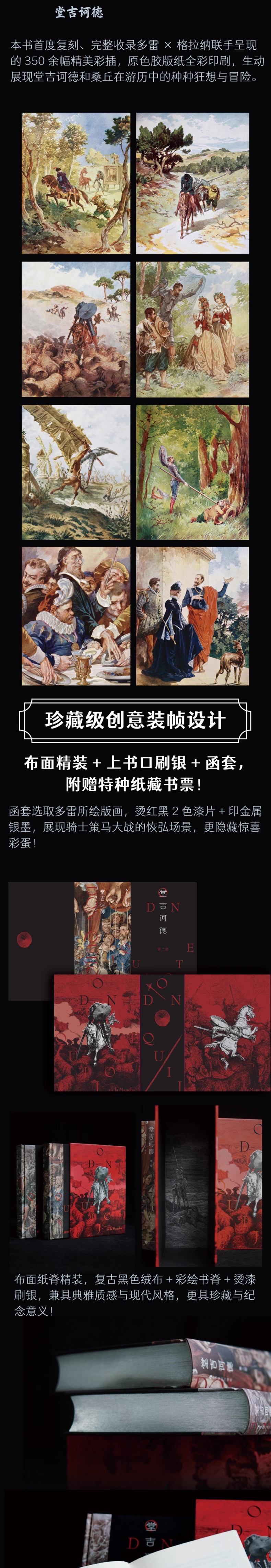 特别设计珍藏版函套,选取艺术大师多雷所绘《堂吉诃德》版画,烫红黑2色漆片+印金属银墨,展现骑士策马大战的恢弘场景: