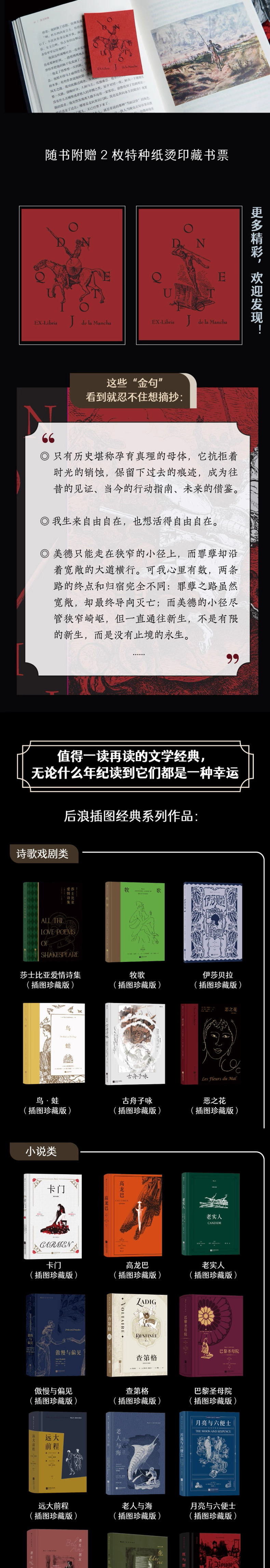 随书附赠2枚特种纸烫印藏书票,选取多雷所绘的2种堂吉诃德经典形象,成为幻想与现实的荒谬对照: