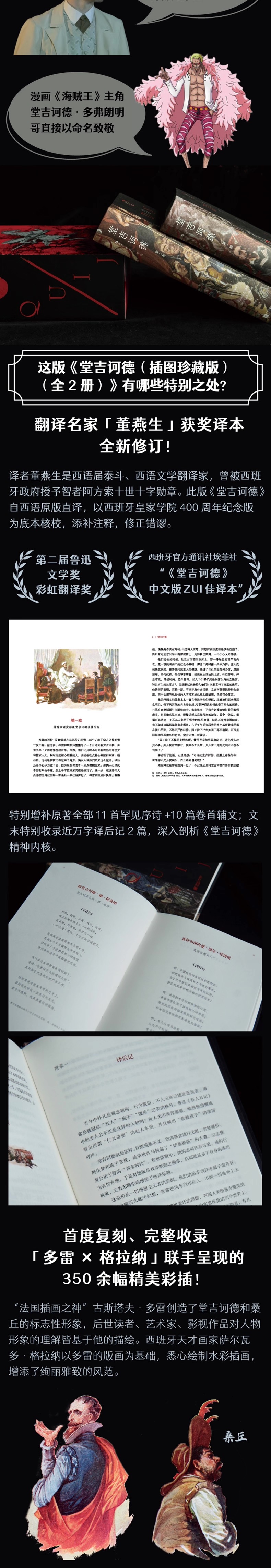本书首度复刻、完整收录多雷×格拉纳联手呈现的350余幅精美彩插,原色胶版纸全彩印刷,生动展现堂吉诃德和桑丘在游历中的种种狂想与冒险。