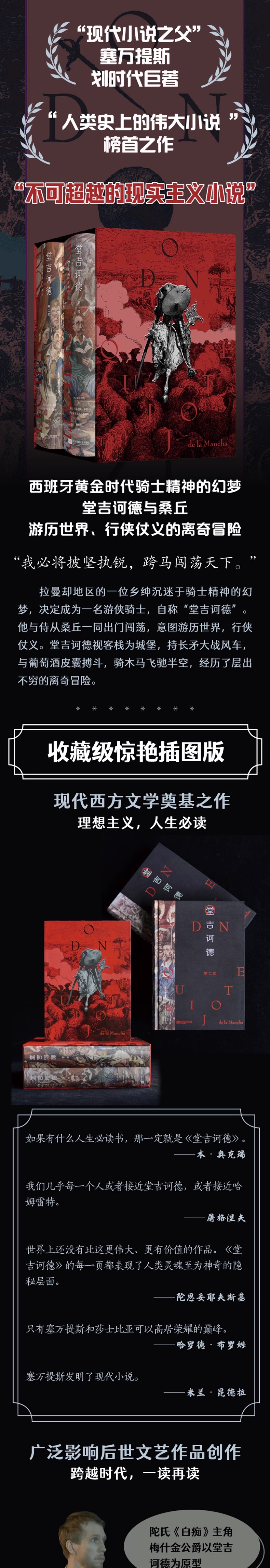 世界上还没有比这更伟大、更有价值的作品。《堂吉诃德》的每一页都表现了人类灵魂至为神奇的隐秘层面。——陀思妥耶夫斯基