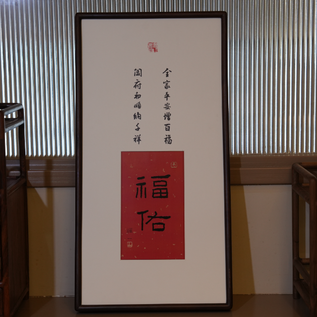 边框采用海棠木装裱,高级天然,与“福佑”、对联气质浑然一体。