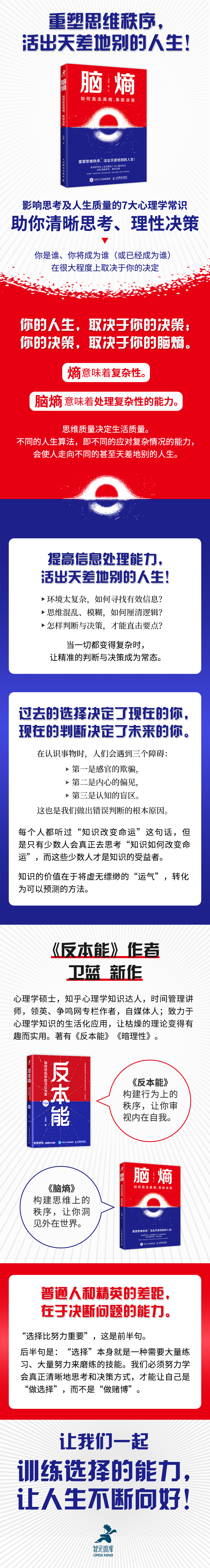 当一切*变得复杂时 让判断与决策成为常态 环境太复杂,如何寻找有效信息? 思维混乱、模糊,如何厘清逻辑? 怎样判断与决策,才能直击要点? 在现代生活中,我们接触到的信息越来越复杂,大脑对这些复杂信息的处理能力也需要逐步提高。想要拥有更强的信息处理能力,*要优化大脑的算法。 脑熵是指大脑可以访问的神经元的数量水平,用来衡量大脑对复杂信息的处理能力。脑熵越高,说明大脑的信息处理能力越强。而信息的处理能力与我们的思考方式和决策能力息息相关。 本书以知识的功能模式为主体,提出了优化心智算法“四部曲”,分析了人类如何描述表象、解释现象、预测趋势、改造自身和外界。同时,为改善思考方式和提高决策能力,本书通过拆解认知心理学、神经科学等领域的研究成果,得出有效改善信息处理能力的方法,帮助人们减少知识盲区、思维盲区和认知偏见,从而提升处理复杂信息的能力。