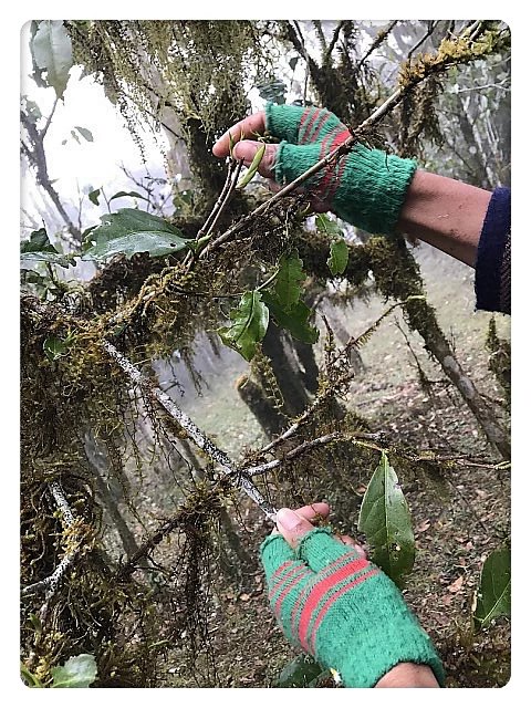 因为古树的明前茶很少,所以采茶的时候,大家各显神通。以前暴力采茶——乡亲拿着一把刀,看着茶叶多的古树,直接把古树砍到,然后采茶。经过林业局与乡亲们不断地斗争博弈,最终达成一个共识——进森林里采茶可以,但不许带刀进。因此现在采茶的活儿,尤其是古树茶,还需要有爬树的能力——我们同事金姐,示范爬树采茶