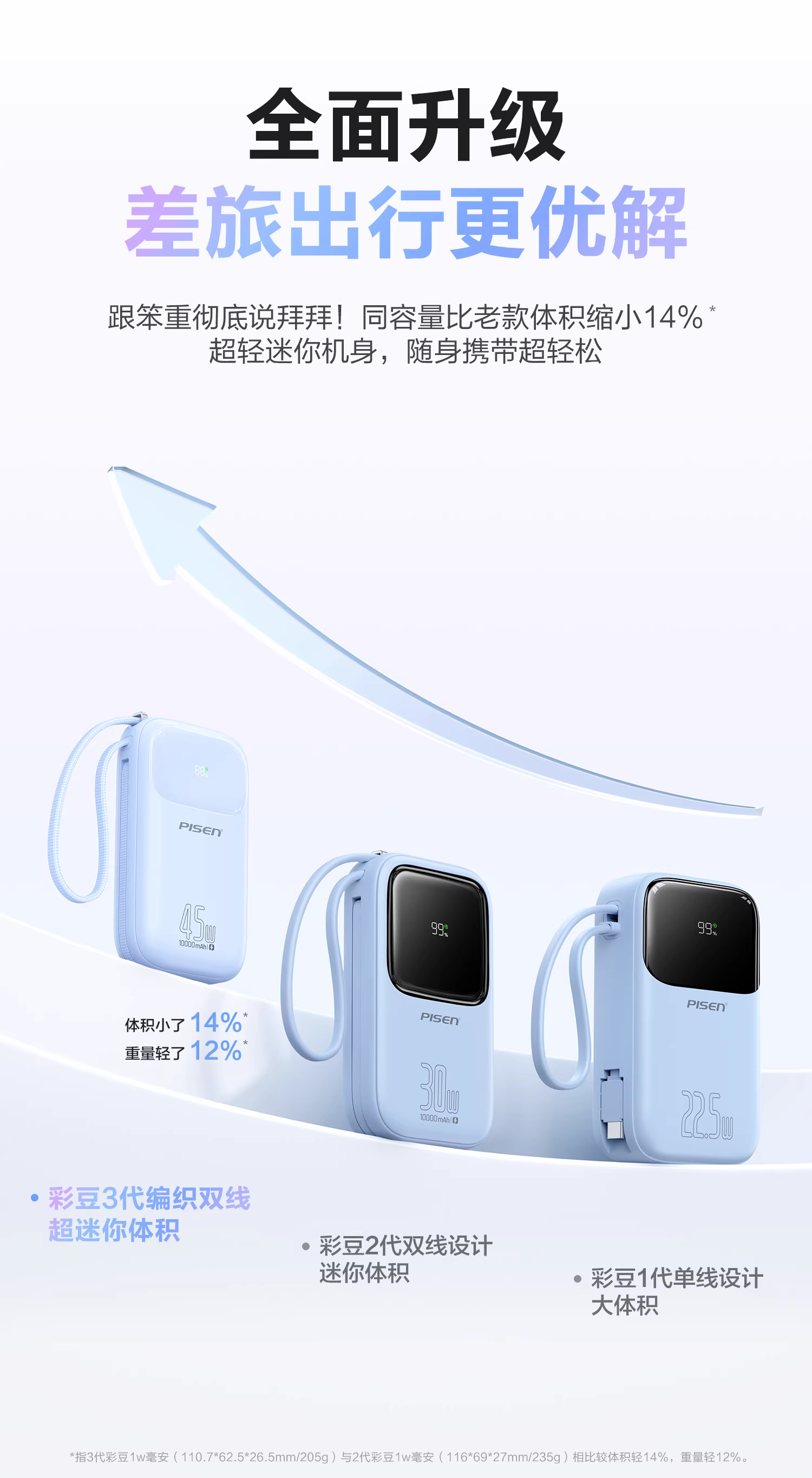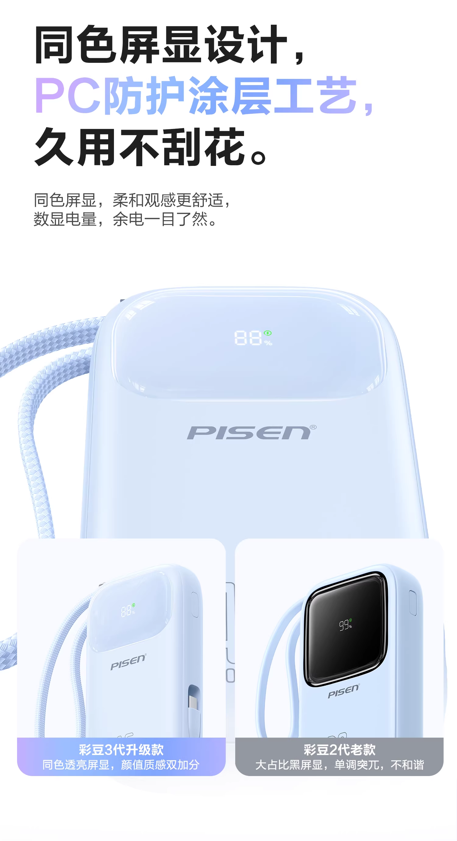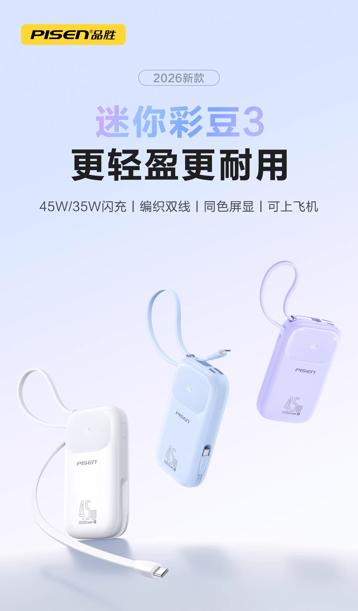 品胜 30W/45W彩豆双自带线快充电宝20000毫安 支持PD快充迷你挂绳移动电源苹果14/15充电