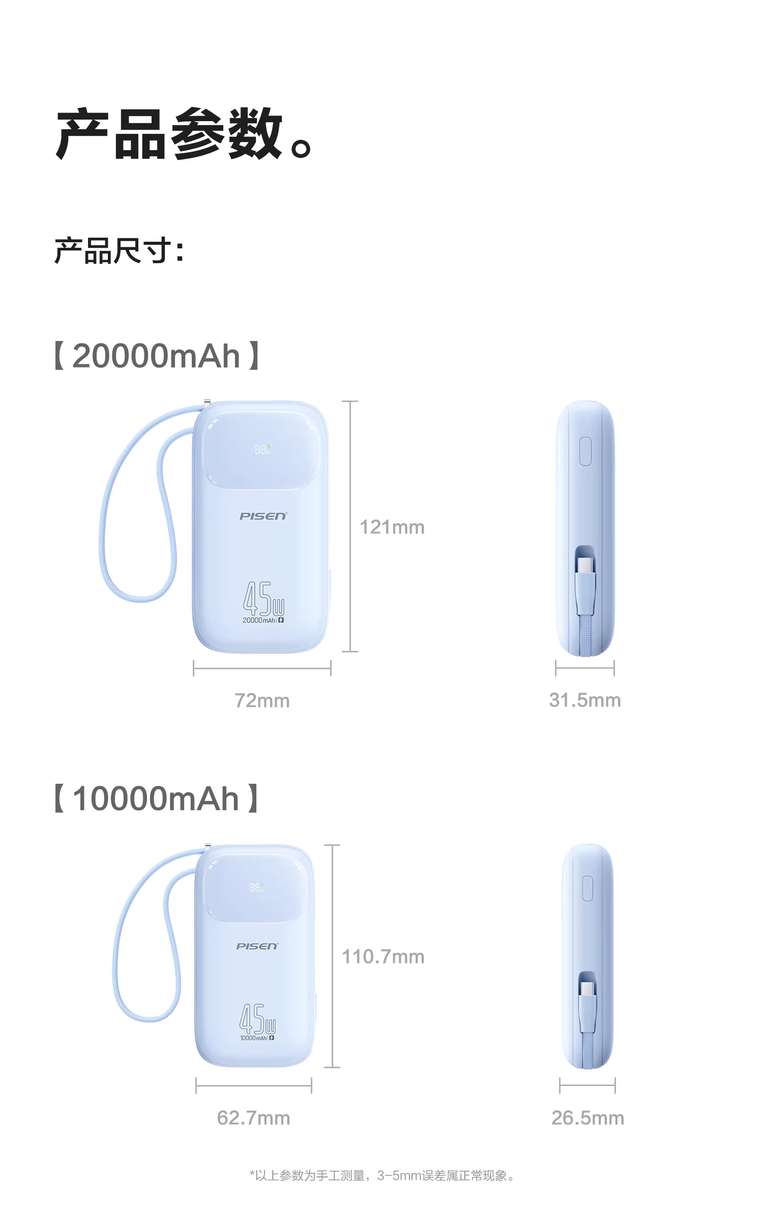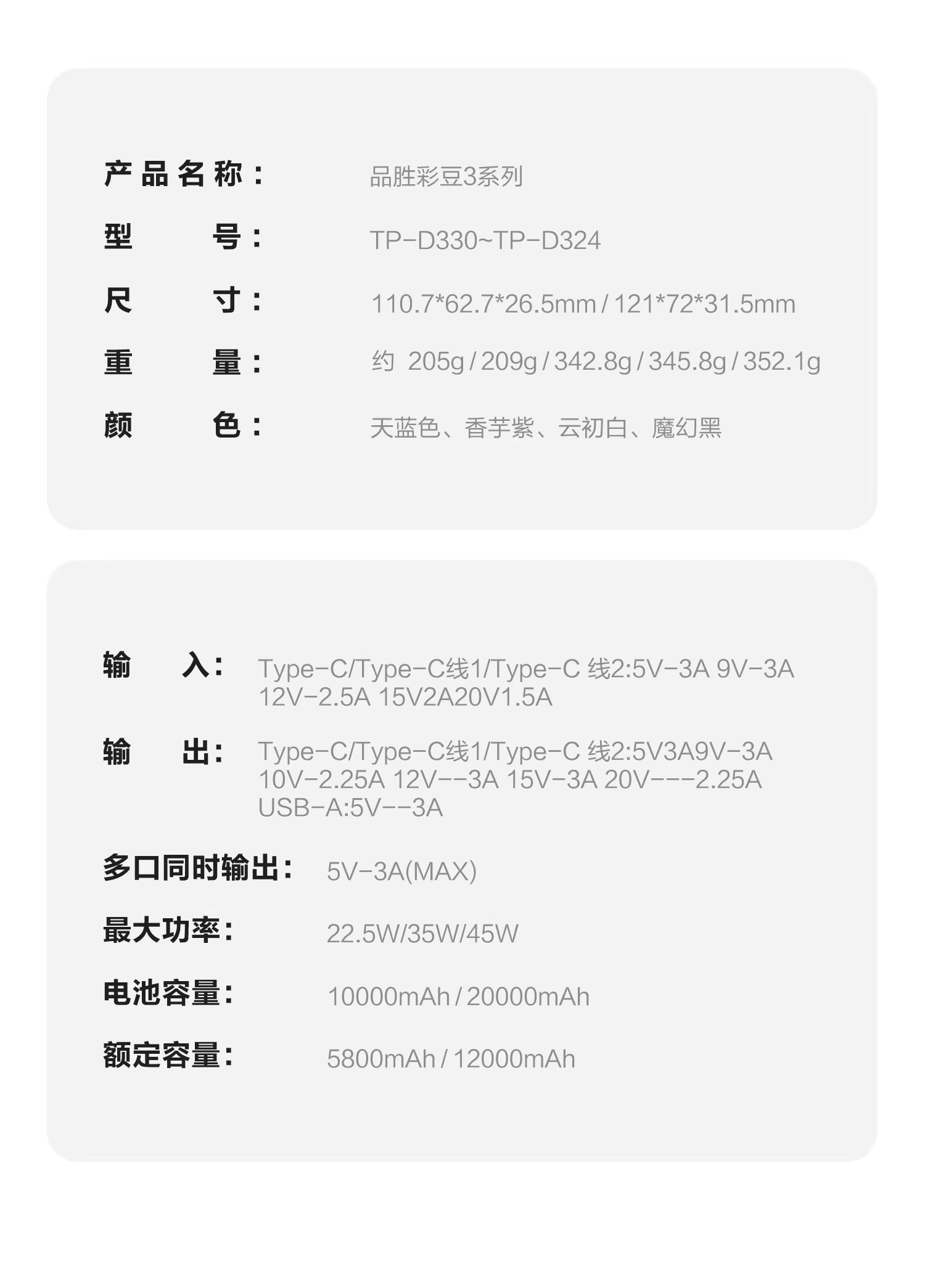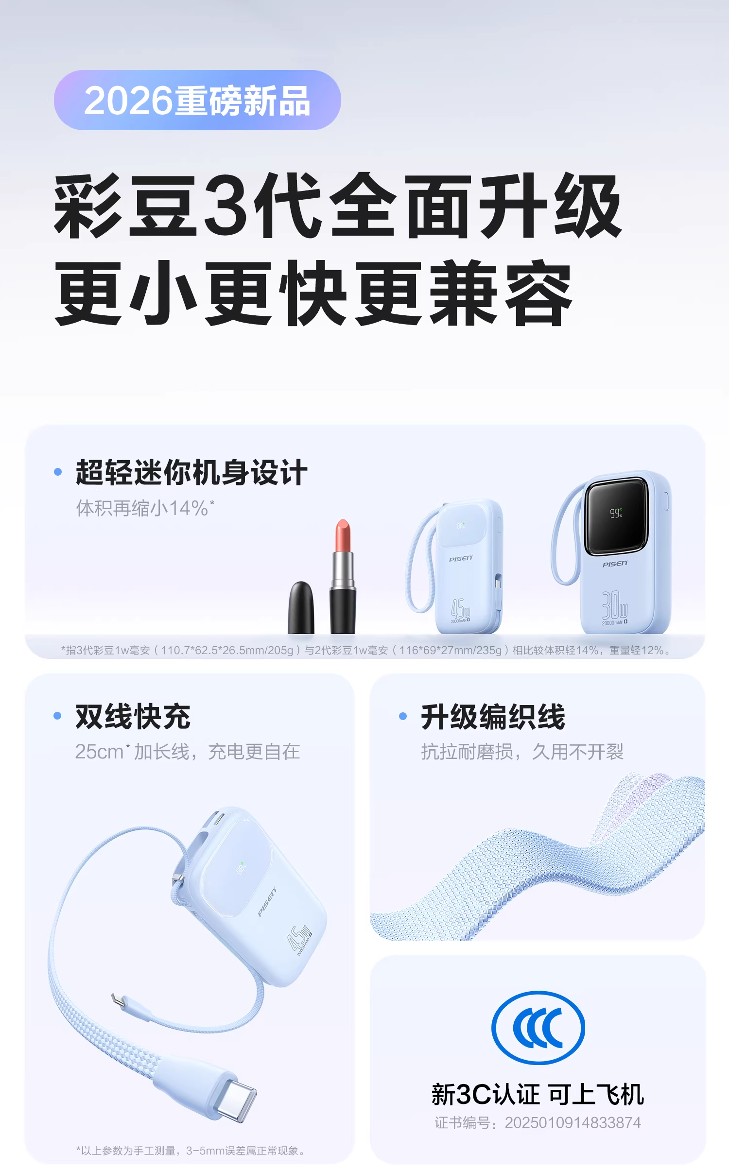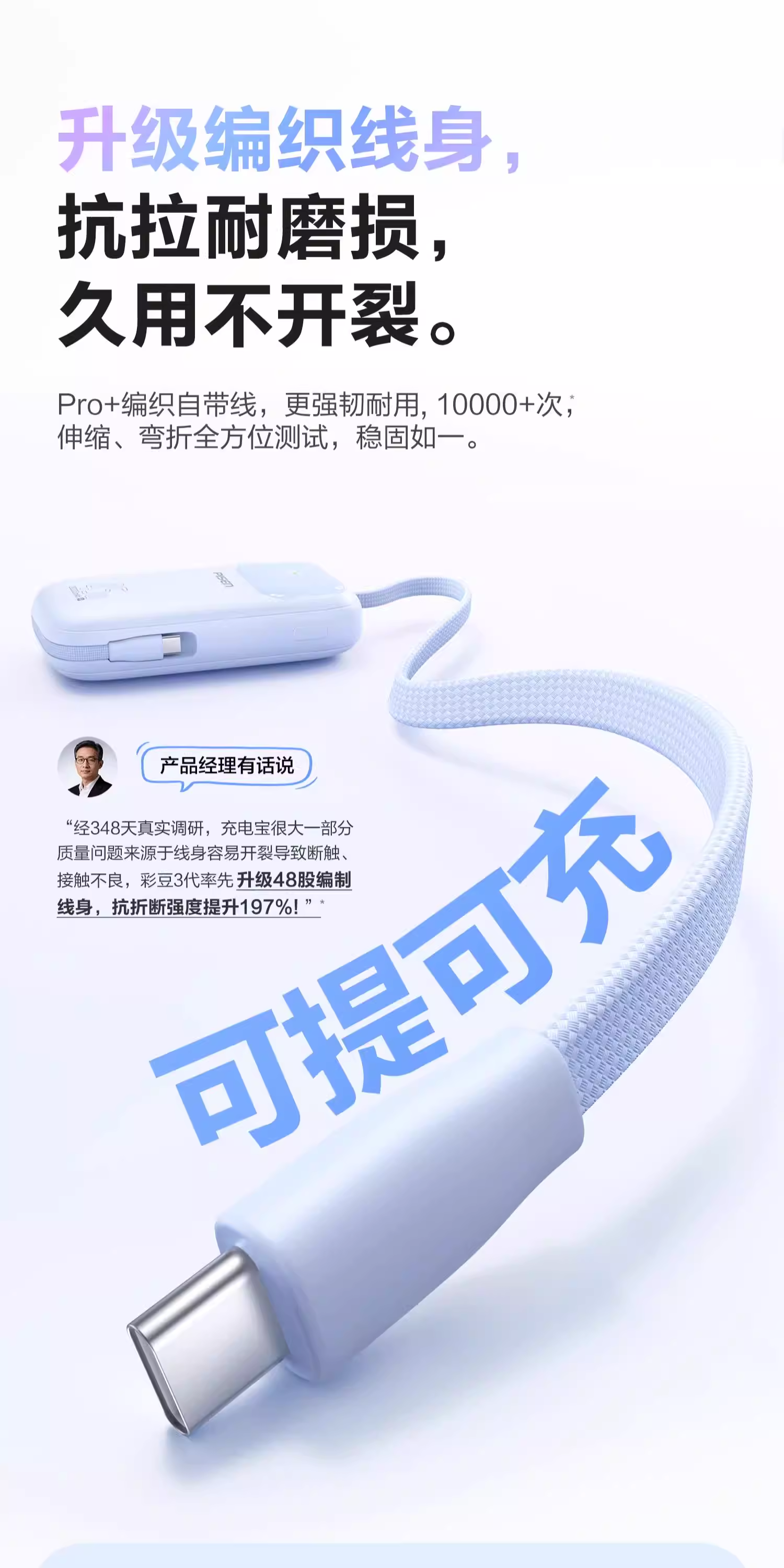 品胜 30W/45W彩豆双自带线快充电宝20000毫安 支持PD快充迷你挂绳移动电源苹果14/15充电