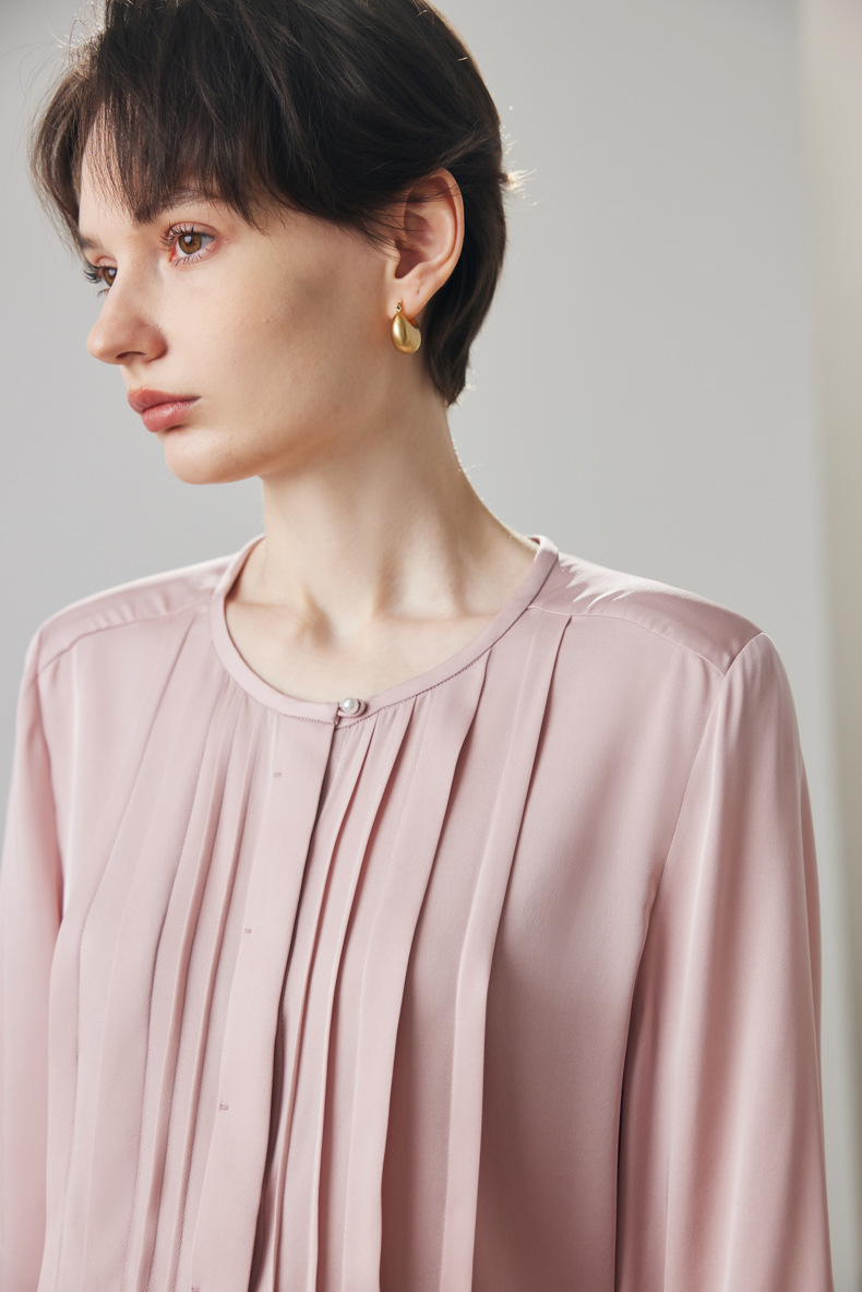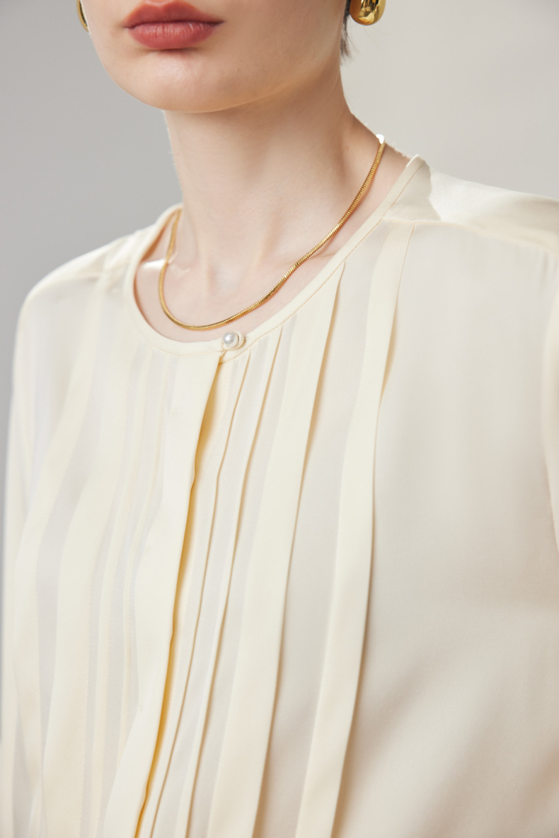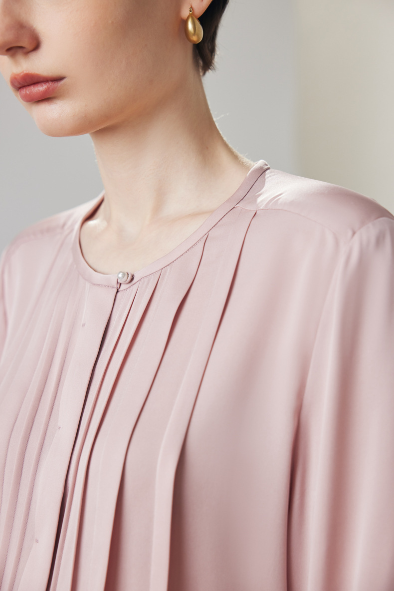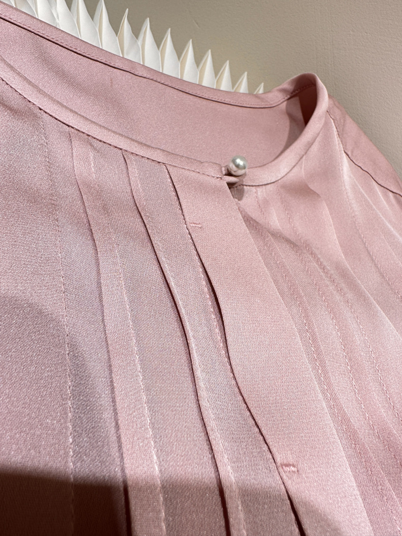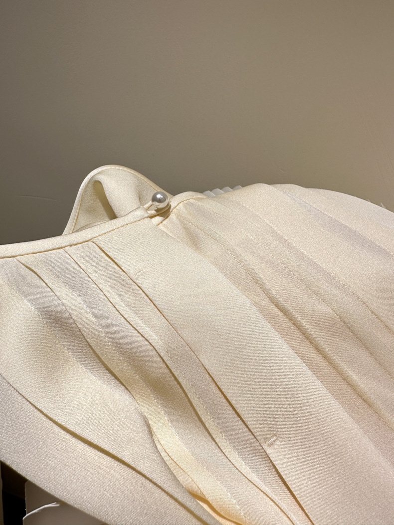 简洁圆领设计加一颗珍珠扣,圆润修饰脖颈袖长,白月光般高雅。利落压褶剪裁,法式优雅。
