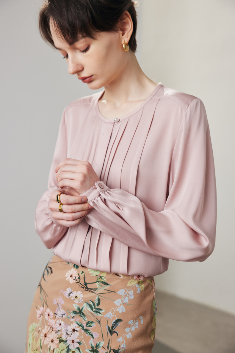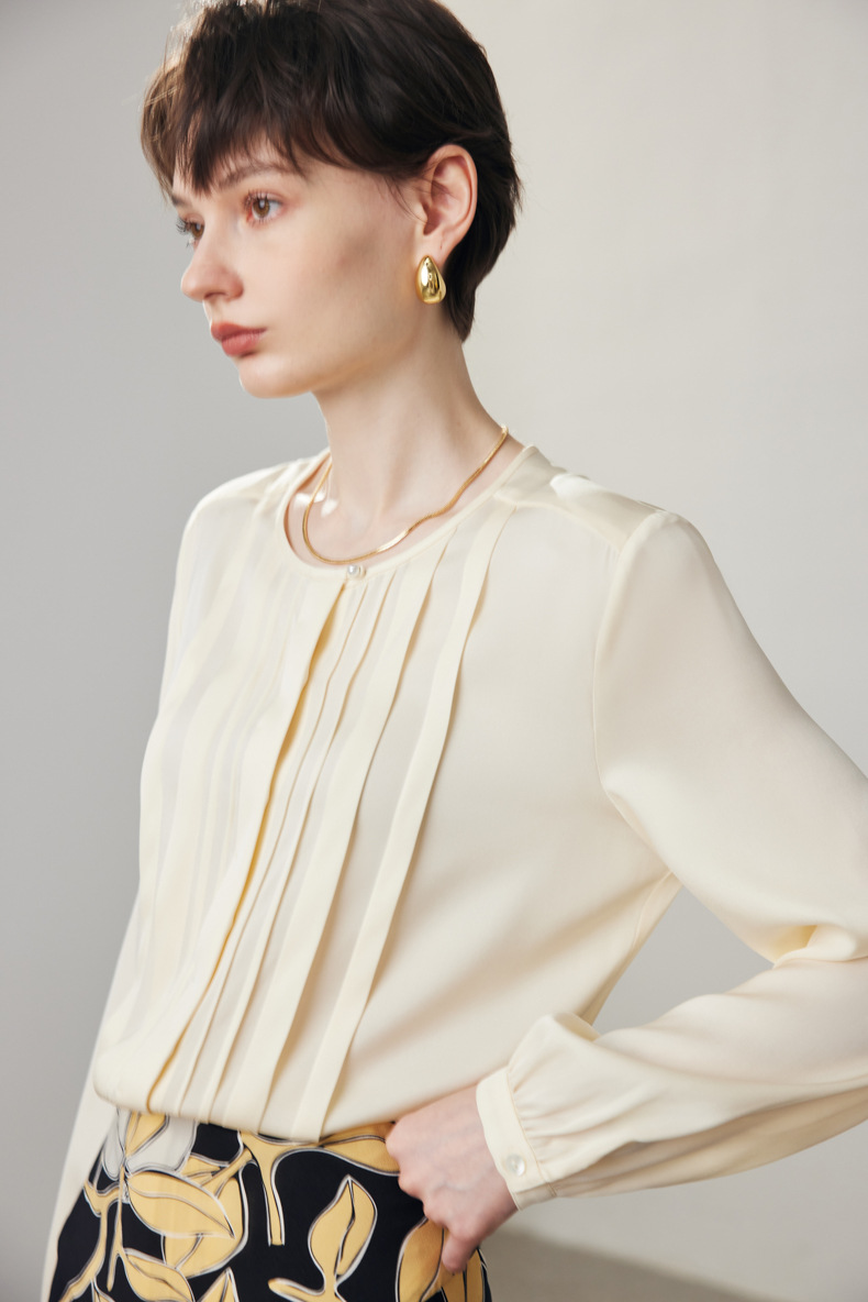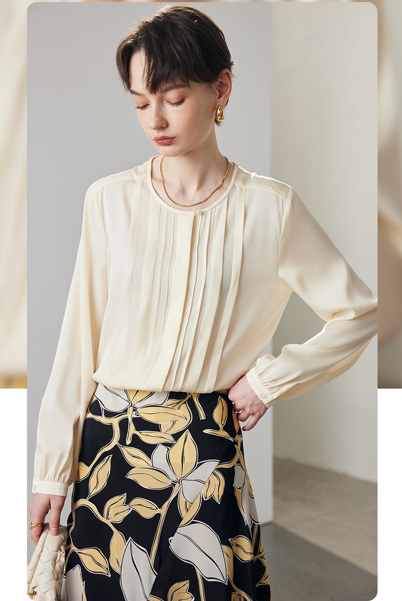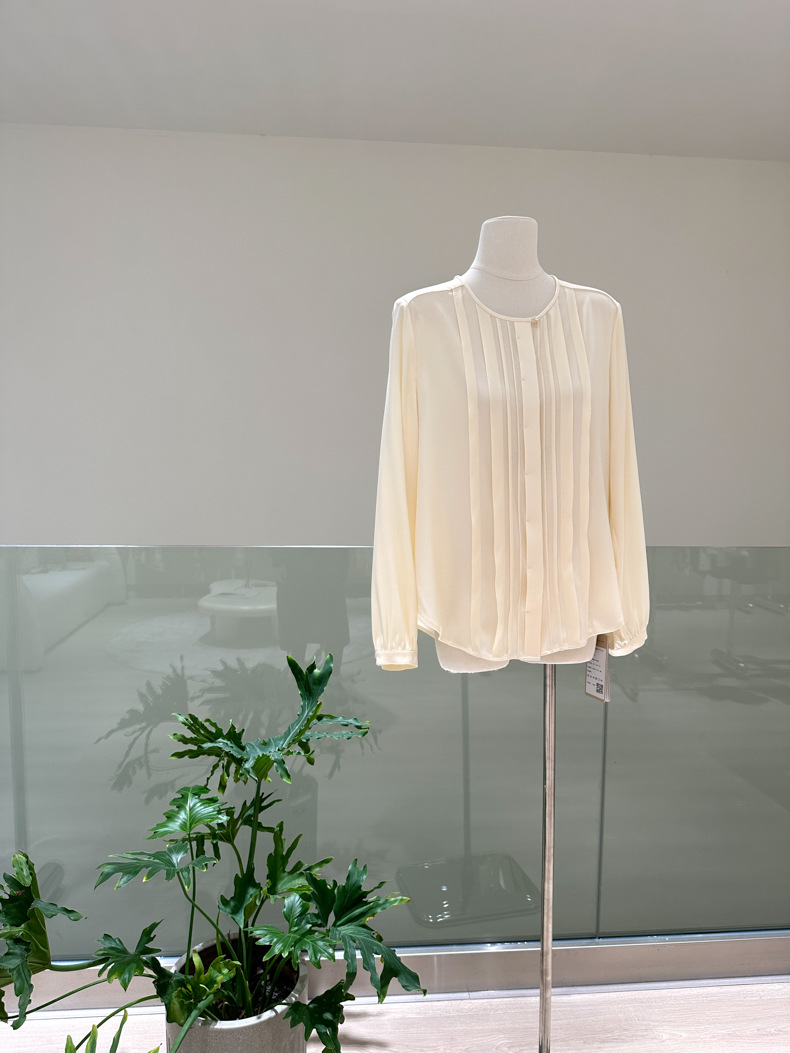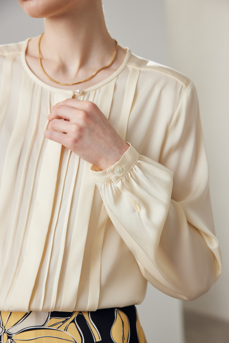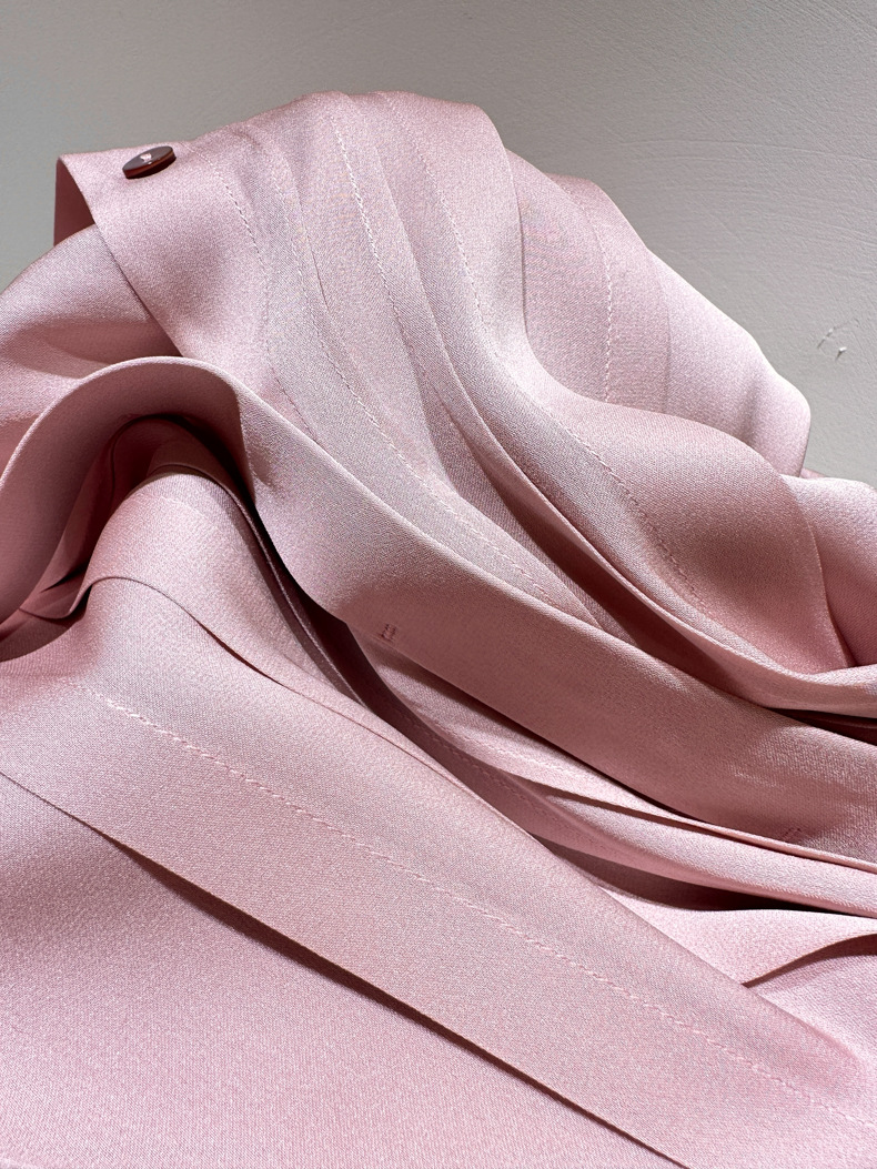 简洁圆领设计加一颗珍珠扣,圆润修饰脖颈袖长,白月光般高雅。利落压褶剪裁,法式优雅。