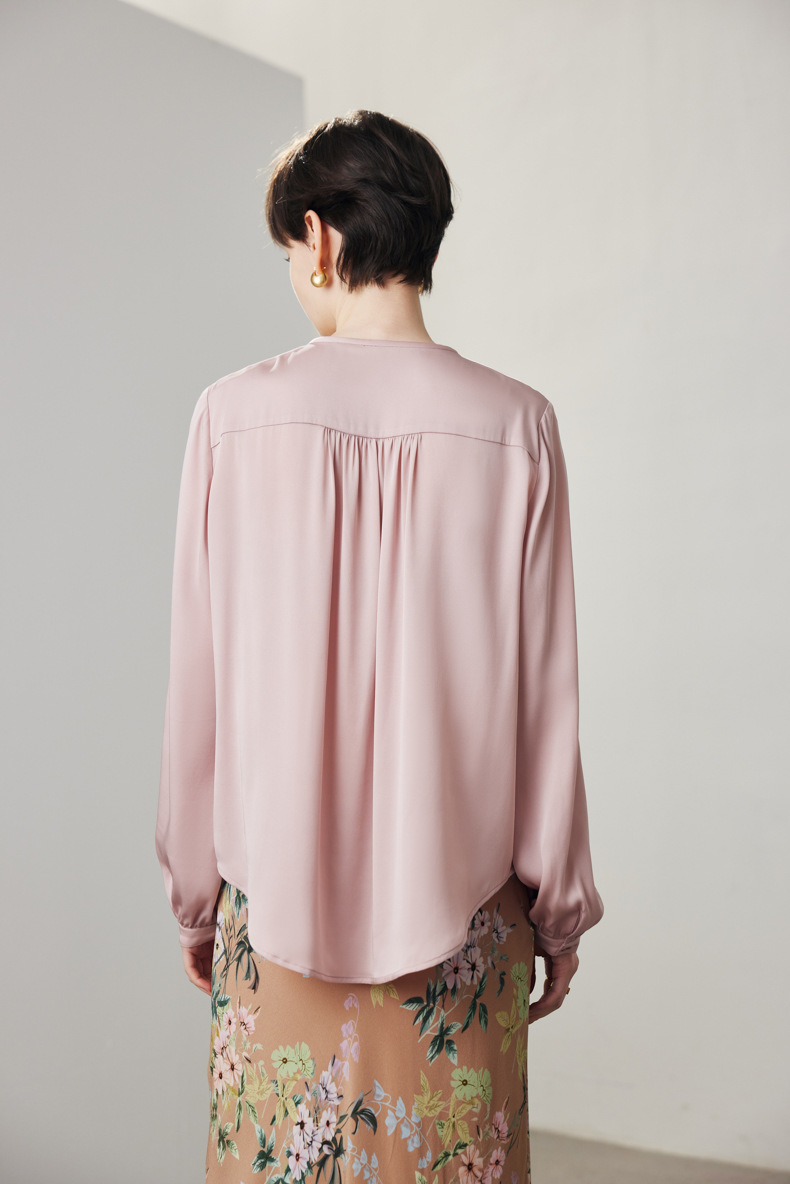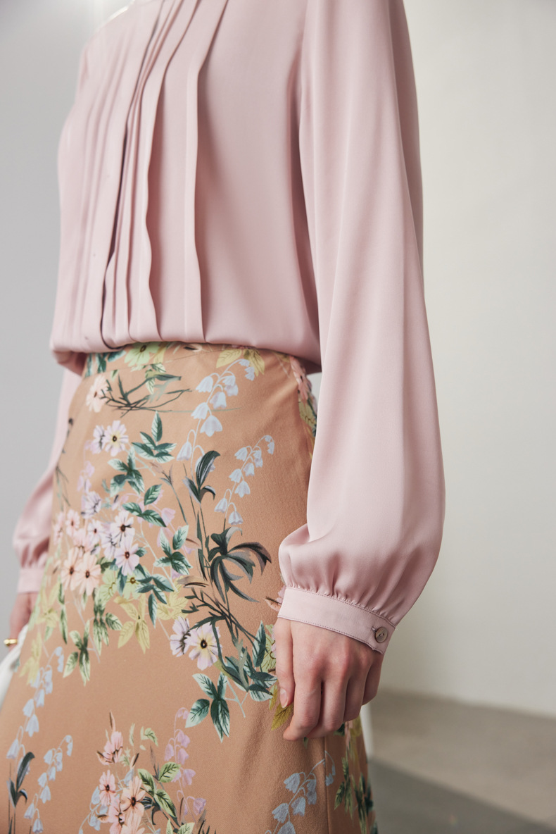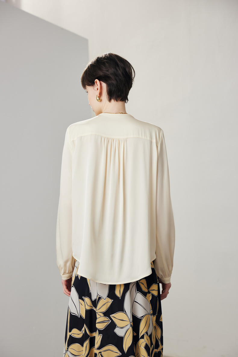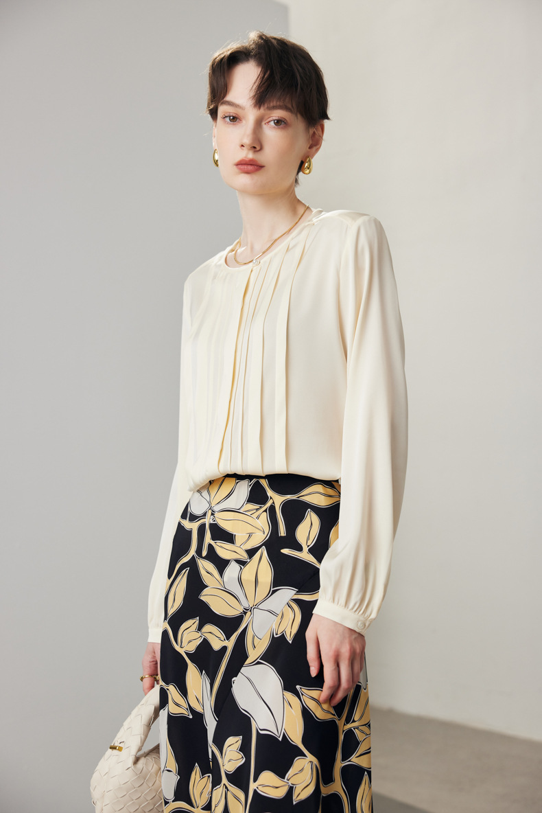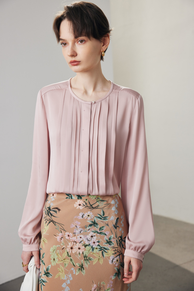 简洁圆领设计加一颗珍珠扣,圆润修饰脖颈袖长,白月光般高雅。利落压褶剪裁,法式优雅。
