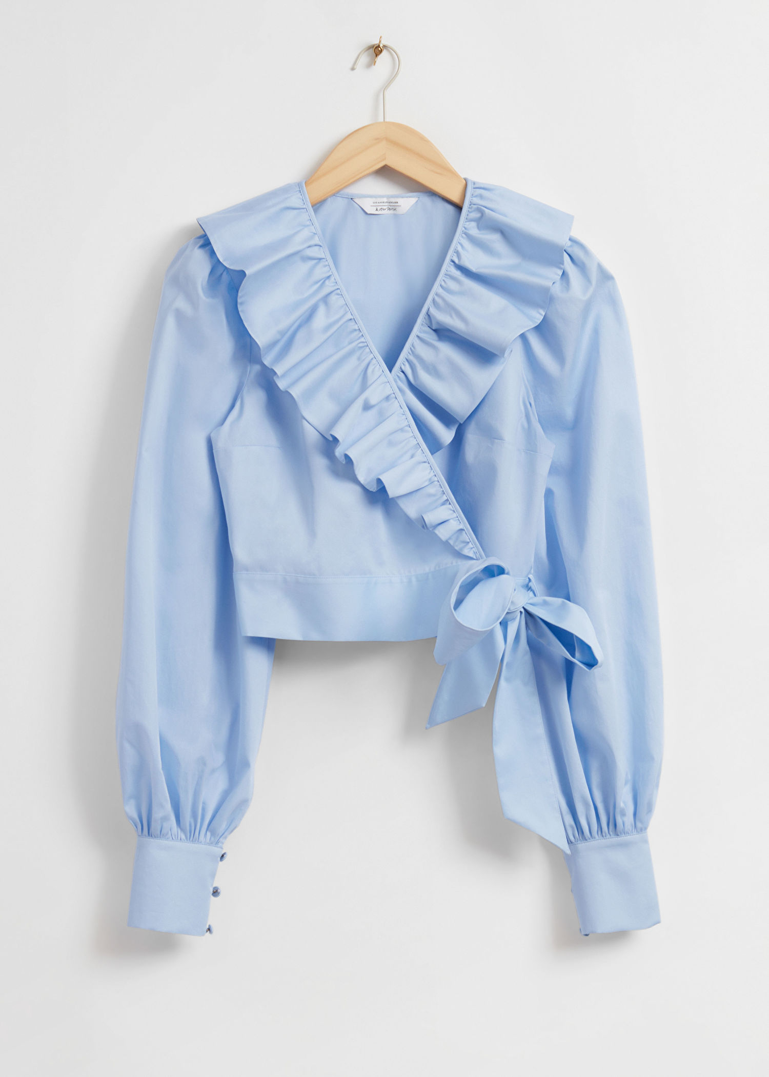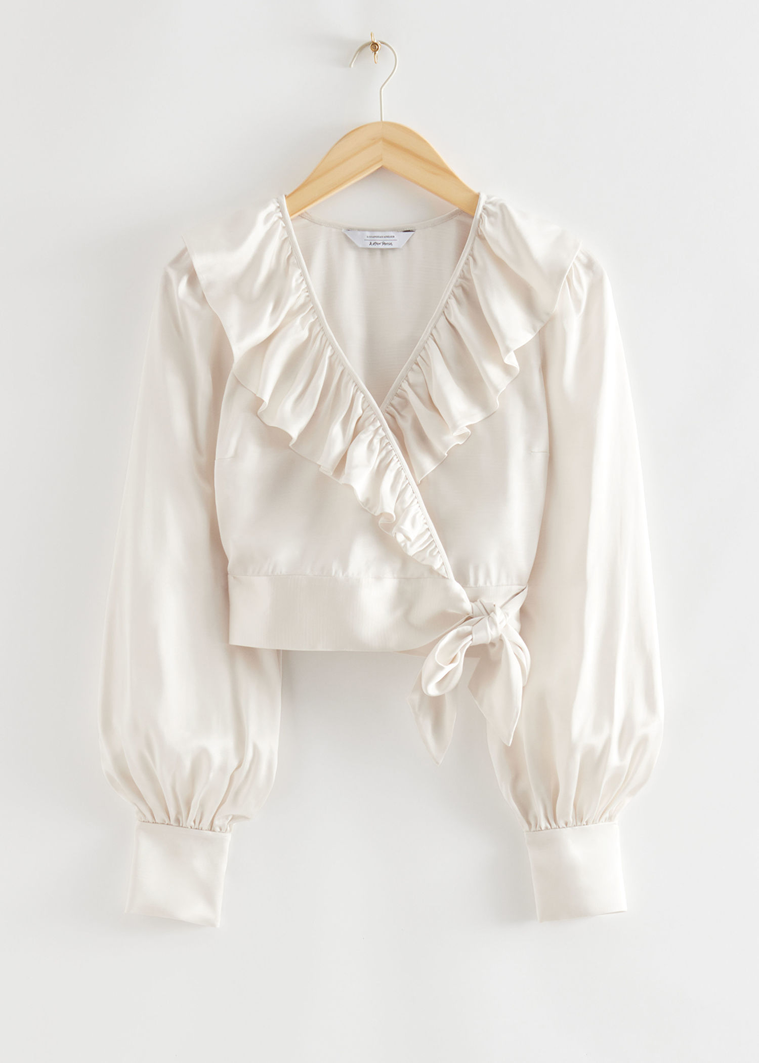 衬衫是设计成低肩领的裹胸式款式,采用女性化的风格,面料为缎面。衬衫的剪裁较为贴身,具有蝴蝶结式的领口,以及配腰带通扣的自结束口和钮扣式袖口。产品有多种尺码可选,但库存有限。