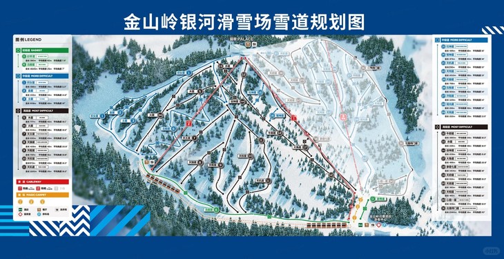 规划建设31条雪道,主峰海拔1750米,雪道最大落差可达650米,规划建设31条雪道,总长度约60公里,雪道总面积约160万平米;7条国际国内先进索道,可同时容纳2万人,雪场品质位居亚洲前列。今年雪季,金山岭银河滑雪场雪道分布更清晰,新增地形公园区、进阶练习区、道内刻滑区、趣味技巧区、高级练习区、入门练习区,清晰划分雪场布局,趣味性与专业性能充分满足,让滑雪体验更舒适。