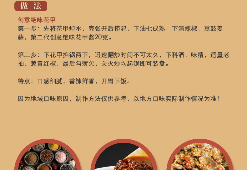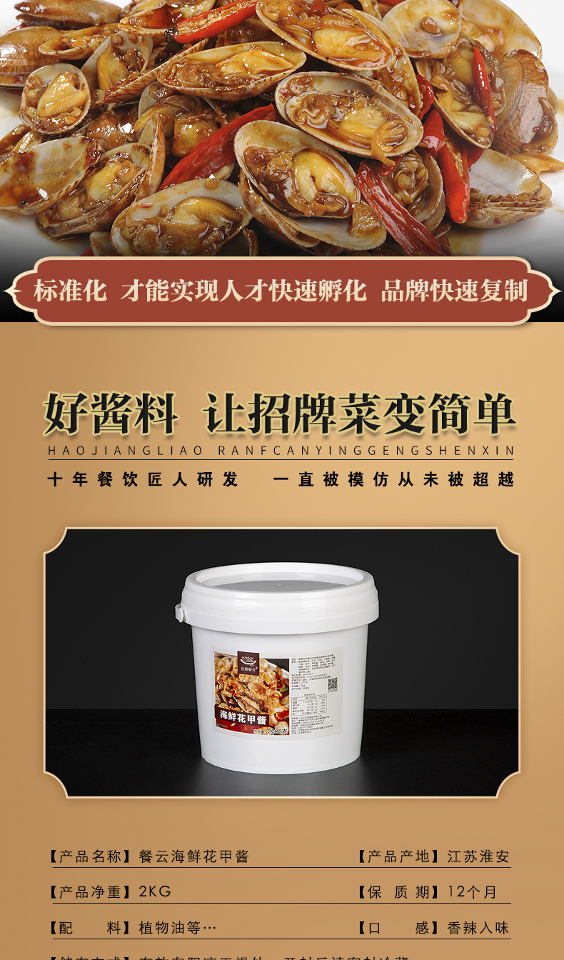 创意海鲜花甲酱:由创意餐云产品研发团队协同5名湘菜主厨,历时60天,通过对传统的开心花甲,口味花甲,锡纸花甲等花甲系列产品进行深入研究,结合当今客户群体口味走向,打造了一种全新的复合味道,让消费者味觉欲罢不能。