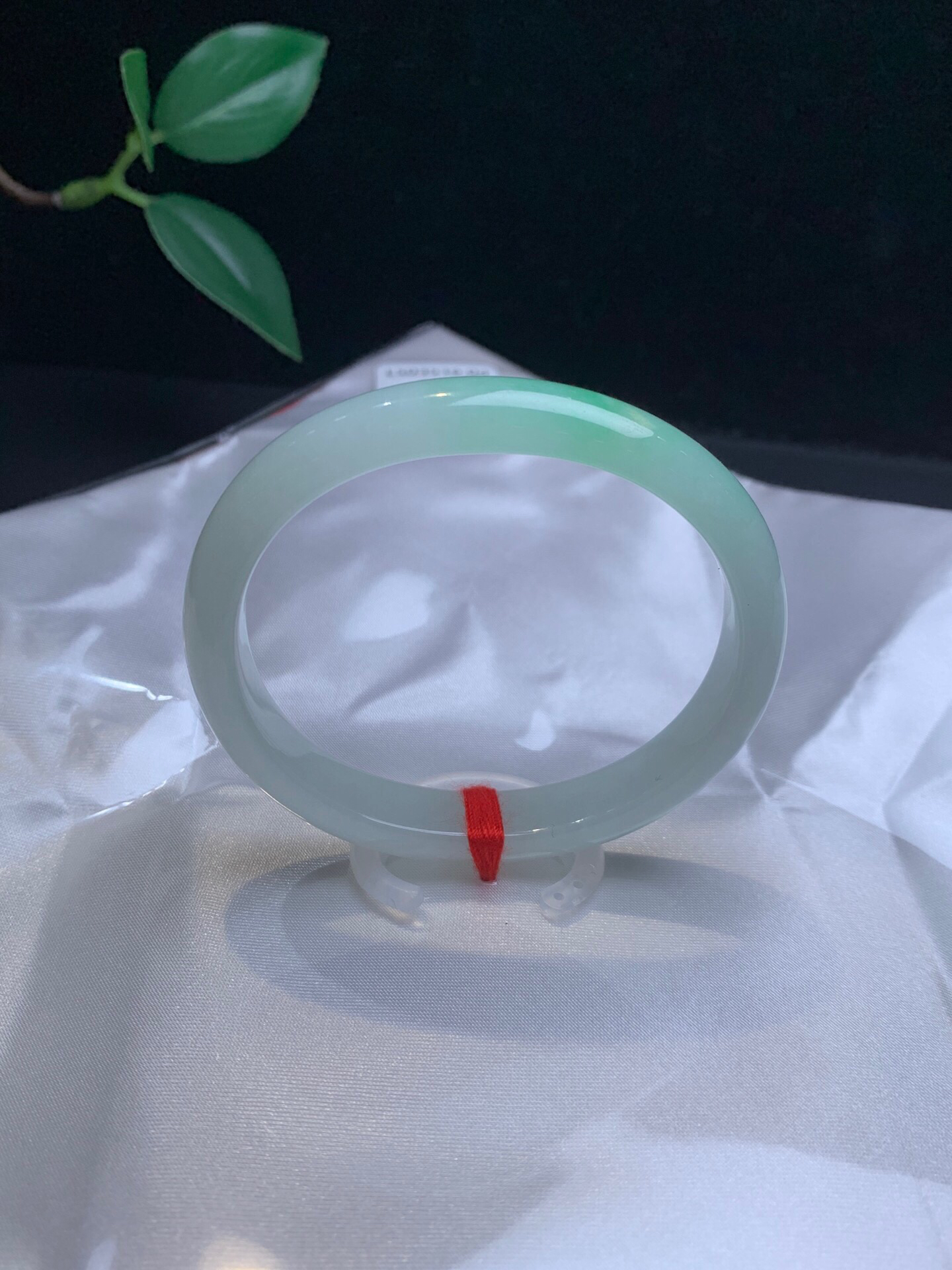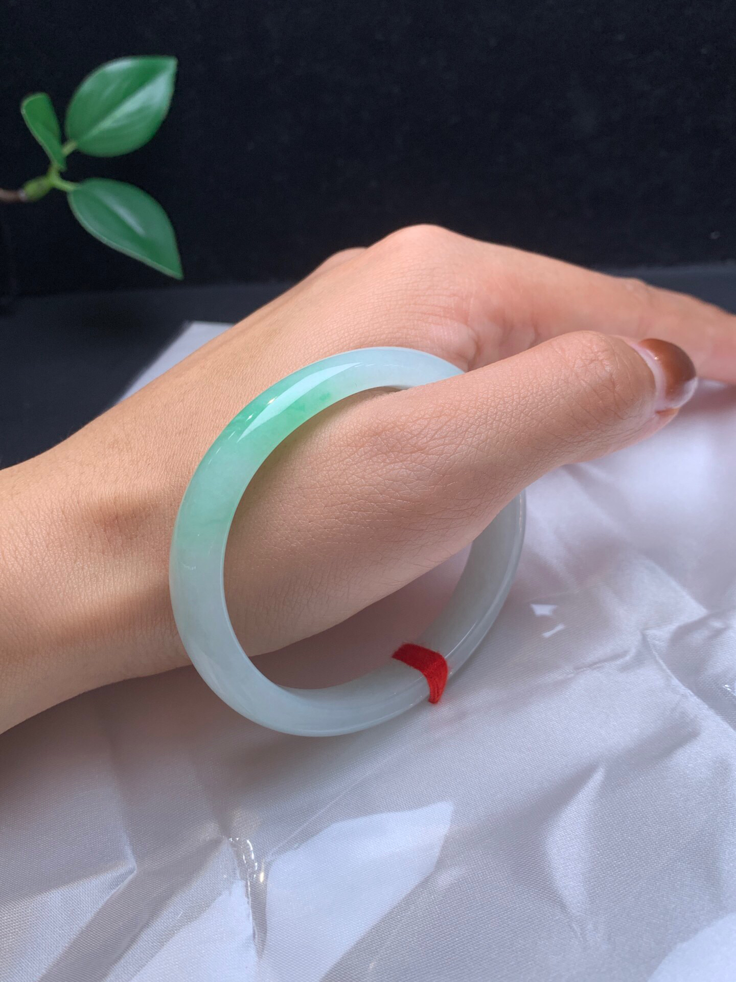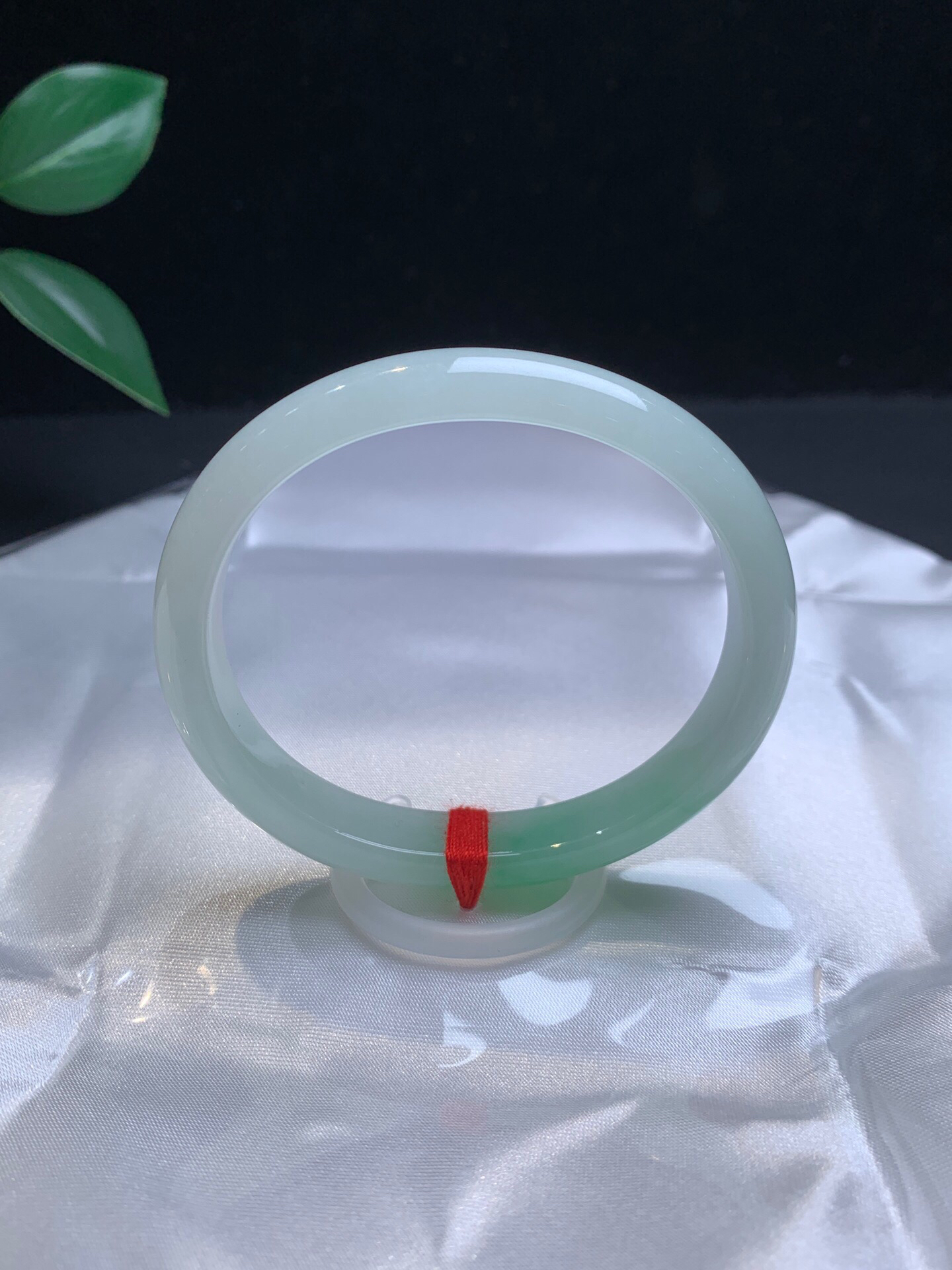 612443,52.4冰飘绿贵妃镯,尺寸9.9-6.2mm。温润细腻水润底妆清澈淡淡的晴绿底色,秀气十足