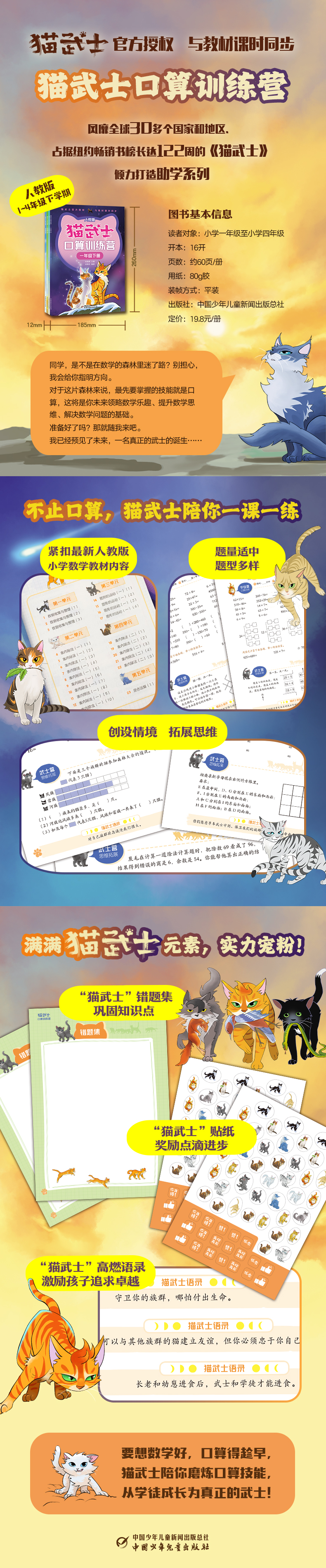 口算、速算能力是孩子必备的基本功,需要有目的、有计划、有步骤地进行教学和训练。本书是结合“猫武士”IP,专为小学生开发的口算类助学衍生书。本书在多做多练的基础上,设计活泼、生动、多样化的练习形式,让孩子体会口算速算能力对于日常生活的重要性。在内容上按照难度拆分等级,帮助孩子在口算过程中累积成长指数,提升口算战斗力!