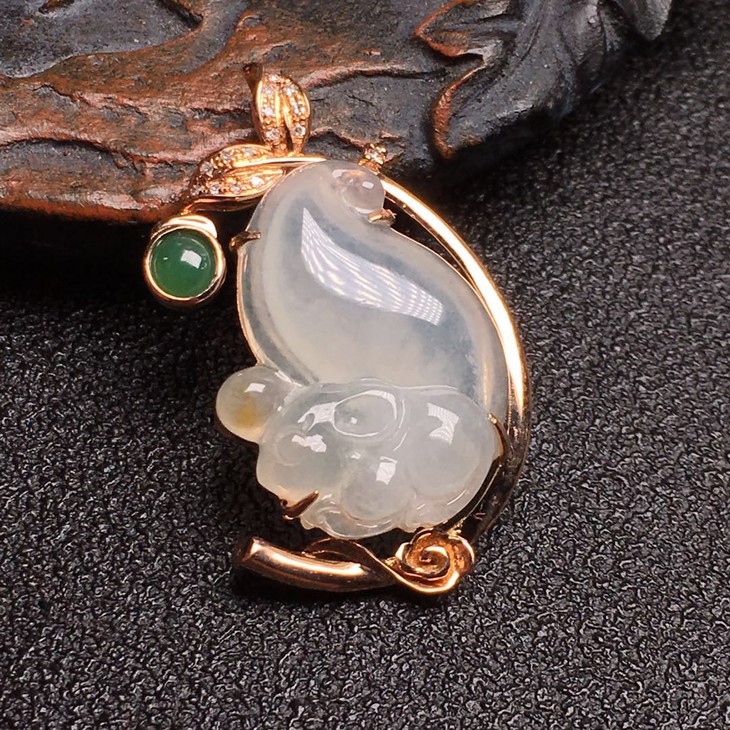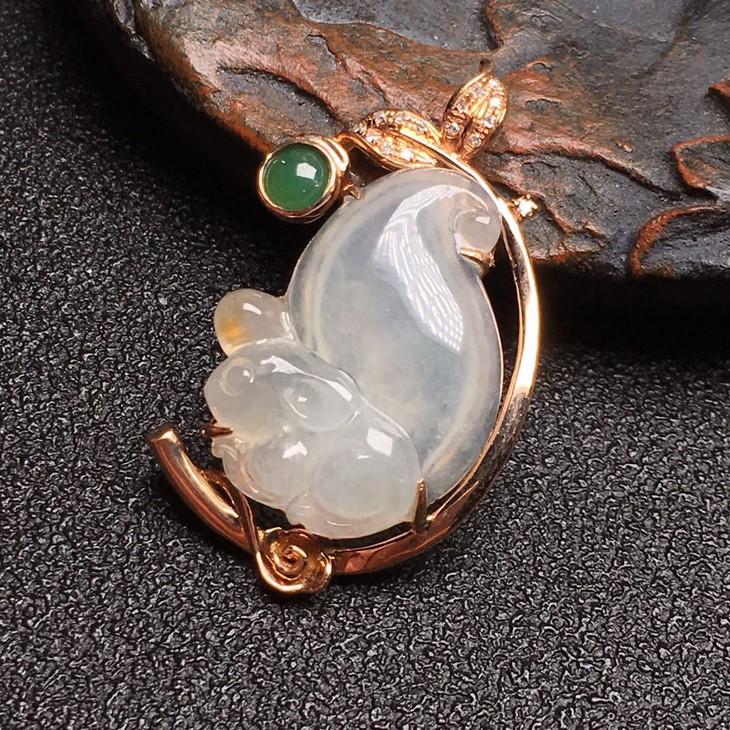 【D61373】翡翠冰种小松鼠,温润细腻,种水充足,18K镶嵌,松鼠精灵可爱,佩戴寓意聪明伶俐。裸石尺寸:21.6*16.2*3mm,特价1800