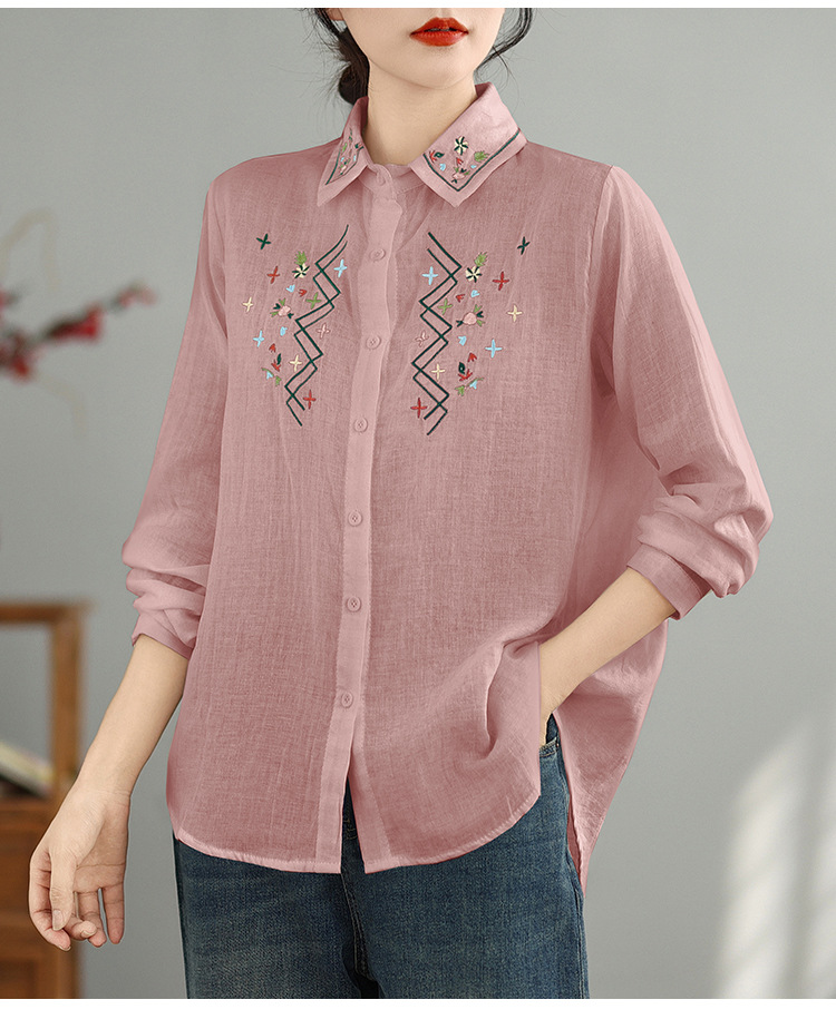AHM wyss6982碎花刺绣勾花双层纱衬衫时尚翻领宽松上衣