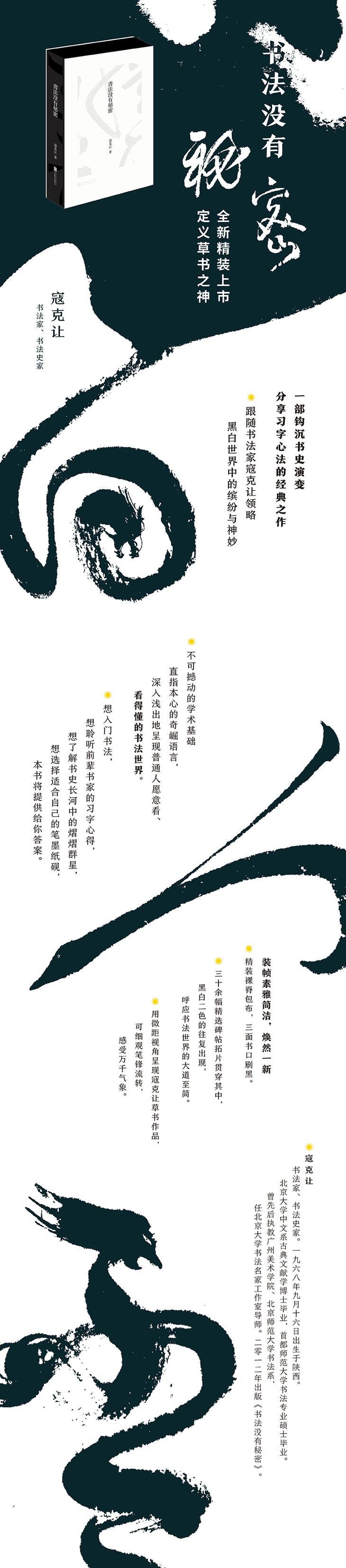 《书法没有秘密》以凝练真诚的文字,系统讲述了书法世界中少人提及,但却可以为多数读书人看清楚、听明白的人和事。文风奇崛,读之荡气回肠,令人大呼过瘾。全书共分八章,开篇为书法正名,名正则言顺,让人立刻了解所谈究竟为何物;其后是习字通规、临摹方法、碑帖流派,以及笔墨纸砚的选择要旨,分享作为书法家由临摹走向自由书写的心得与经验,和欲善其事的器用准备;*后,以书法史家的视角钩沉书史演变,新版着重探索唐以前(寇克让先生称之为书法古典期)的故人故事,特别是关于“草书之神”张旭的定位石破天惊,堪为寇先生近年研习书法与研读文献的心血结晶。这是寇克让先生关于书法战略的一次文字努力,也是一次由习字心法向人生思考升华的尝试,为读者提供一席丰沛灿烂的精神盛宴。