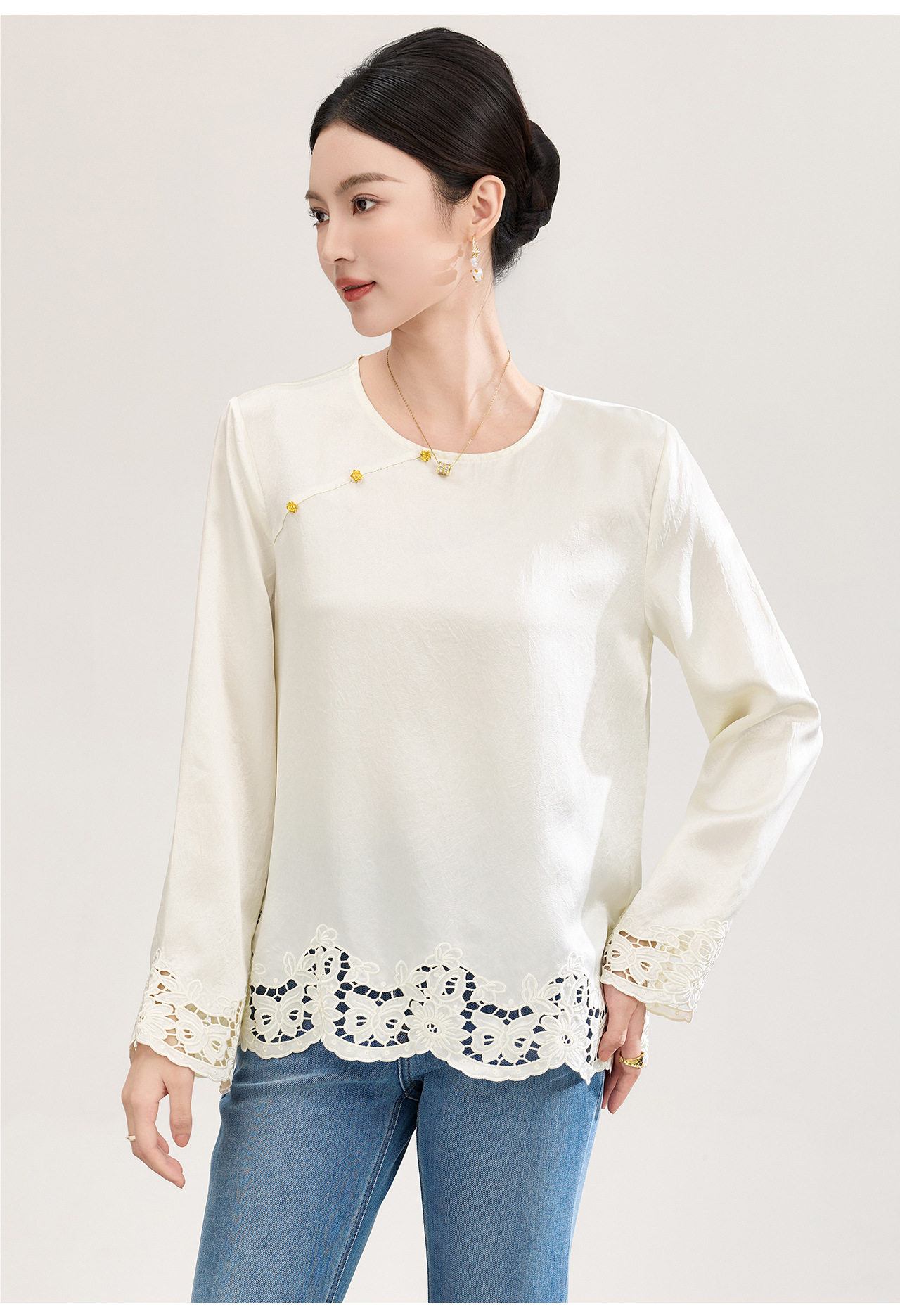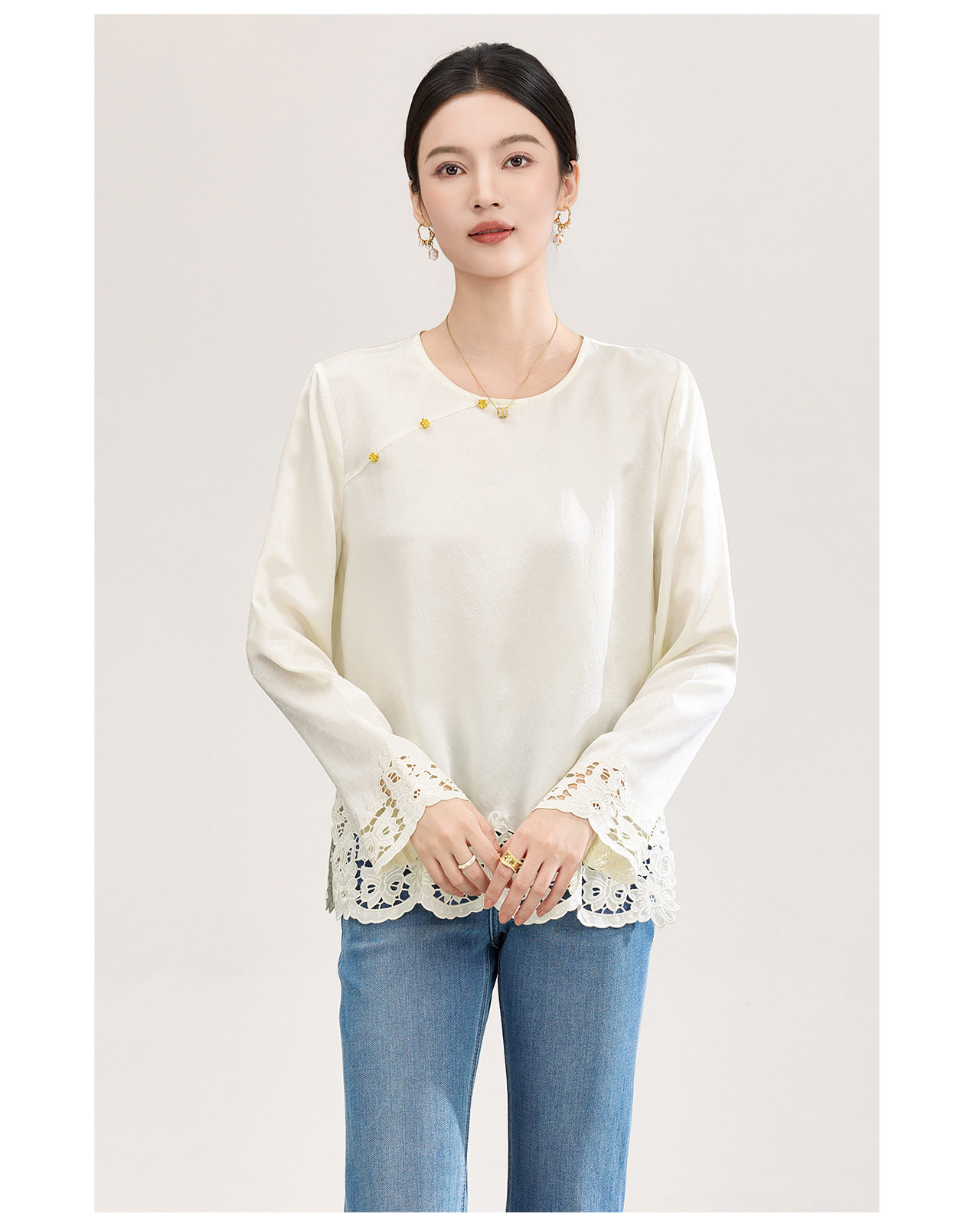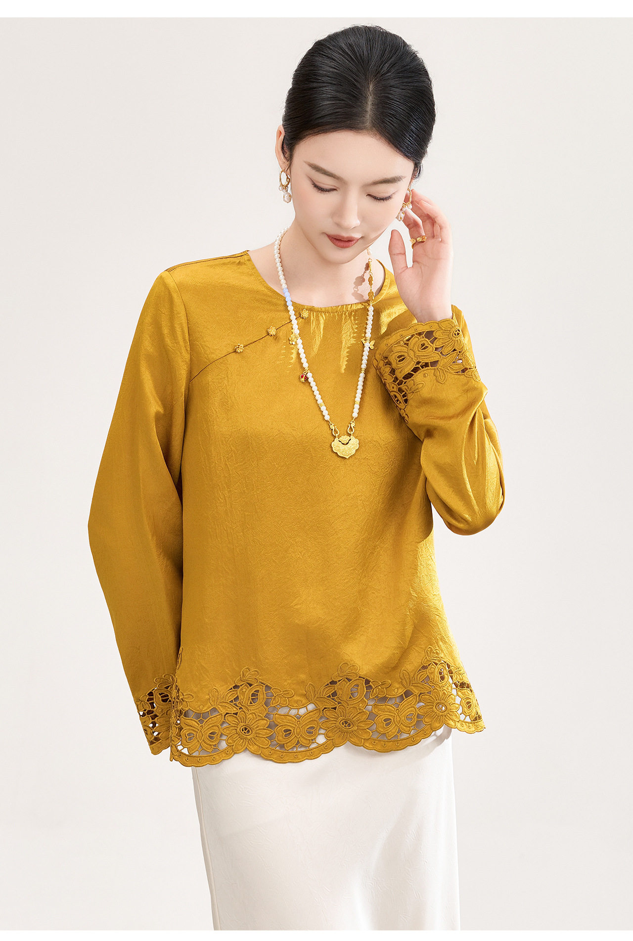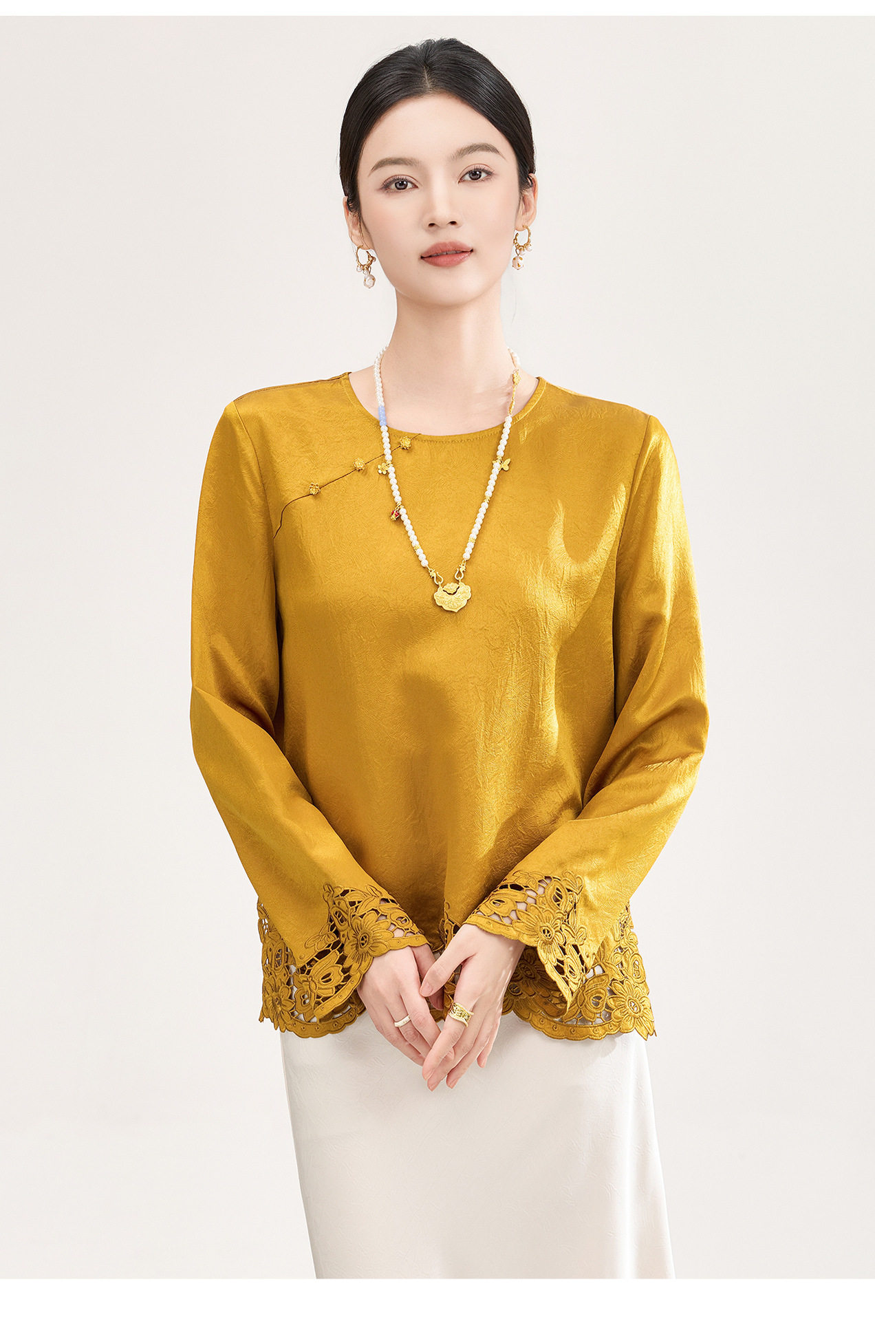 「高货wl」全新升级【铂金会员321/天猫429/差价108】(01826洛诗琳复古新中式奢光醋酸缎面衬衫2026春季新款刺绣圆领国风上衣