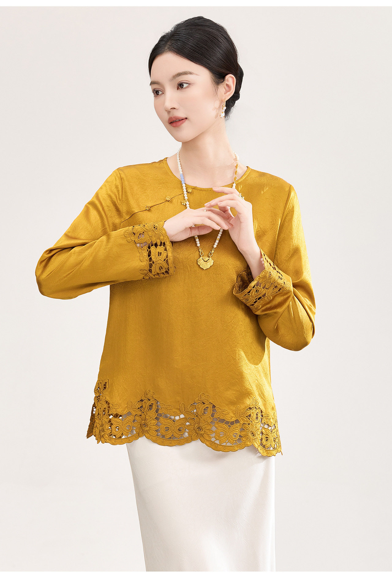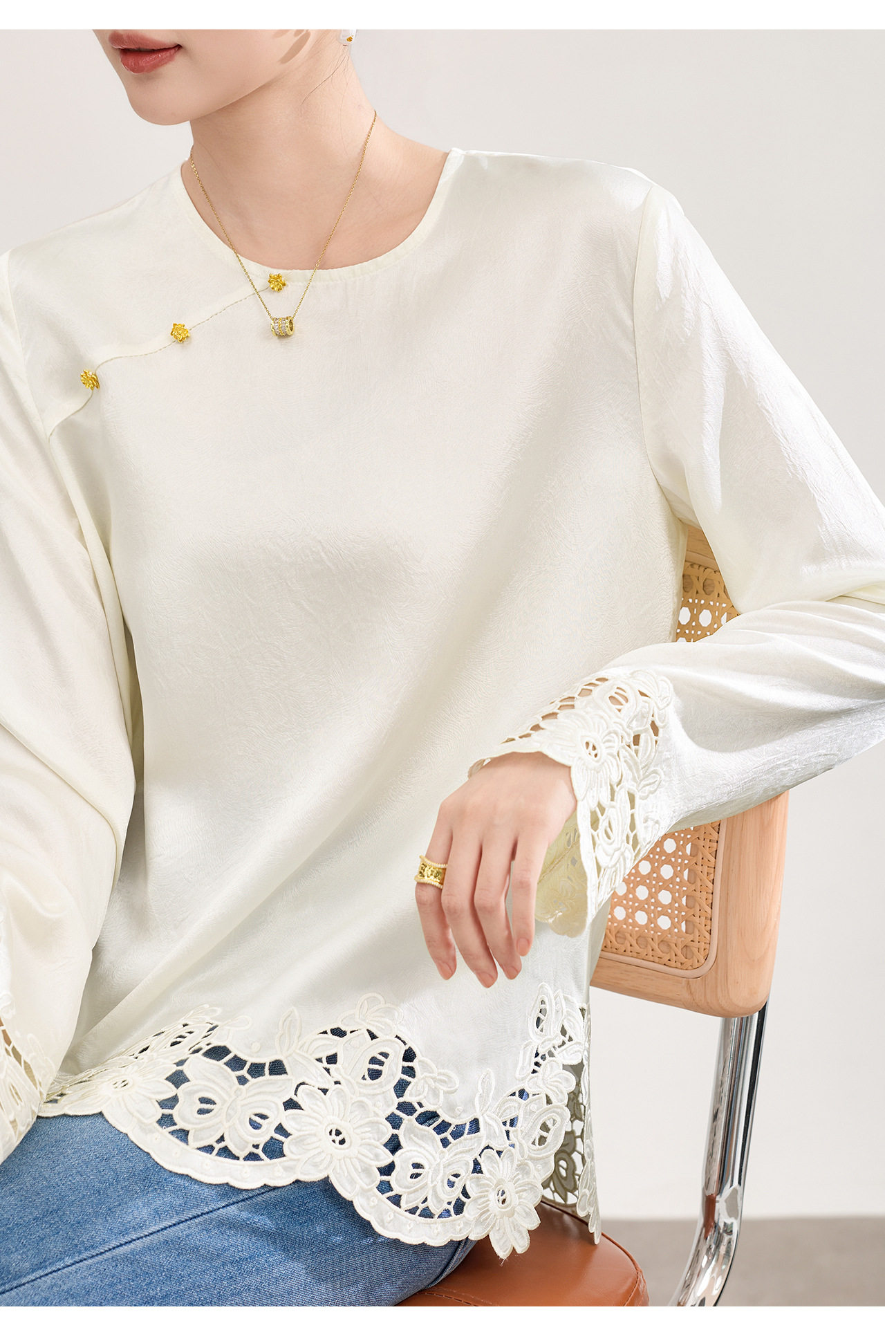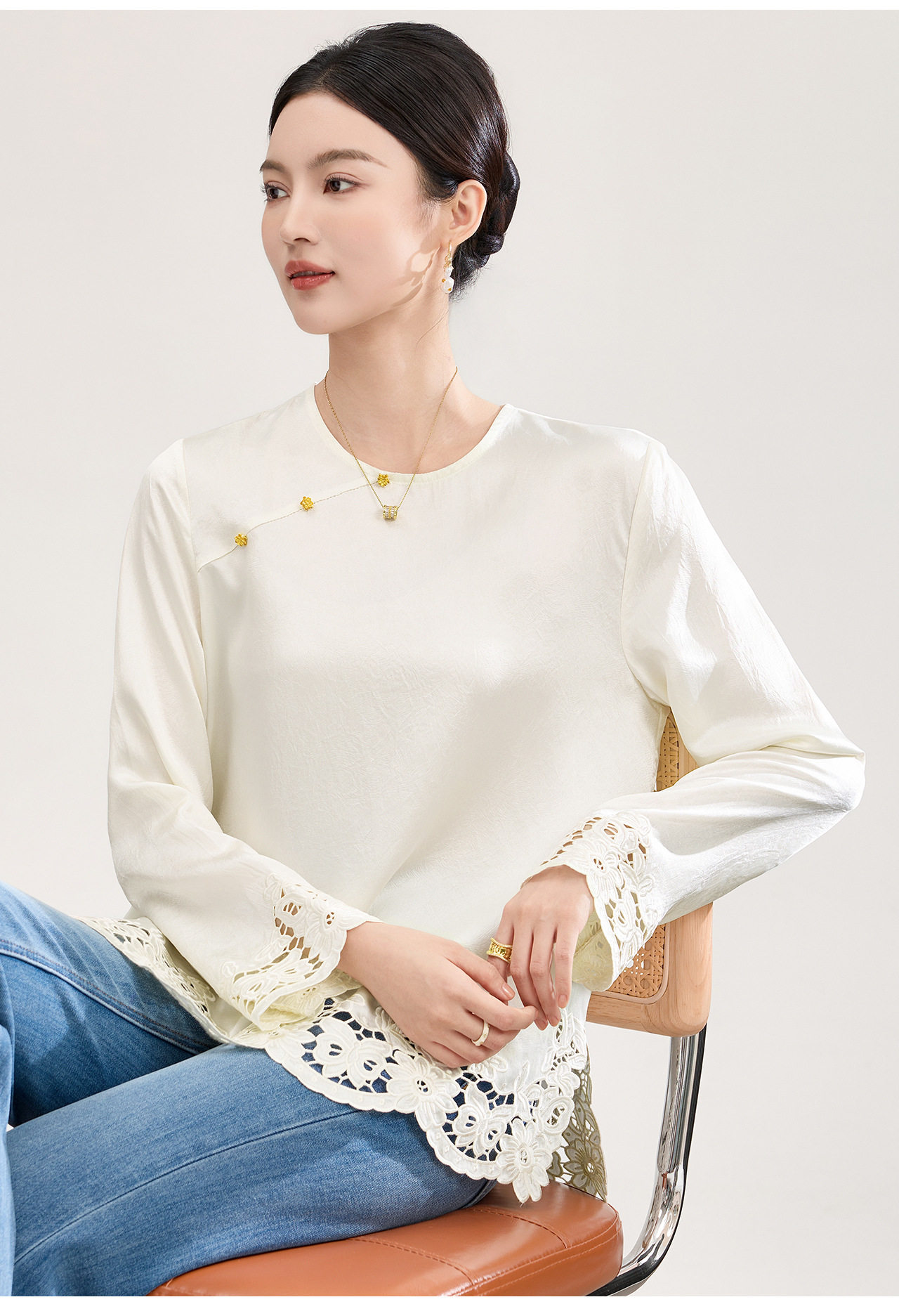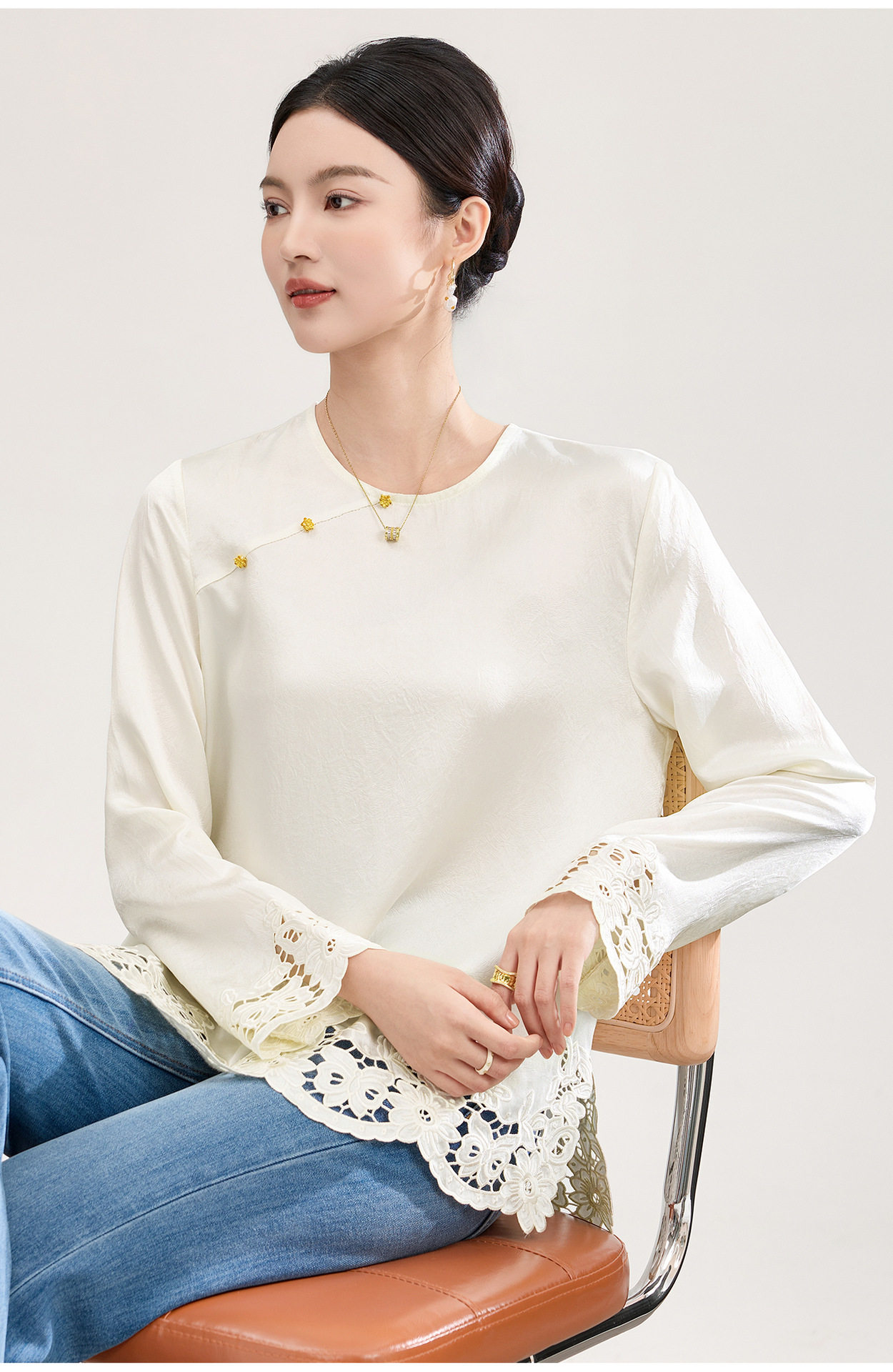 「高货wl」全新升级【铂金会员321/天猫429/差价108】(01826洛诗琳复古新中式奢光醋酸缎面衬衫2026春季新款刺绣圆领国风上衣