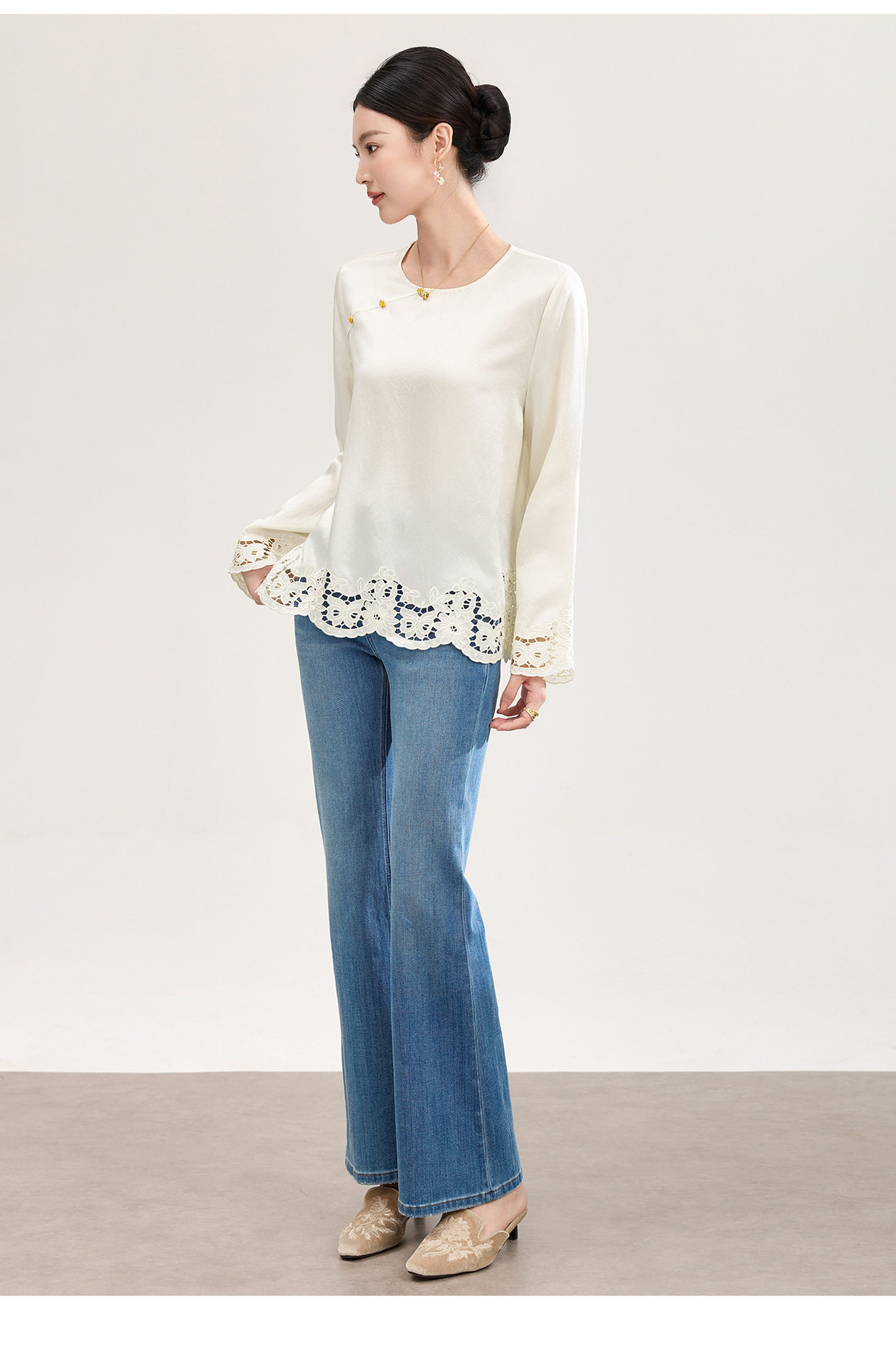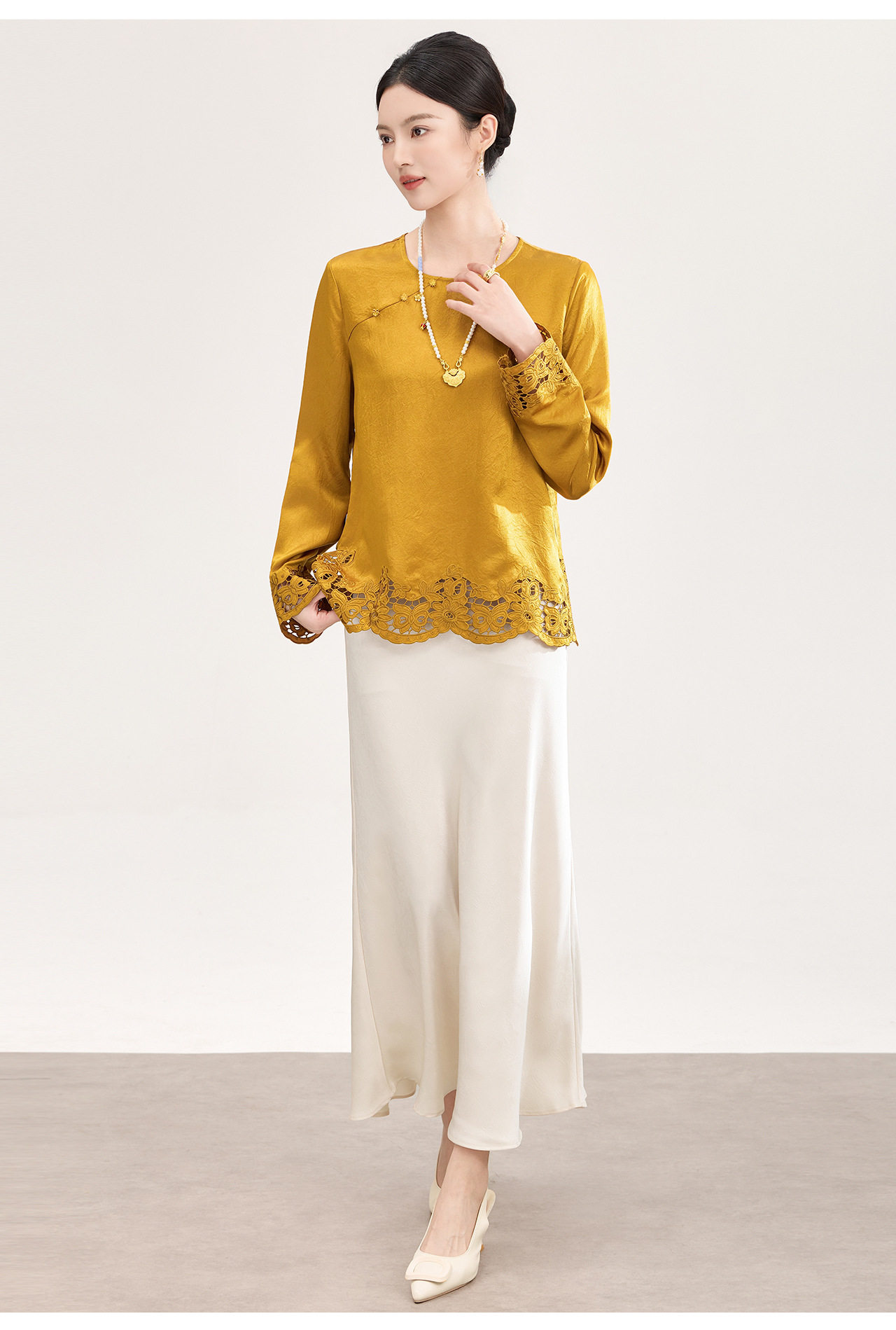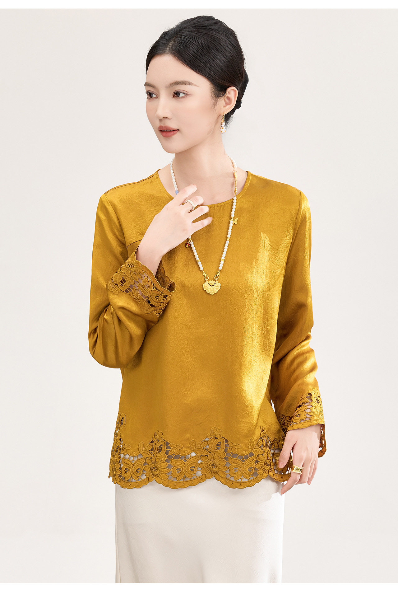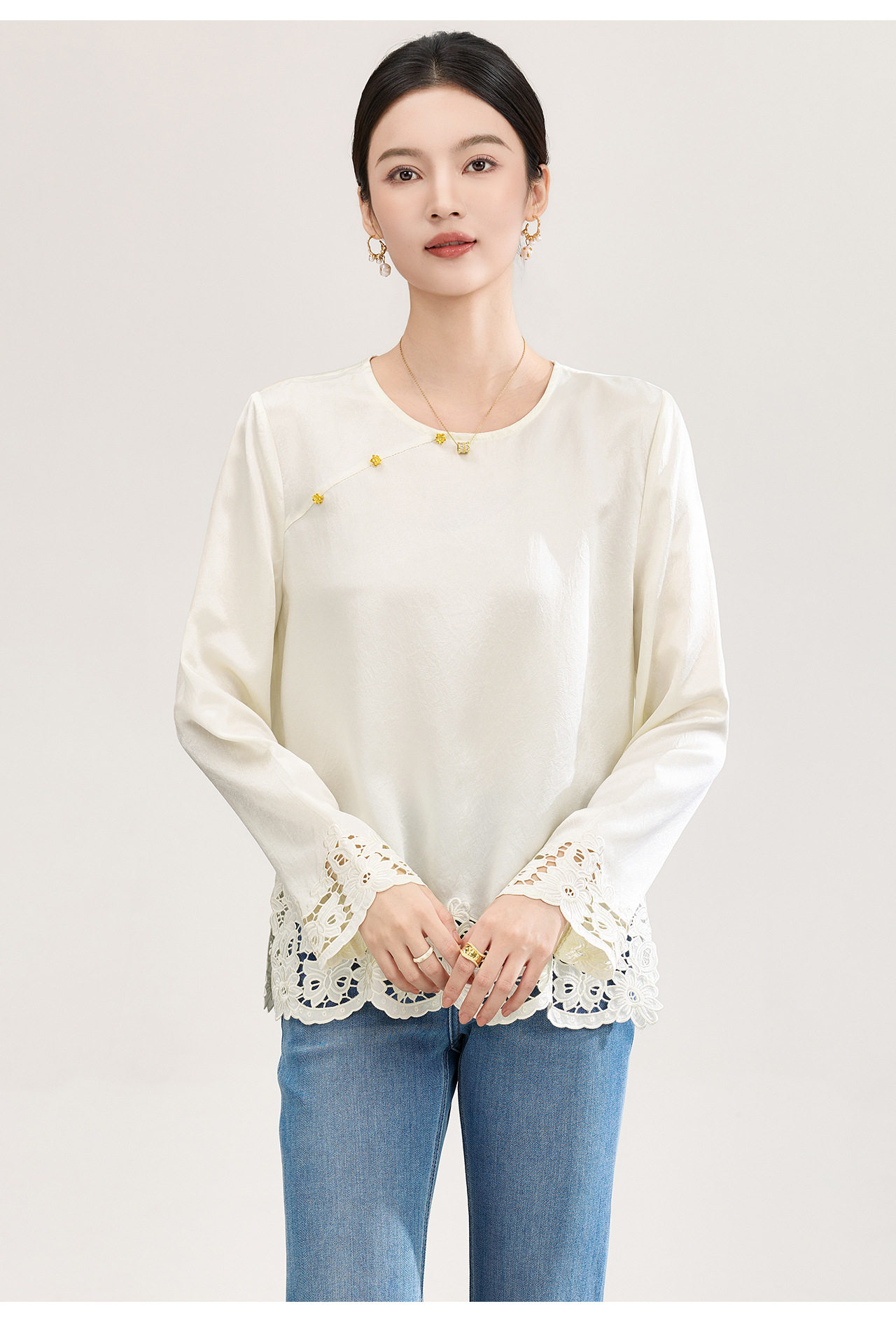 「高货wl」全新升级【铂金会员321/天猫429/差价108】(01826洛诗琳复古新中式奢光醋酸缎面衬衫2026春季新款刺绣圆领国风上衣