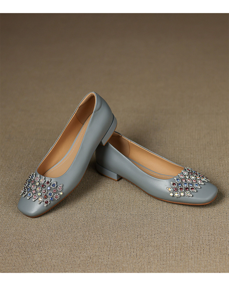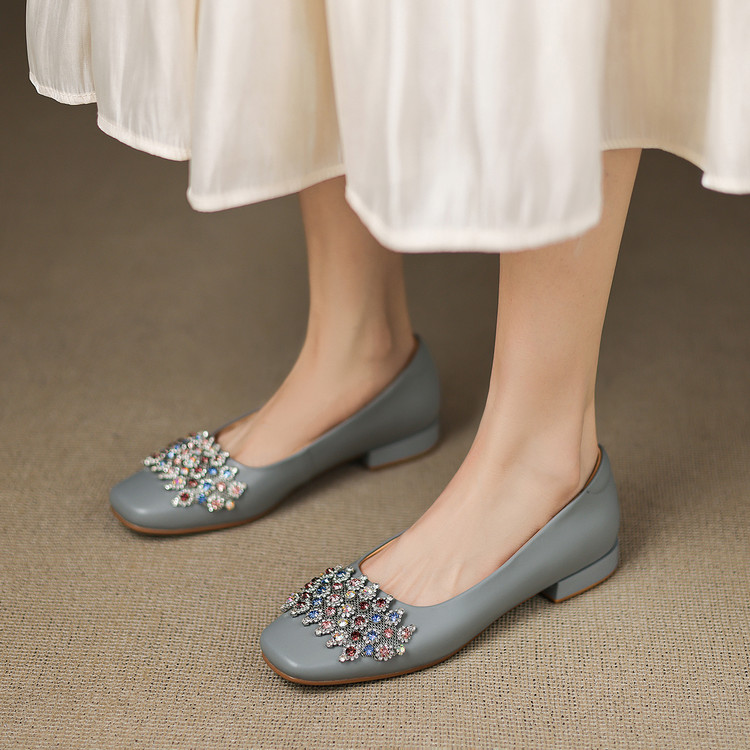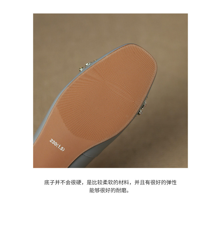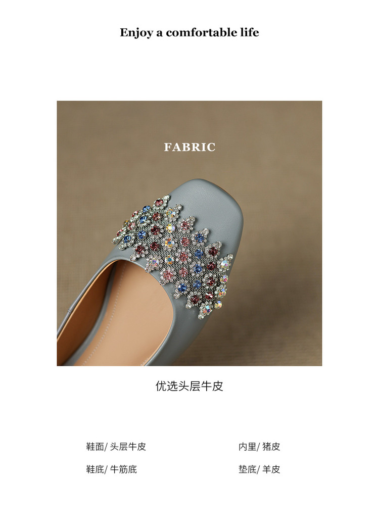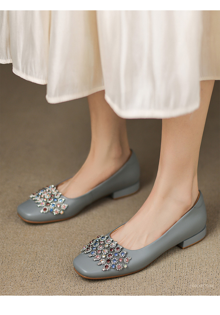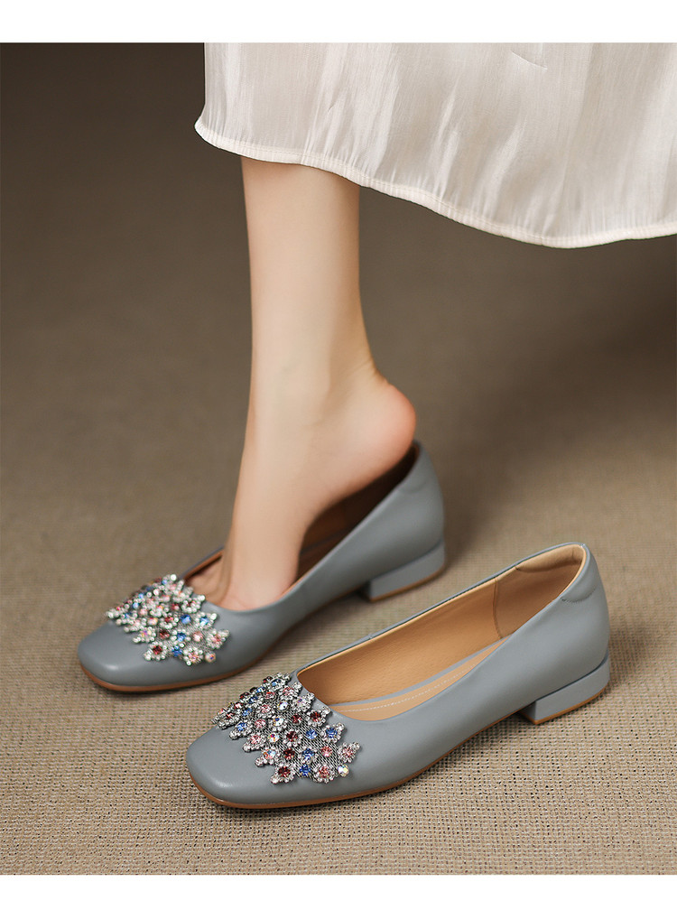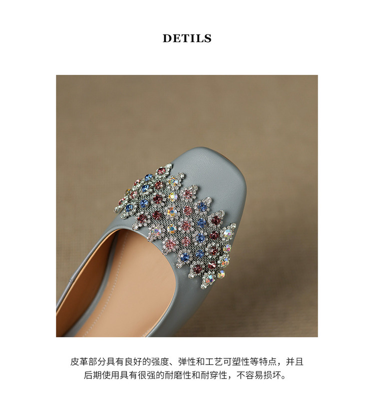 【预售5天】优雅气质法式单鞋女新款水钻方头低跟粗跟真皮灰色通勤瓢鞋ZYY&A1270