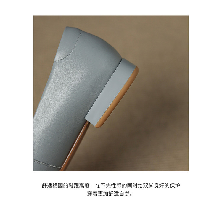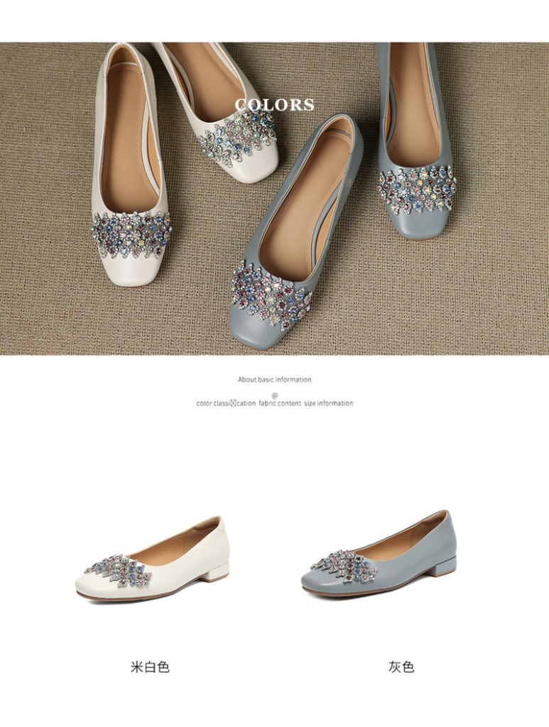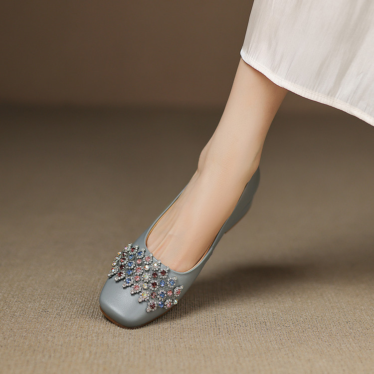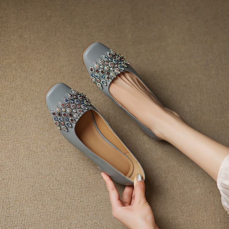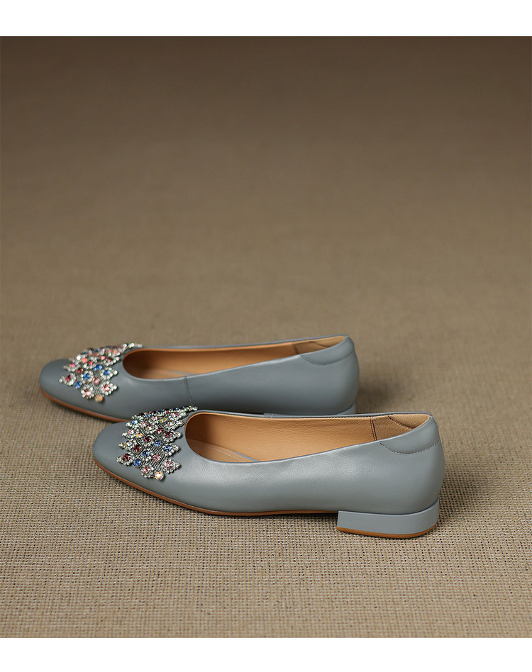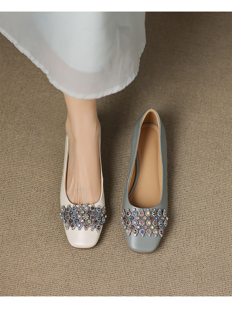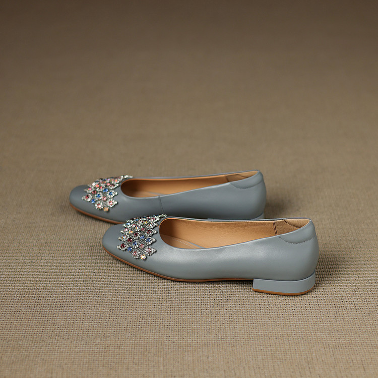 【预售5天】优雅气质法式单鞋女新款水钻方头低跟粗跟真皮灰色通勤瓢鞋ZYY&A1270