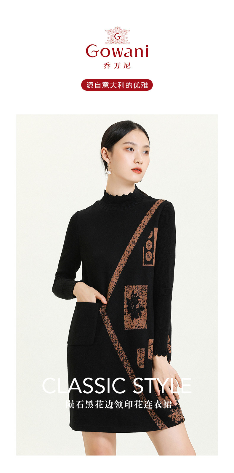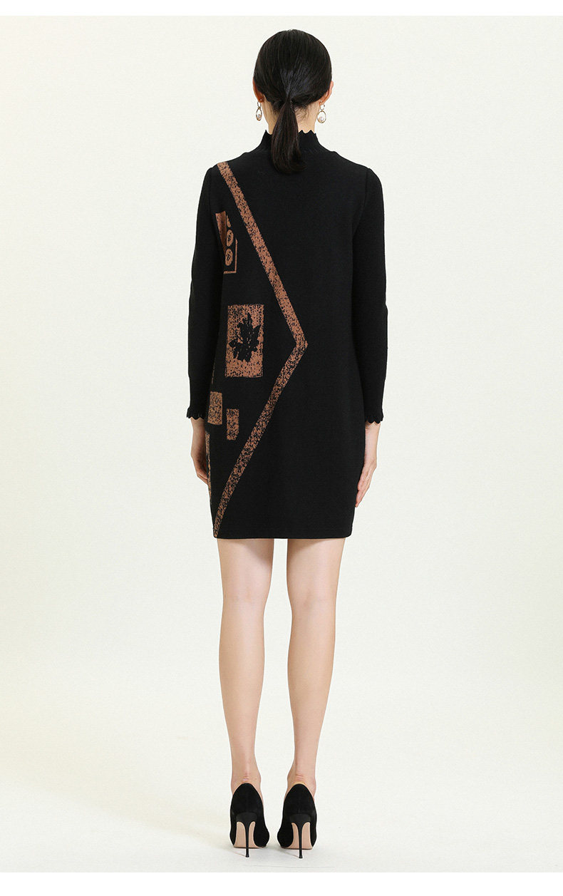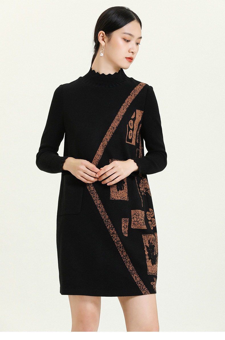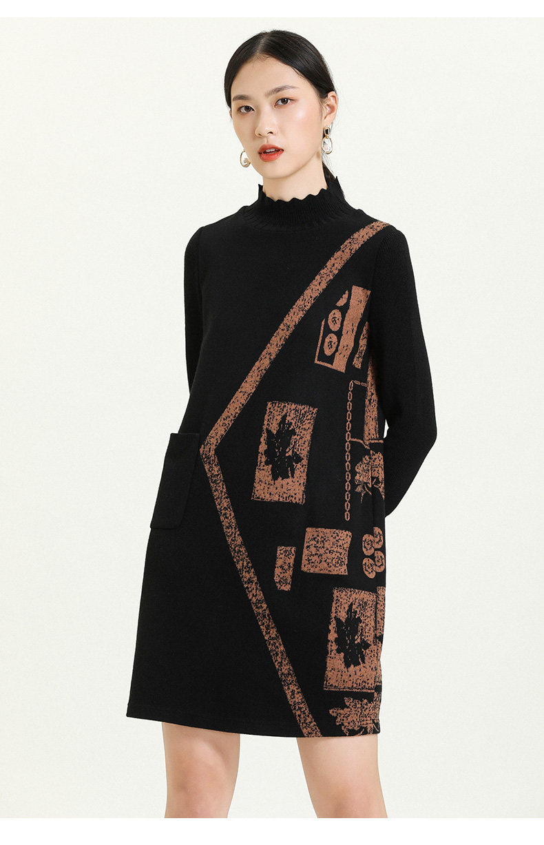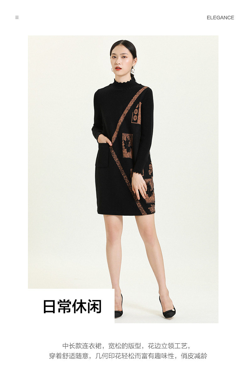 乔万尼秋冬新款花边立领设计几何印花羊毛宽松舒适设计感连衣裙ES4E308