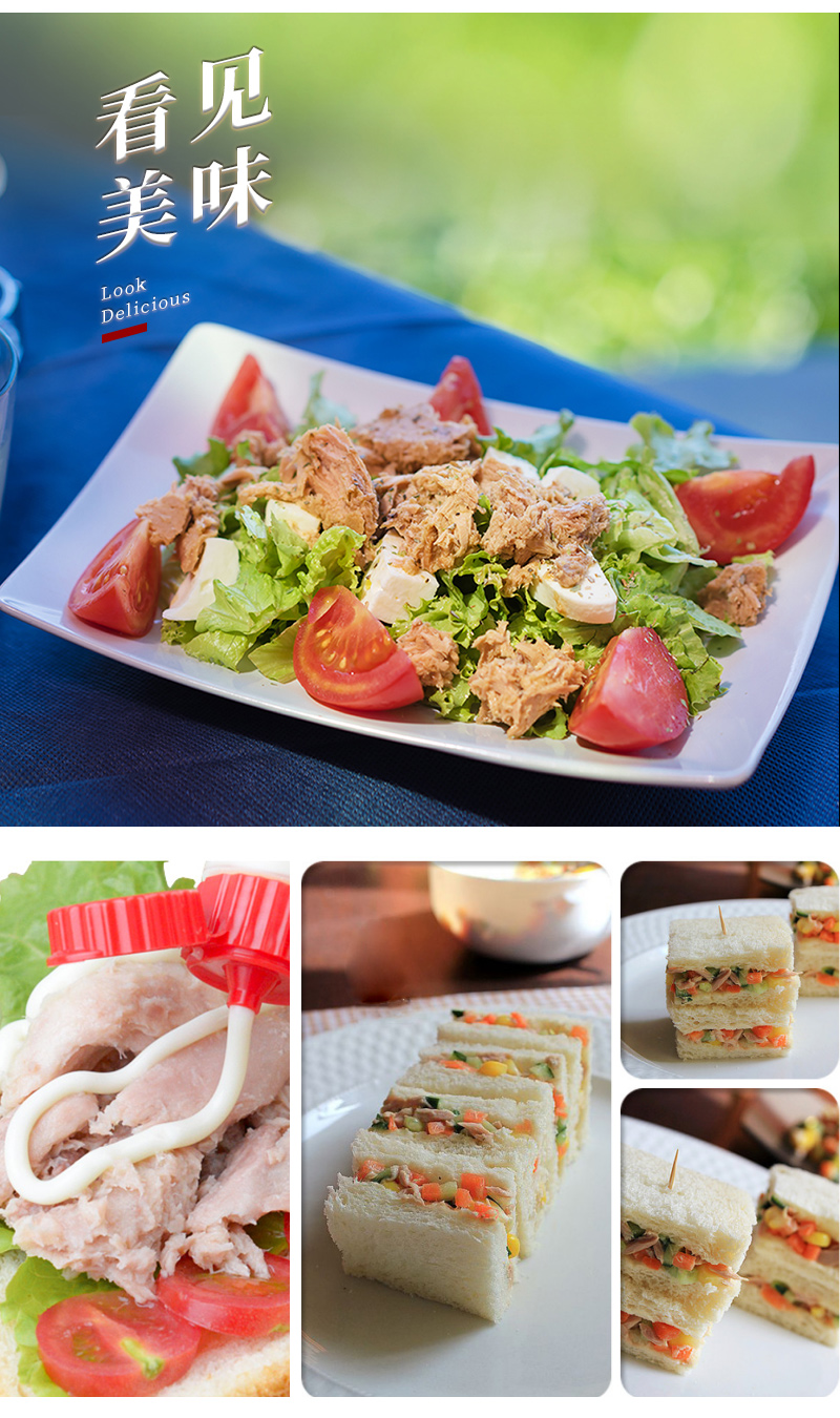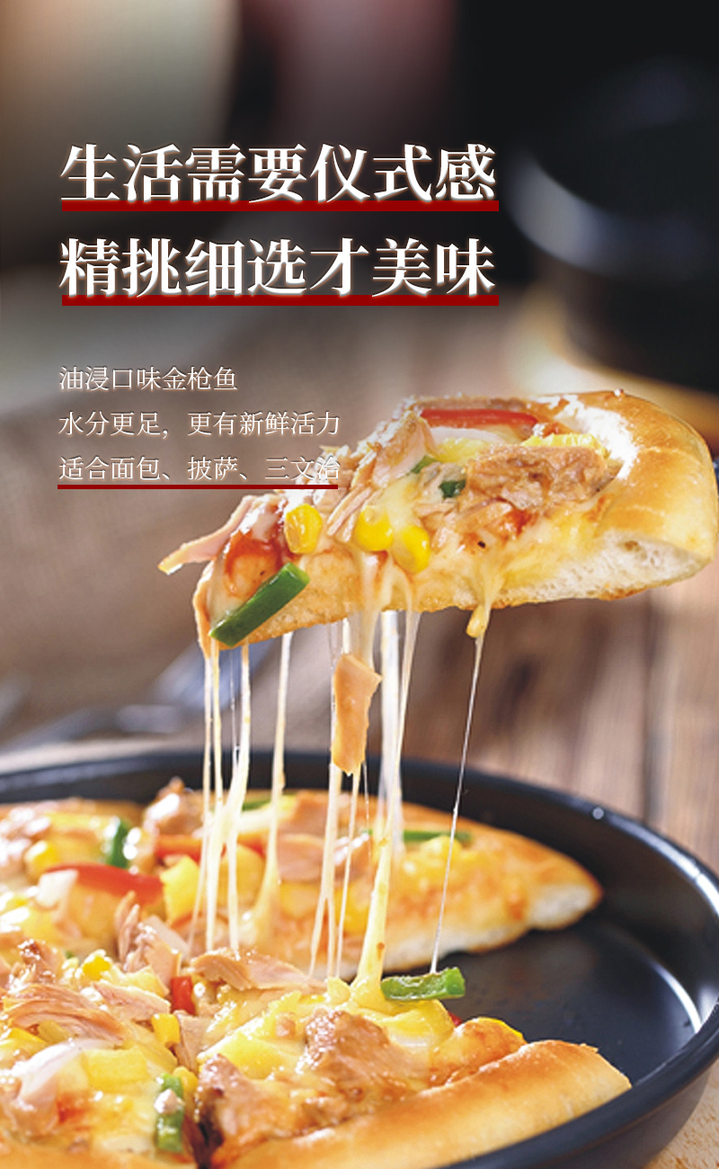油浸口感更美味!锁住水分不流失!生活需要仪式感,精挑细选才美味!油浸金枪鱼比较浓郁,比较润滑,水分更足,更有新鲜活力,适合做披萨馅料,面包,三明治等。