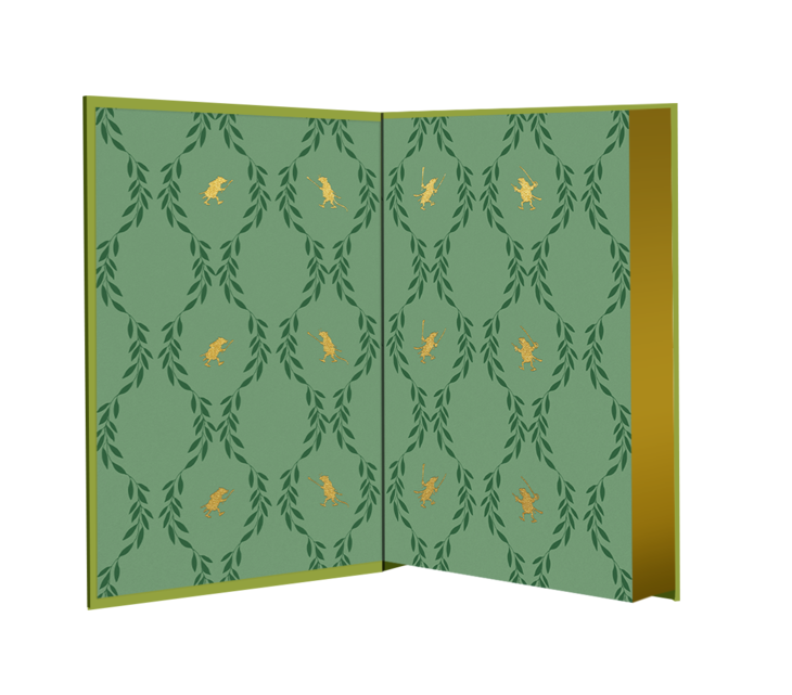 淡绿色山羊皮材质,封面采用烫金烫印工艺呈现蟾蜍历险记中的经典场景,32开全一册。