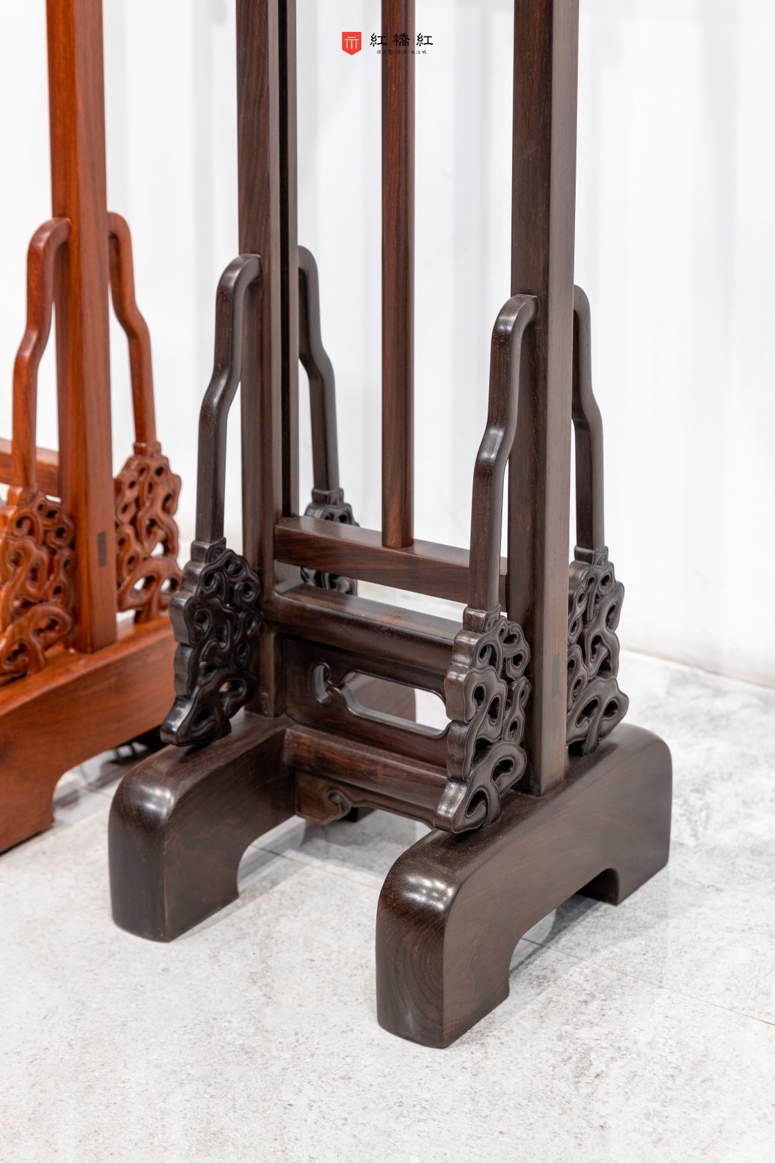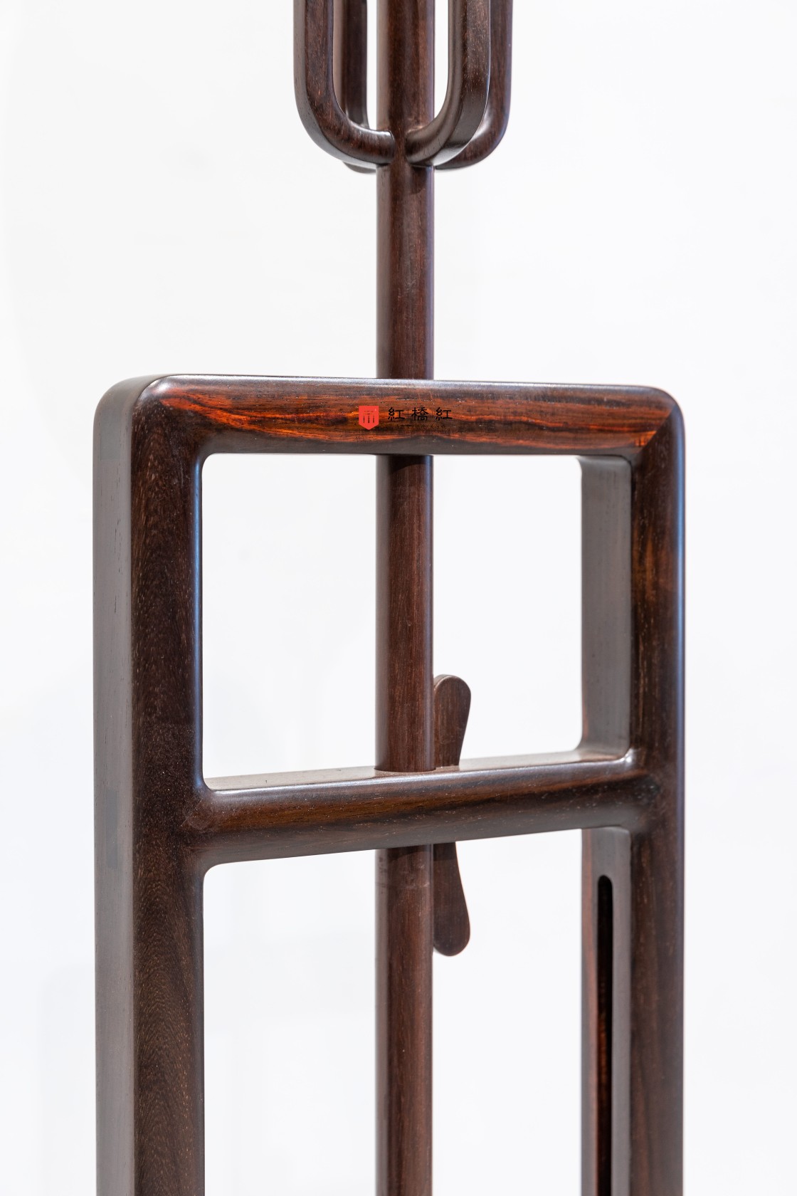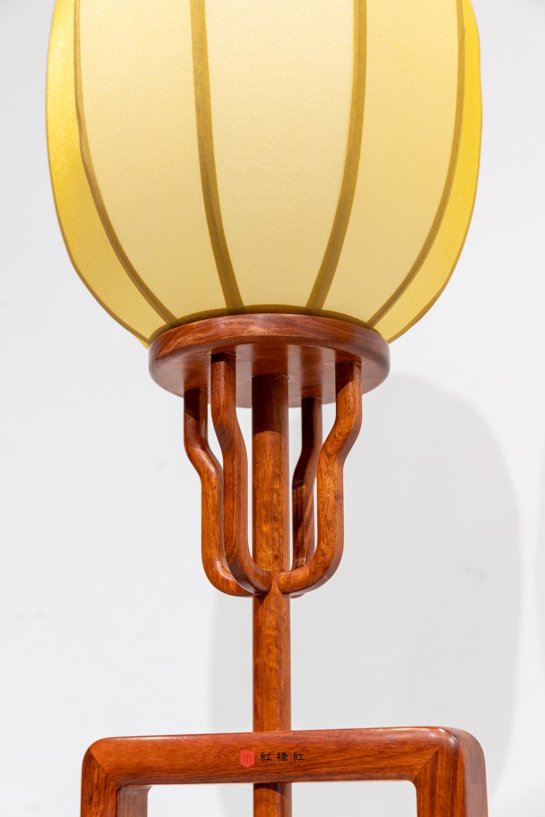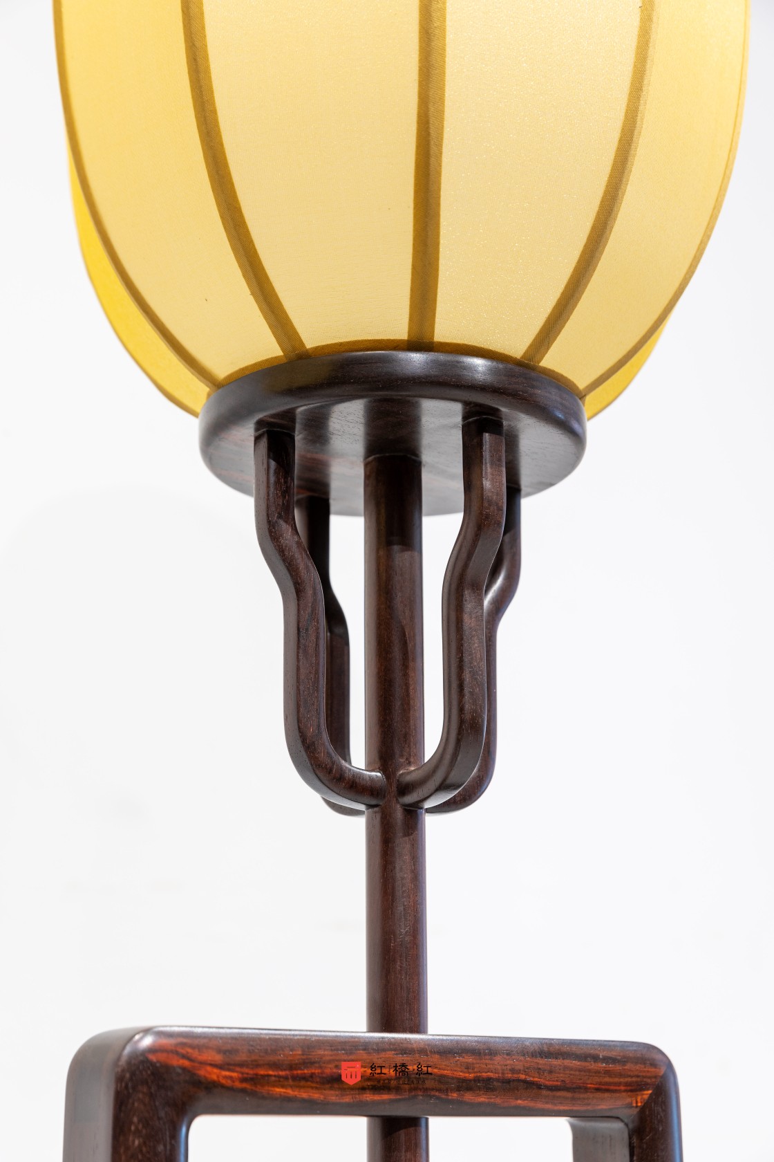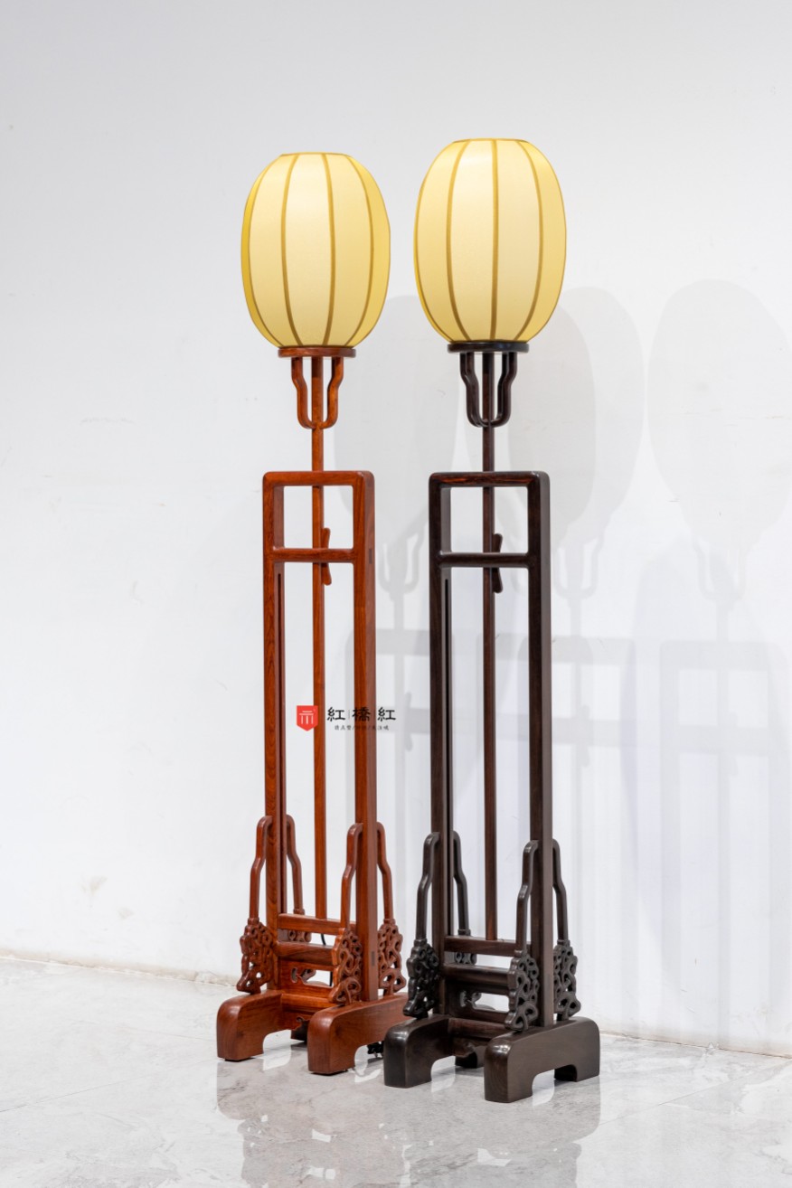 灯台底座用素墩木,质朴稳定;墩木上立柱两旁站牙,用灵芝蟠错成纹,设计绝妙,在传统家具纹饰形态中亦属少见。墩木间以横枨嵌夹透雕绦环板,颇似高束腰香几,所开之禹门洞形态。灯台赏面皆作素混,以手摩挲,可体验细磨功夫,转角处处倒圆。由灯罩、挂牙、灯杆、立柱、站牙,一路向下,比例协调,圆融至深。
