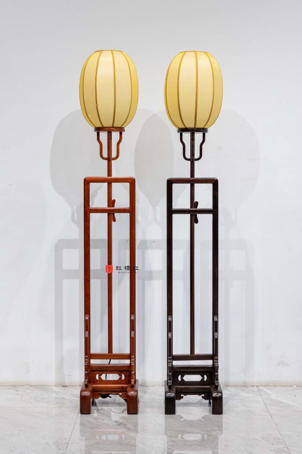 灯台由上至下以仿羊皮纸做灯罩,兼顾透光性、阻燃性及美感。内安可遥控智能灯泡。灯罩固定于圆盘之上,下安四块升龙形态的素挂牙;灯杆细长,打孔穿线,易致材料劈裂报废,技术难度颇高。故市面类似款型多将灯杆料对剖,再粘合以节约成本,难免美中不足。灯杆与下安横木呈倒T字形,横木两端纳入立柱内侧的长凹槽,故可上提或下按,实现上下自由调节,辅以弧形木楔,随意固定照明高度。