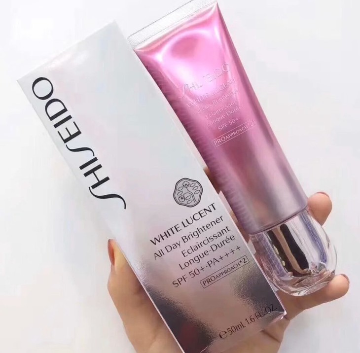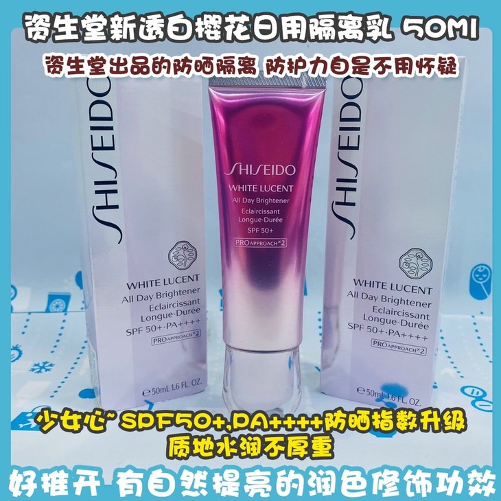 资生堂新透白樱花日用隔离乳 50Ml👍资生堂出品的防晒隔离,防护力自是不用怀疑☺。粉粉的樱花粉外表🌸,少女心~☀SPF50+,PA++++防晒指数升级,质地水润不厚重💦,粉白色的乳状,好推开,有自然提亮的润色修饰功效,带细细的闪✨,上脸会有光泽感,突显好肤质。带有细腻得光泽🤩,涂开后有修饰,提亮肤色的作用。添加美白成分和丰富抗氧化成分✔,多方位保护!作为一个SPF50+的防晒隔离乳,能让底妆有这么美的效果实在太赞啦👏~