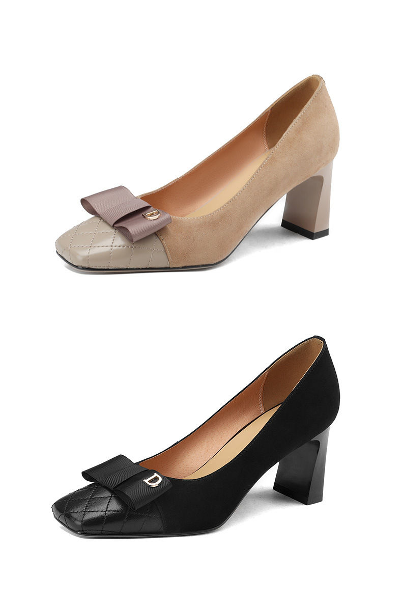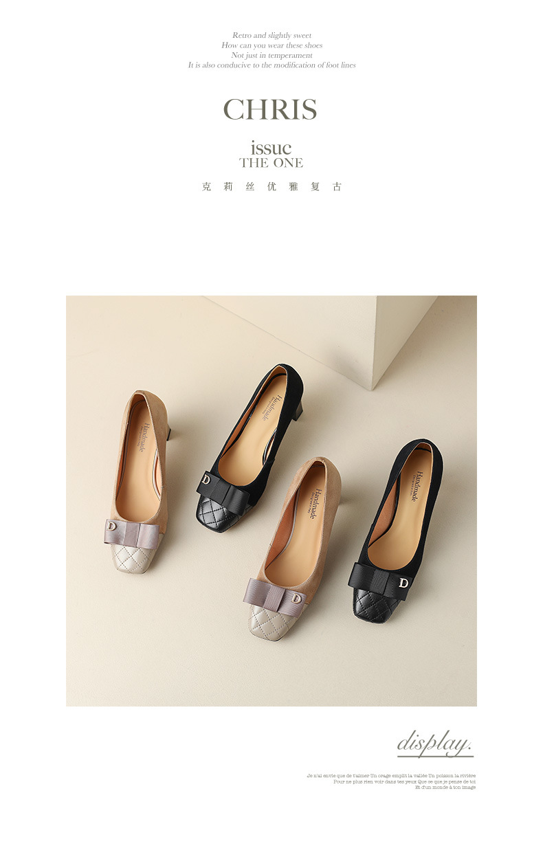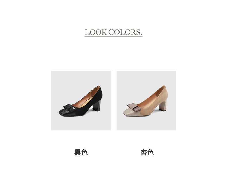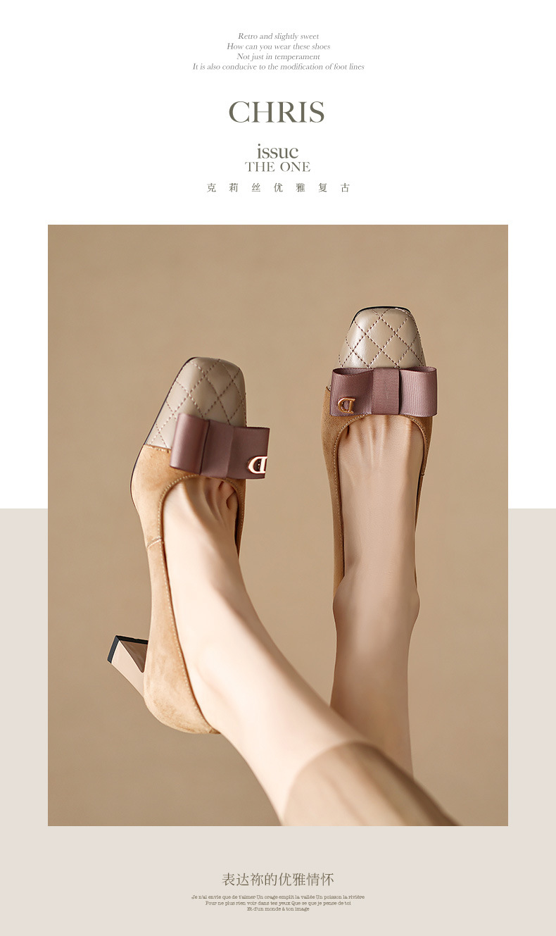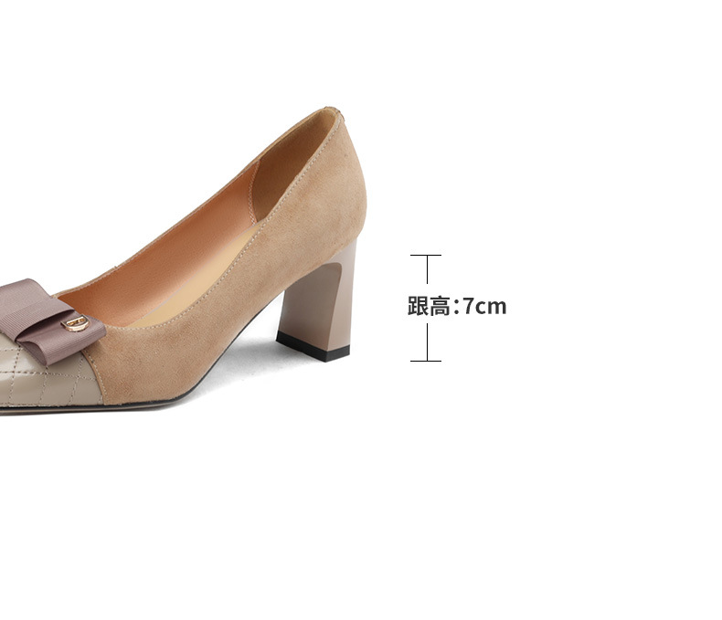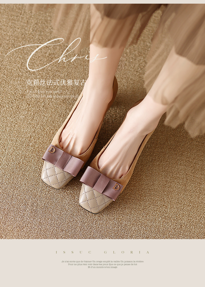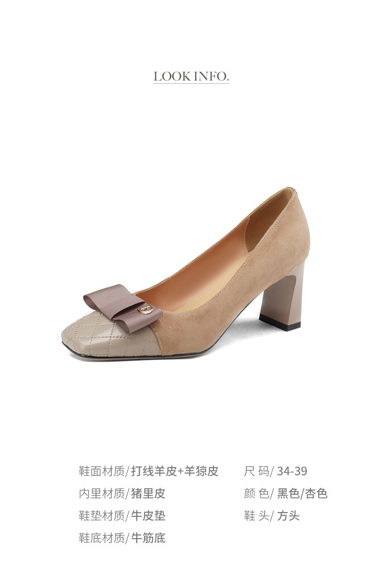 仙女风方头蝴蝶结单鞋女,羊翻皮拼接粗跟温柔鞋中跟杏色鞋LD-6266