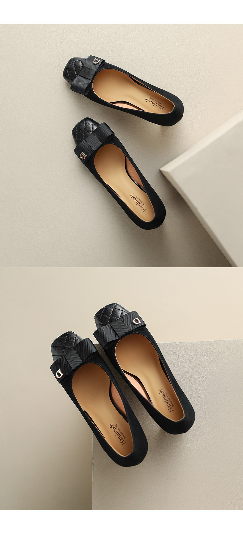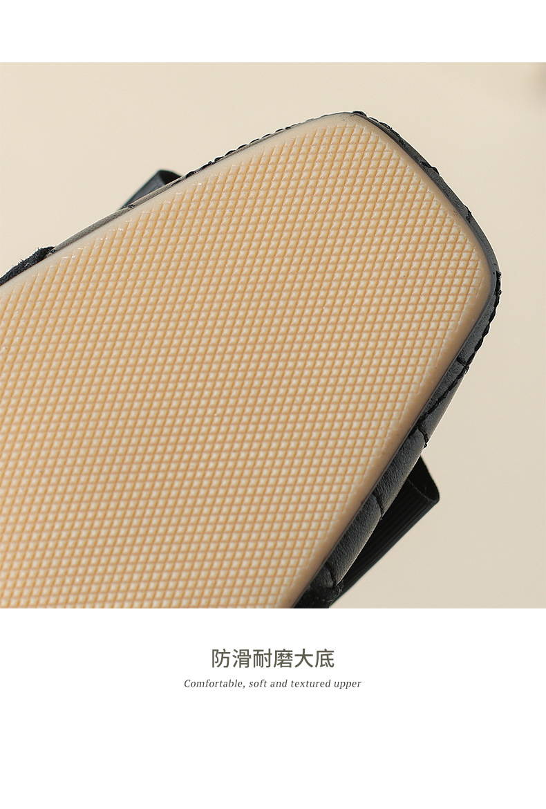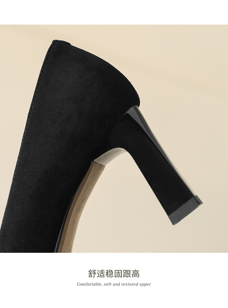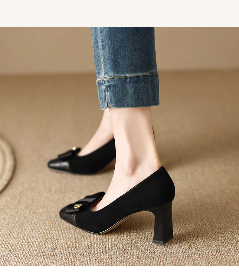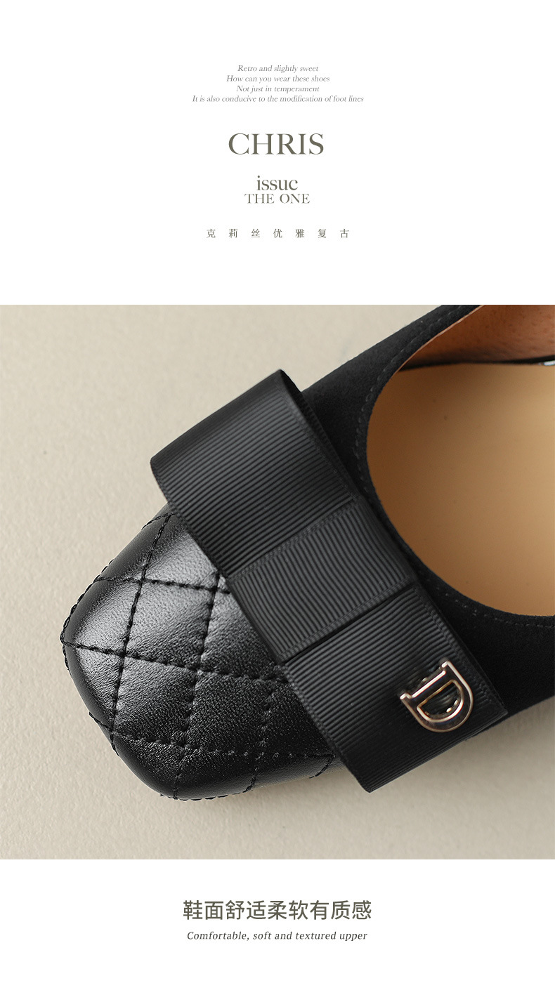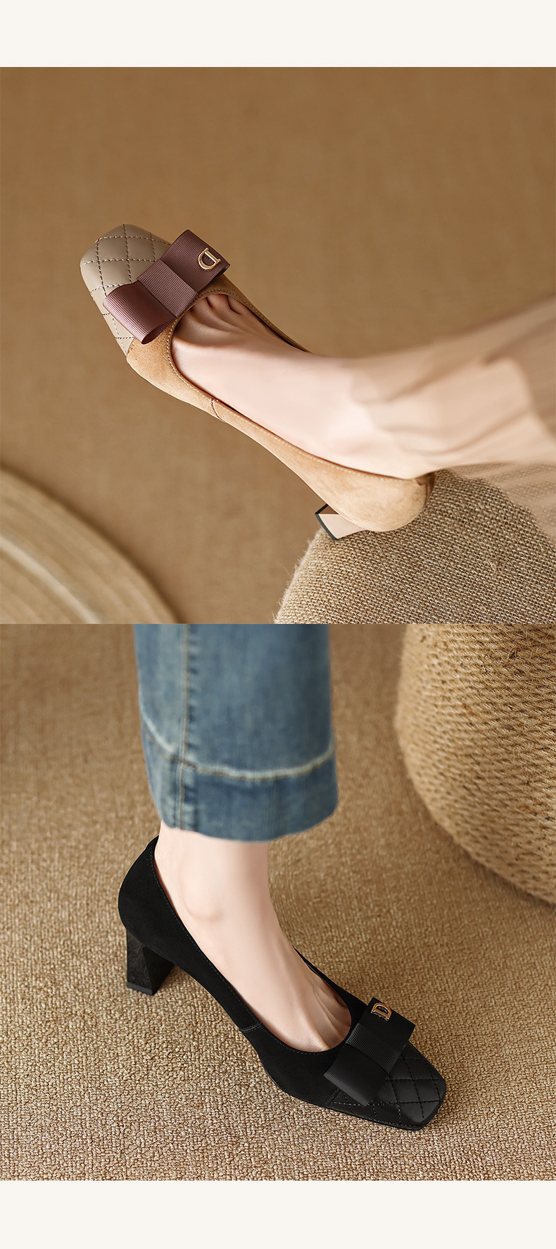 仙女风方头蝴蝶结单鞋女,羊翻皮拼接粗跟温柔鞋中跟杏色鞋LD-6266