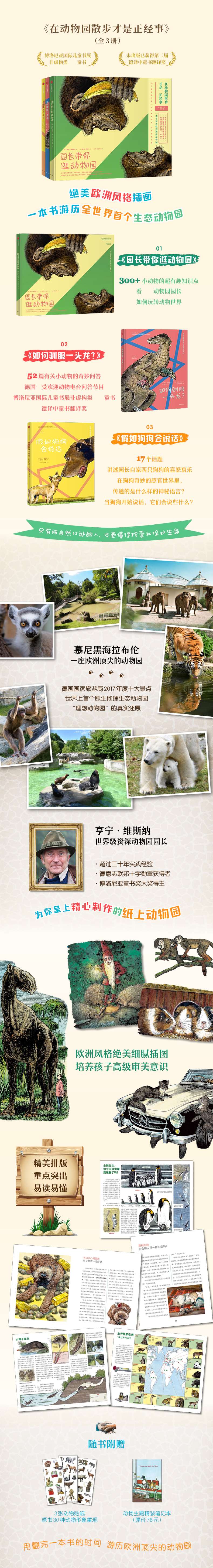 在这套书里,他将带你游历这座欧洲的动物园,为你完整呈现一座“理想中的动物园”;而后运用丰富的学识和温情的幽默感,解答孩子们关于动物的千奇百怪的趣味问题;后会以自家两只狗狗的口吻,展开对话,揭开人类古老的好伙伴身上的种种奥秘。