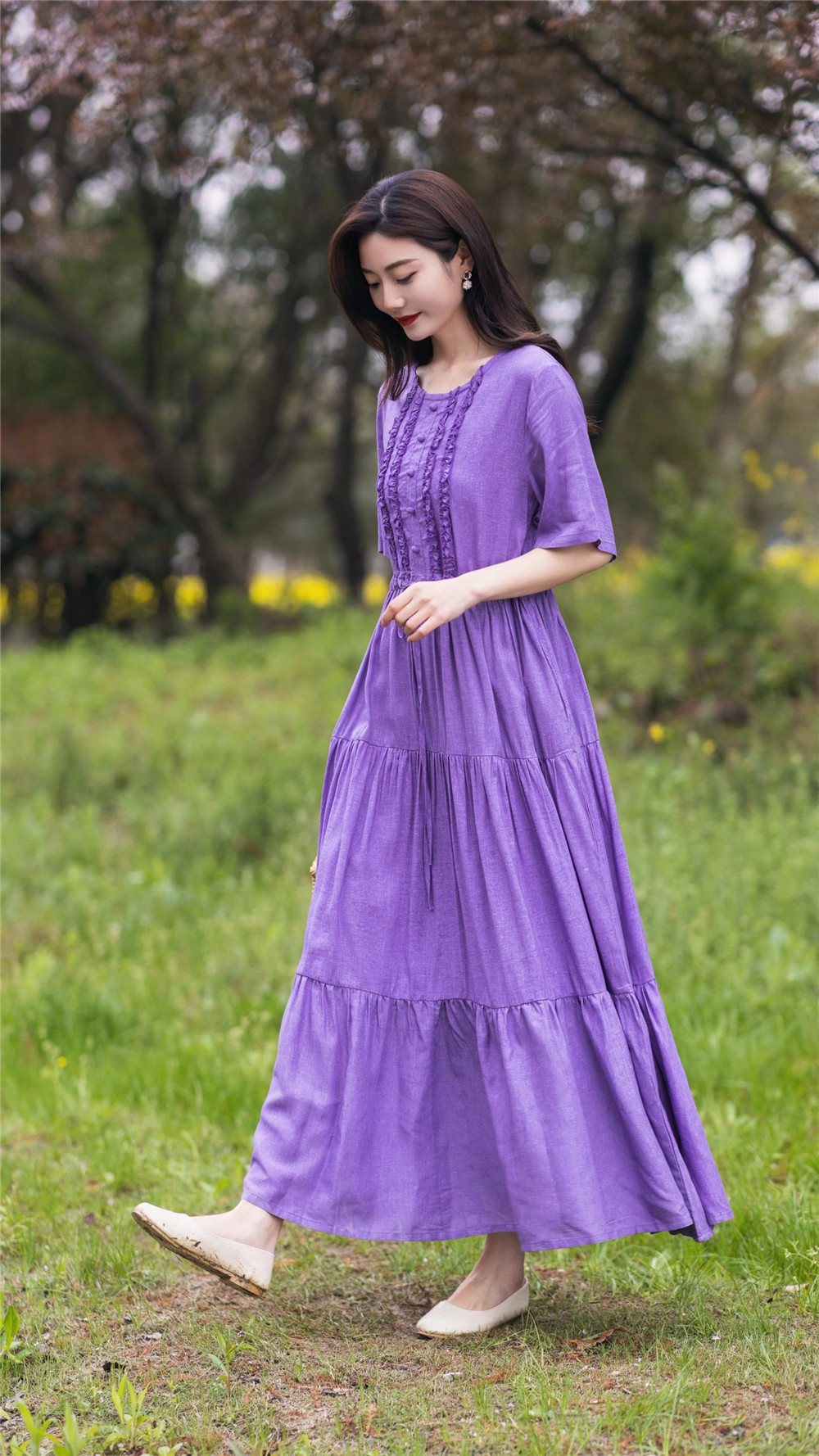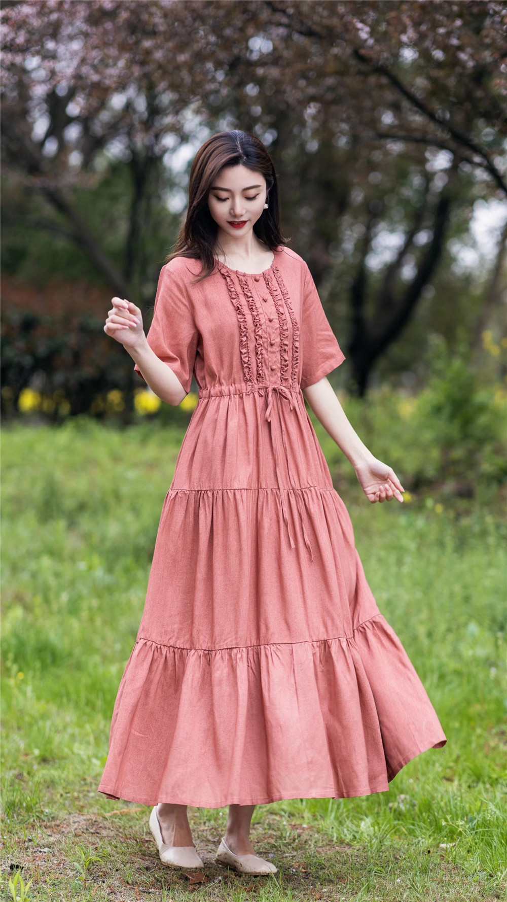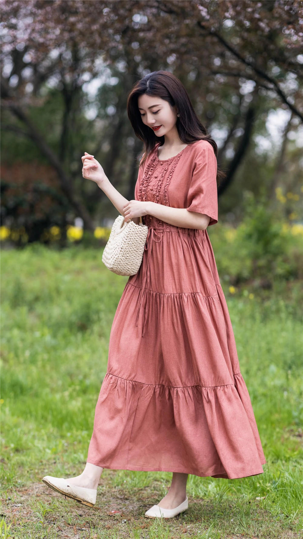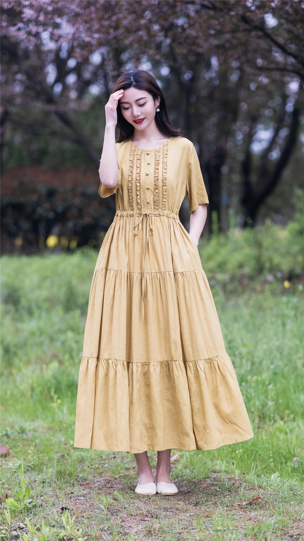 SZ256 2022纯色棉麻女长裙夏季短袖拼接大摆加长款女式花边收腰连衣裙