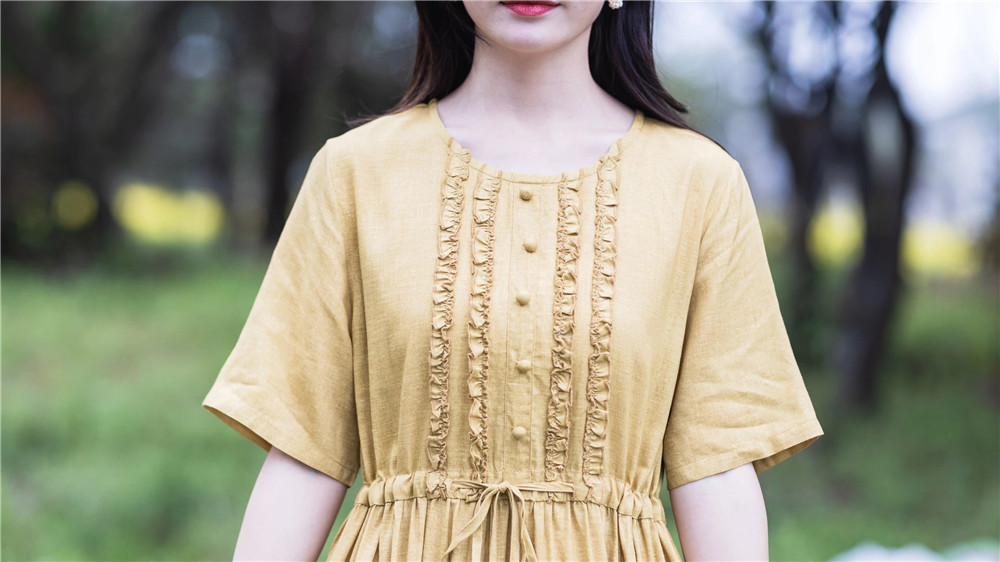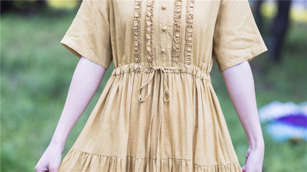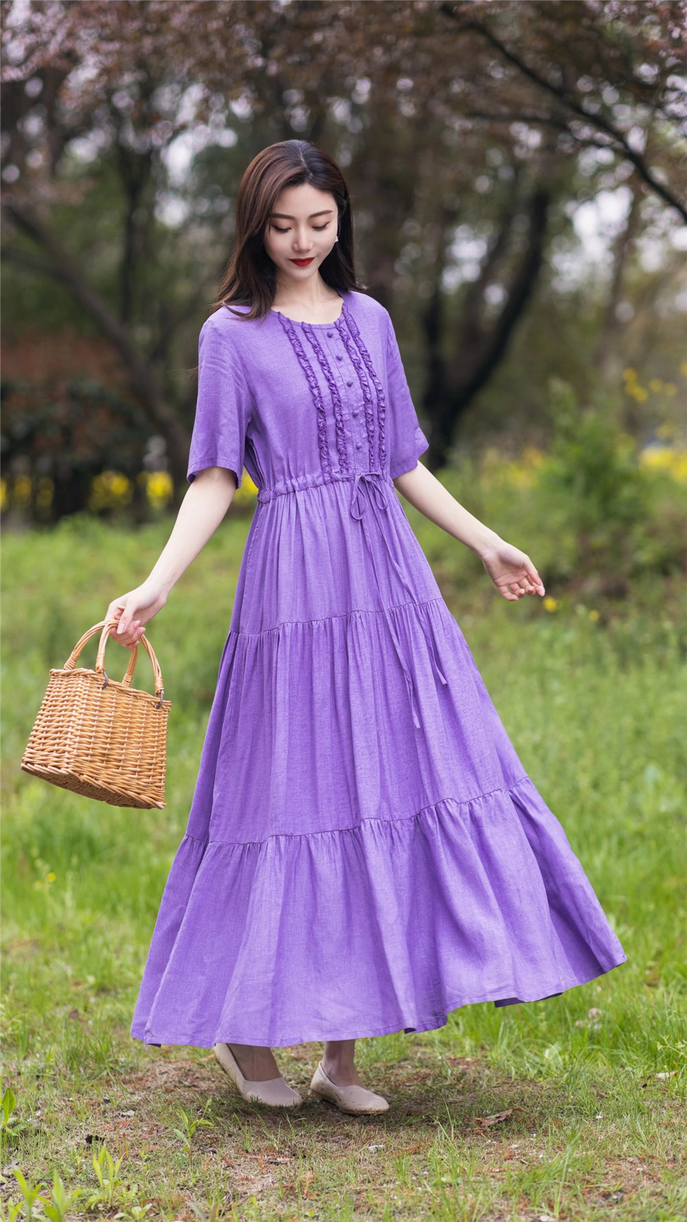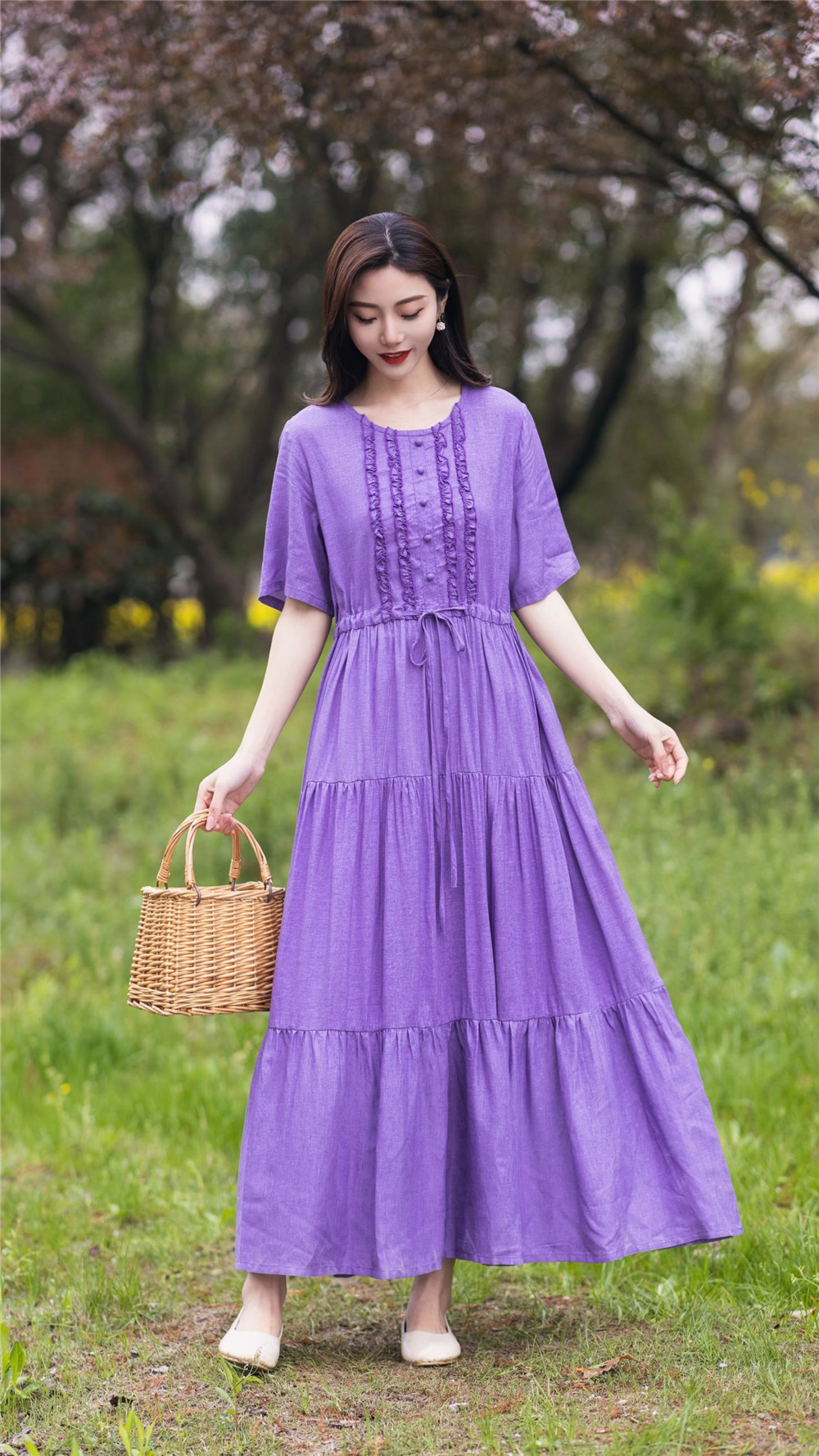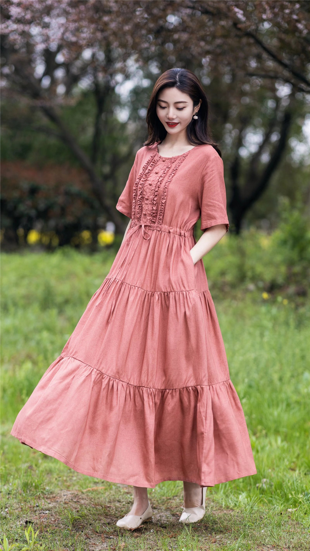 SZ256 2022纯色棉麻女长裙夏季短袖拼接大摆加长款女式花边收腰连衣裙