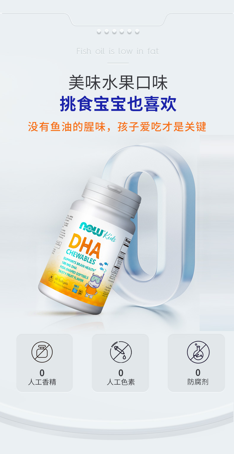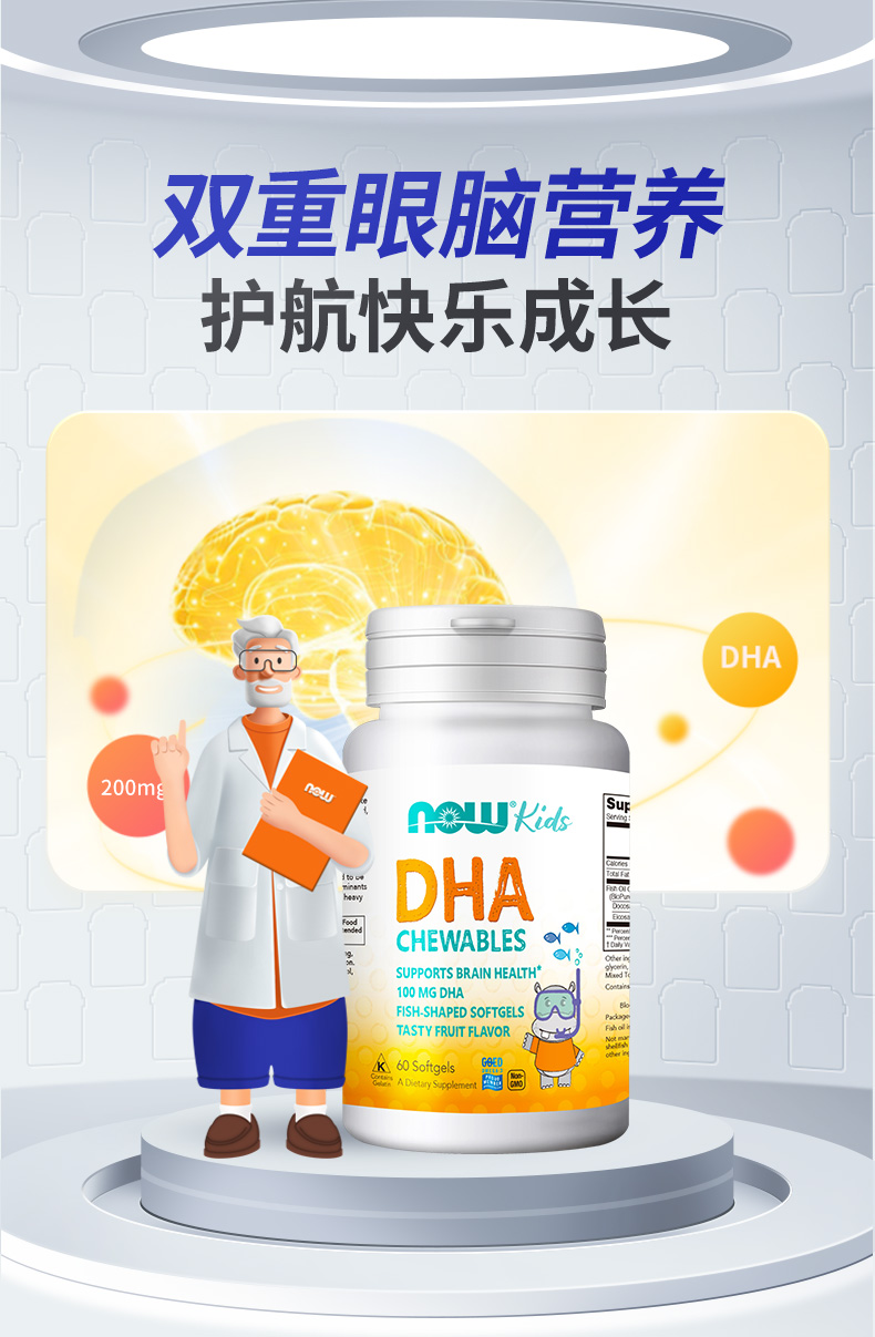 【NOW】DHA 100毫克儿童咀嚼软胶囊 60粒儿童鱼油美国进口