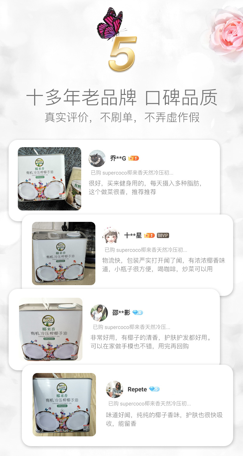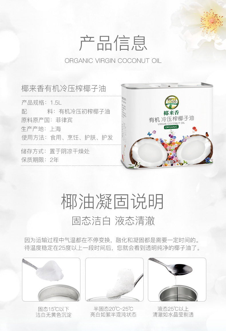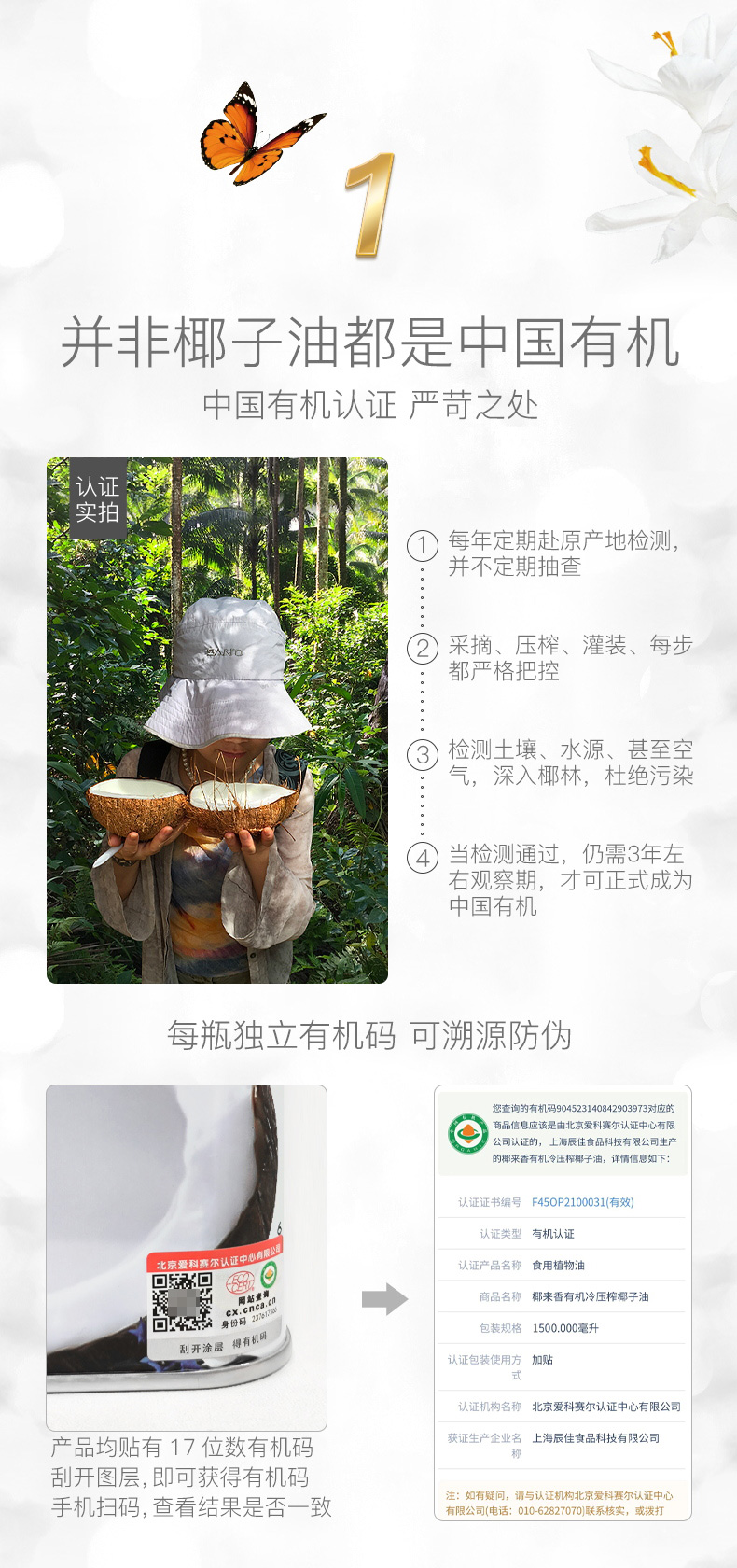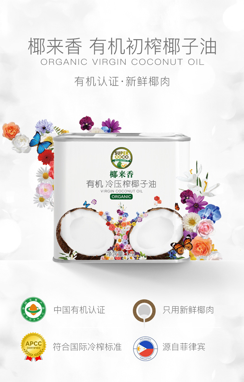 【椰来香】菲律宾进口原料 有机冷压榨椰子油1.5L 有椰香