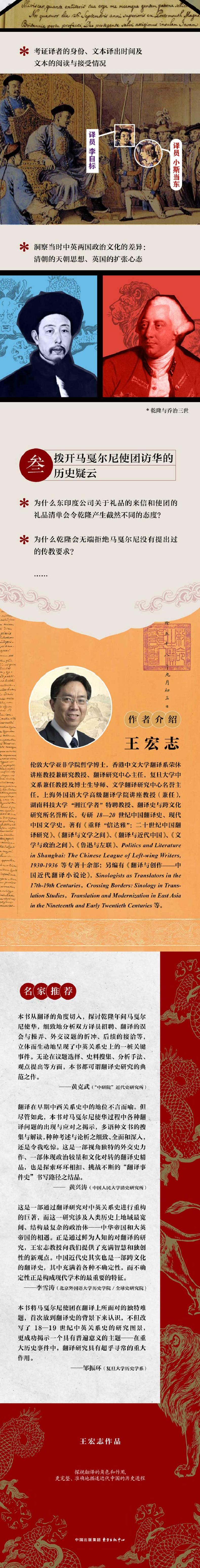 作为中英官方的一次正式接触,1793年马戛尔尼使团访华对两国历史发展的深远影响毋庸置疑,然而使团的沟通与翻译问题罕有进入研究者视野。本书聚焦翻译在这次中英对话中扮演的关键角色,全书七个章节以时间为轴线,由多个问题驱动论述,通过对使团译员背景以及国书、敕谕、礼品清单、往来书信等各类文件的翻译和改写的考察,并基于对大量珍贵档案和多门语言文献材料抽丝剥茧式的深入挖掘和分析,力图还原马戛尔尼使团访华事件的翻译过程,向读者展示翻译在马戛尔尼访华事件乃至近代中国外交活动中的至关重要性。本书资料丰富详实,论述严密,对使团研究的许多问题提出了新颖见解,填补现有使团研究的空白,为近代中国翻译史、中英外交史研究提供了重要参考与典范。