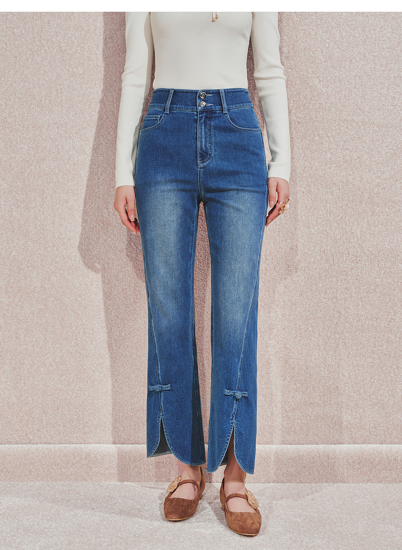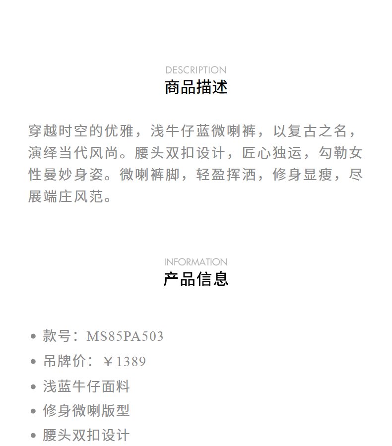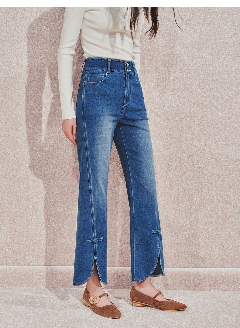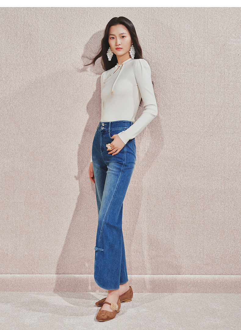 MAXRIENY复古优雅微喇牛仔裤24秋新款腰头双扣设计长裤高级气质感(货号:MS85PA503)