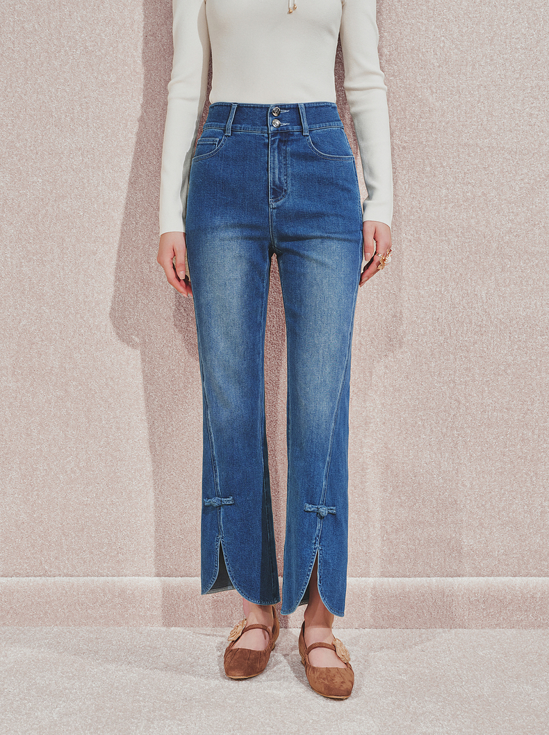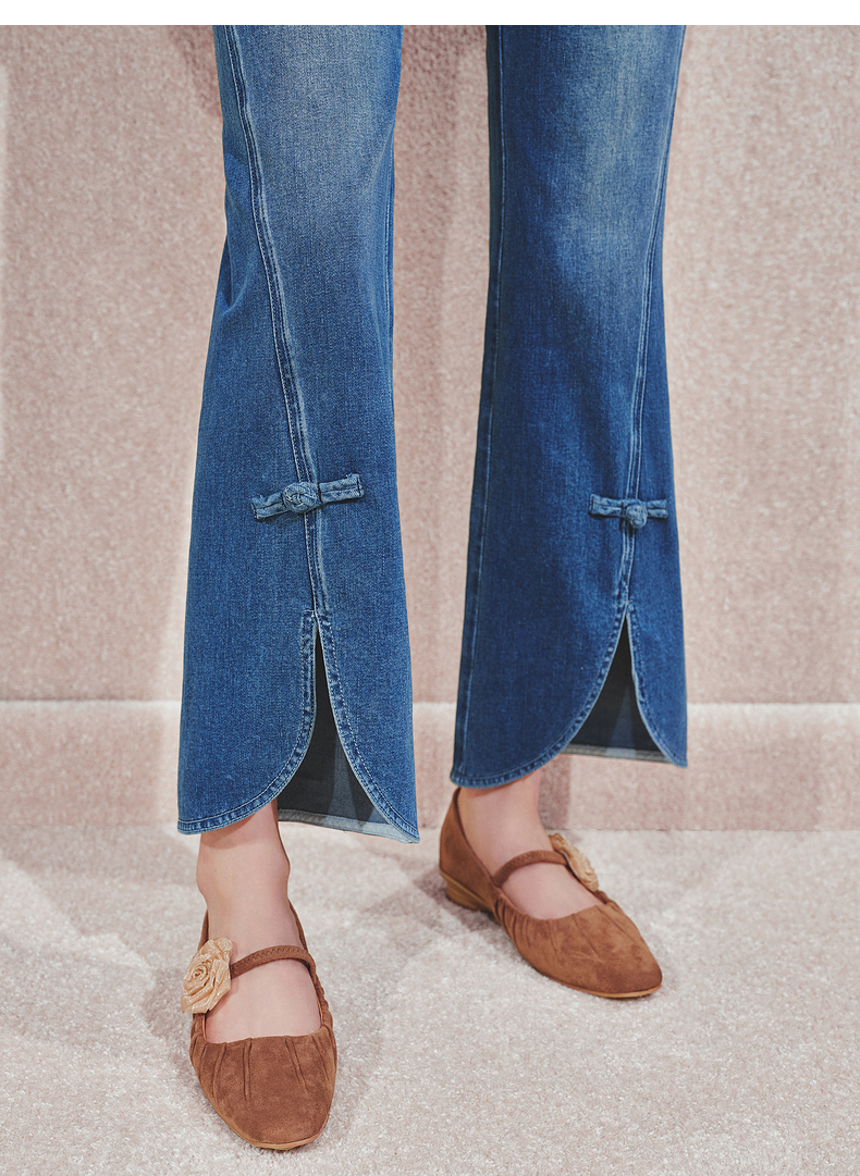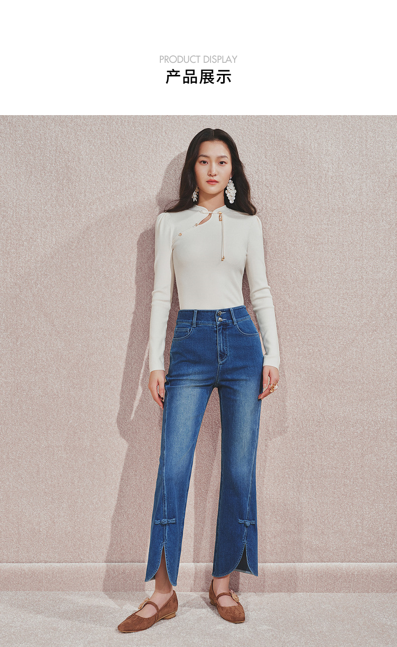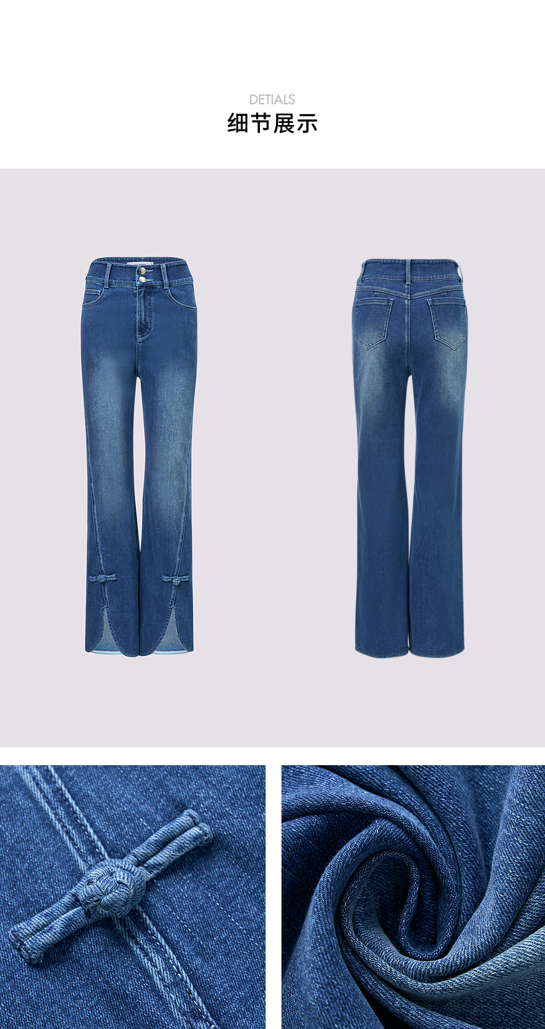 MAXRIENY复古优雅微喇牛仔裤24秋新款腰头双扣设计长裤高级气质感(货号:MS85PA503)