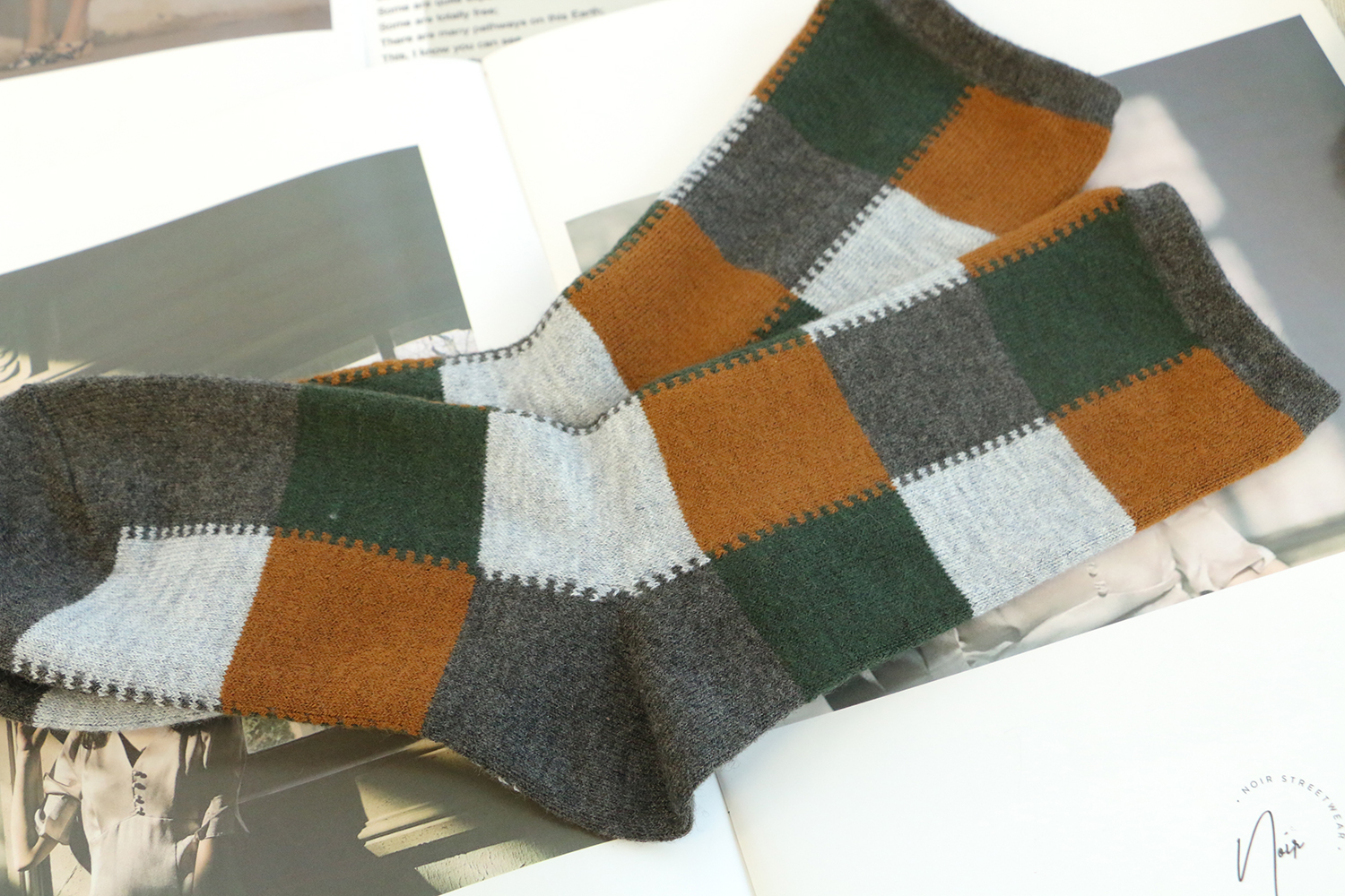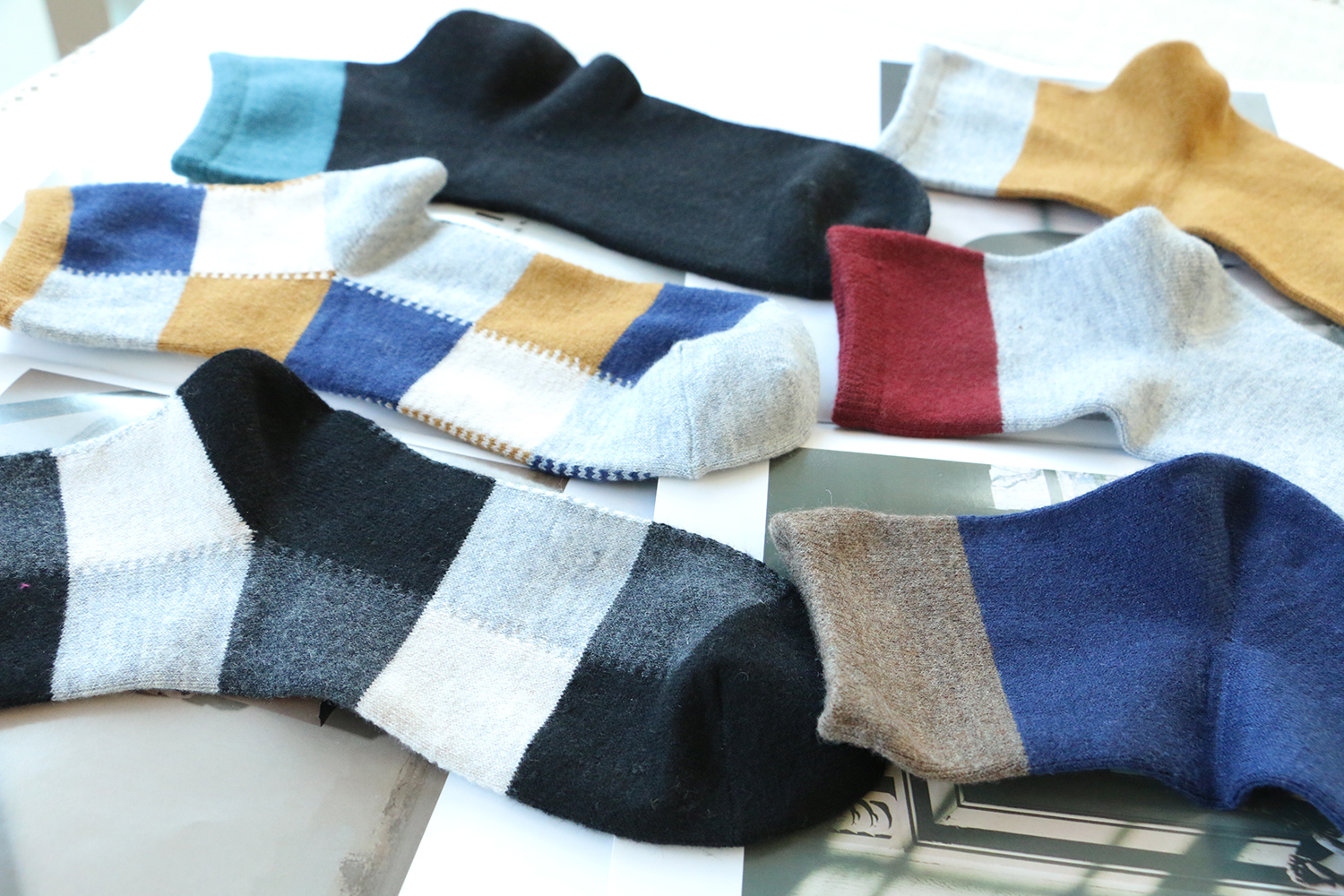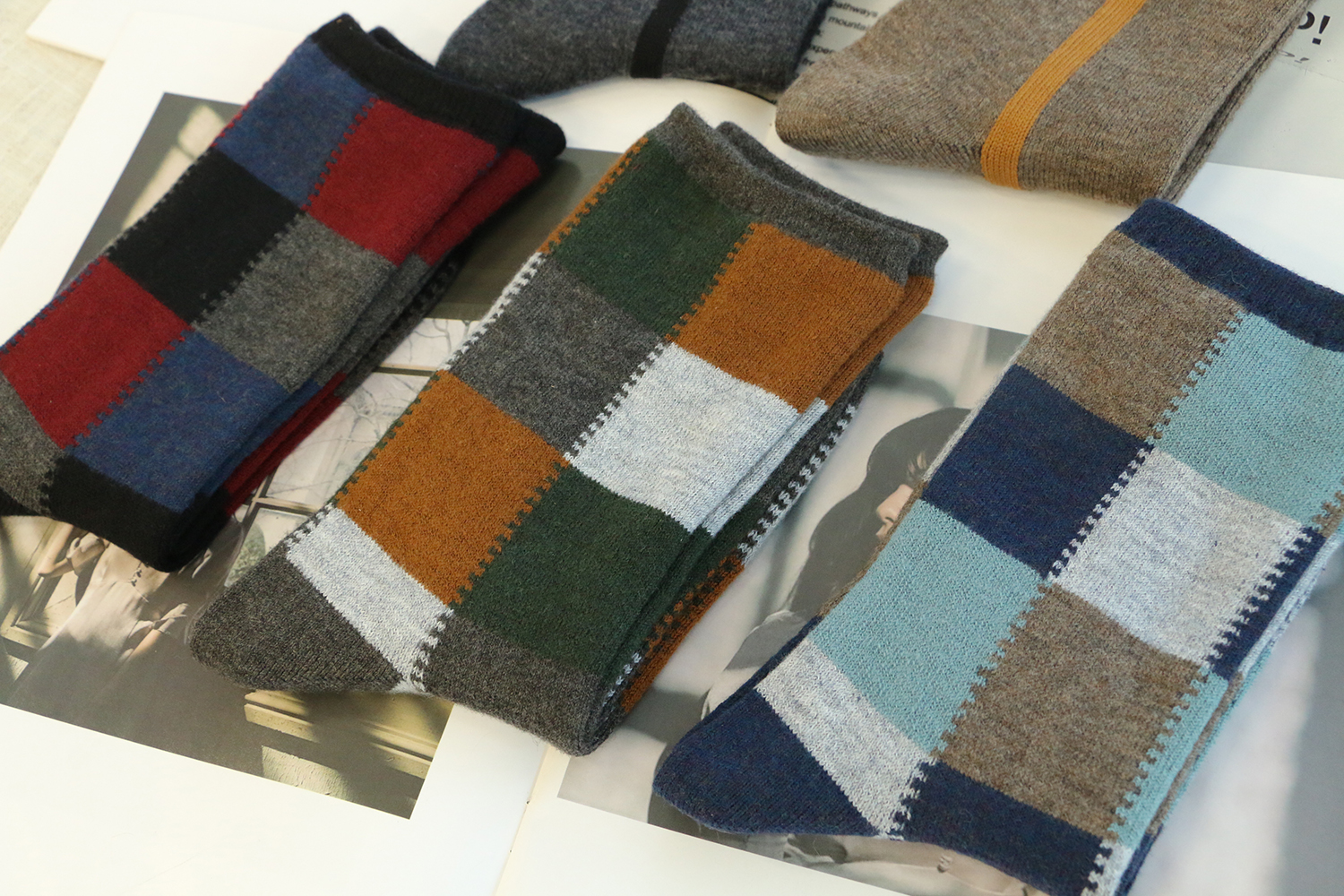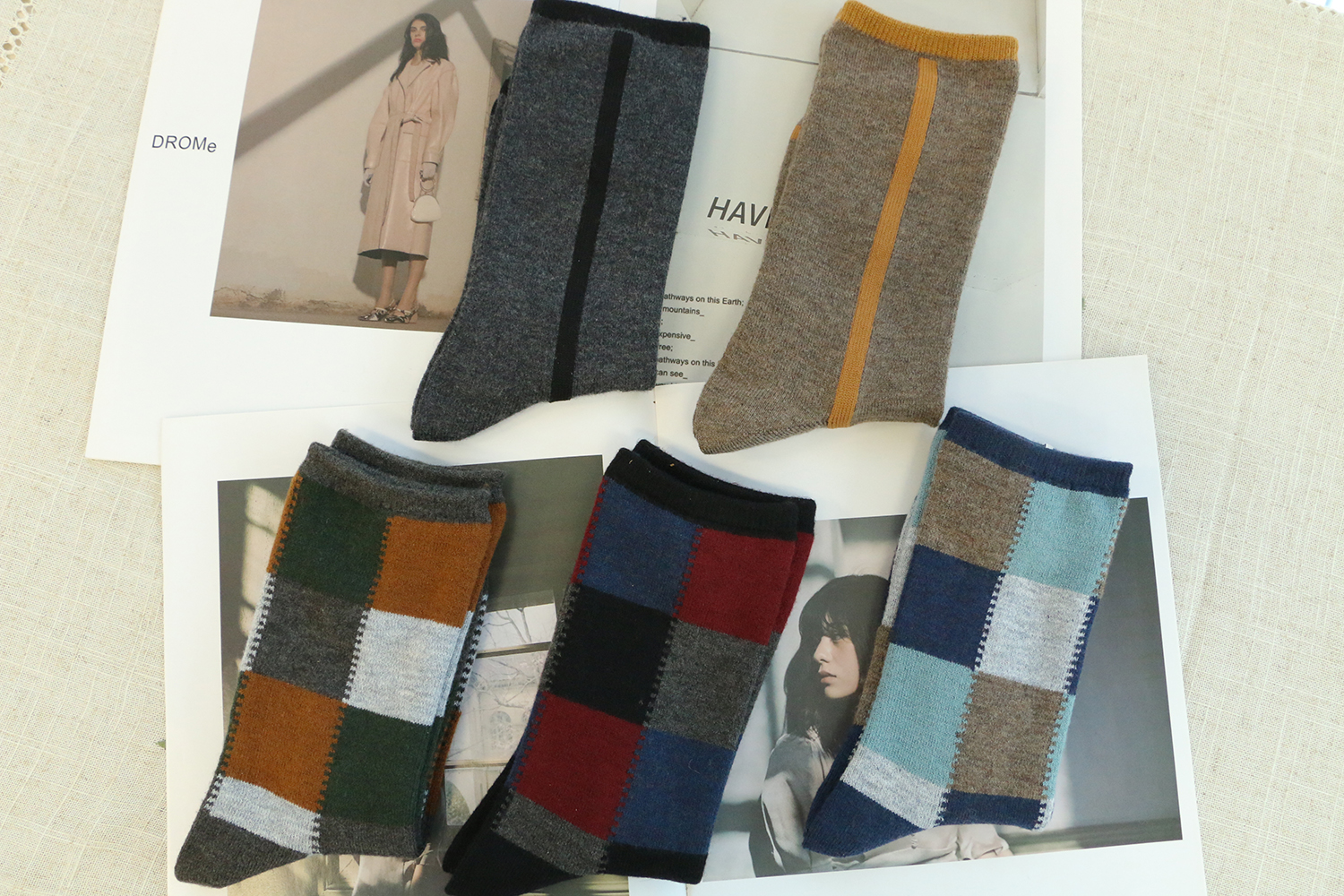 其次呢,羊毛袜的提花太漂亮了,女款我们上一组6色,男女款一组5色。女款6色,包括了4双收口拼色袜和2双格纹袜,姜黄、孔雀蓝、宝石蓝、圣诞红、驼色、麻灰、深灰,一撞色,偏顺色的优雅,格外日常。每一双我们上脚穿,都是好搭配的彩色袜,英伦,复古,不拘泥于基础色系,加入色彩,拼色袜露一个小边,冬天搭配一些日常look很实用。男女袜5色,包括3双格纹袜和2双单条纹袜,圣诞绿、红、黑、蓝、驼色,中性配色,可以很好融入秋冬穿搭。(女袜袜筒低一些,男女袜更高一些哦)