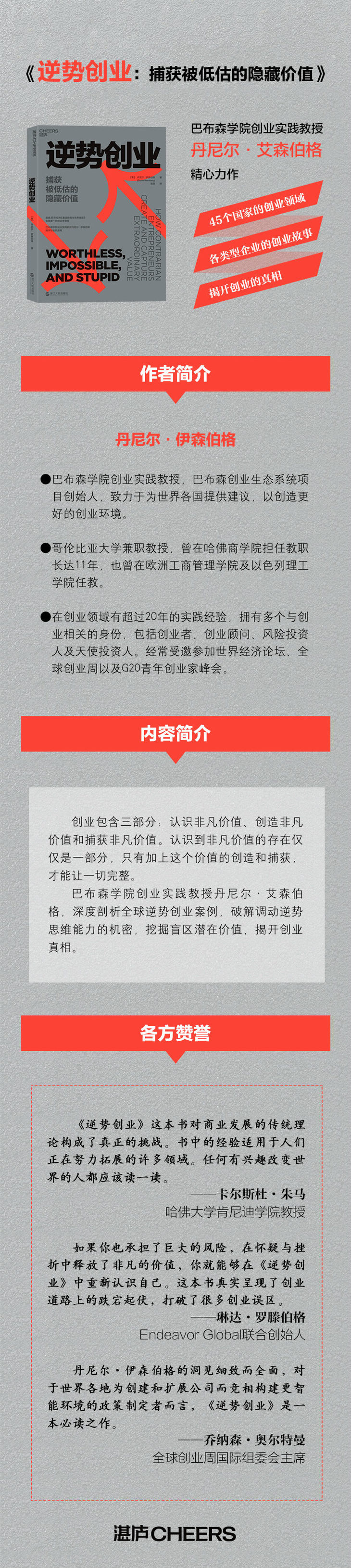 在《逆势创业》这本书中,全球著名商学院巴布森学院的创业实践教授伊森伯格介绍了全球逆势创业案例,从冰岛到以色列、从墨西哥到斯洛文尼亚、从印度到美国、从孟加拉国到巴基斯坦,提出了一个核心的,与众不同的观点:创业包含三部分,对非凡价值的认知、创造和捕获。认识到非凡价值的存在仅仅是一部分,只有加上这个价值的创造和捕获,才能让一切完整。而创造并捕获这种非凡价值的途径只有调动逆向思维能力,看到别人没有看到的潜在价值。在某件无价值的东西中找到价值,把看上去不可能的事情看成是创造新物种的契机,将看似愚蠢的选择变成明智的选择,这就是逆势创业的本质。