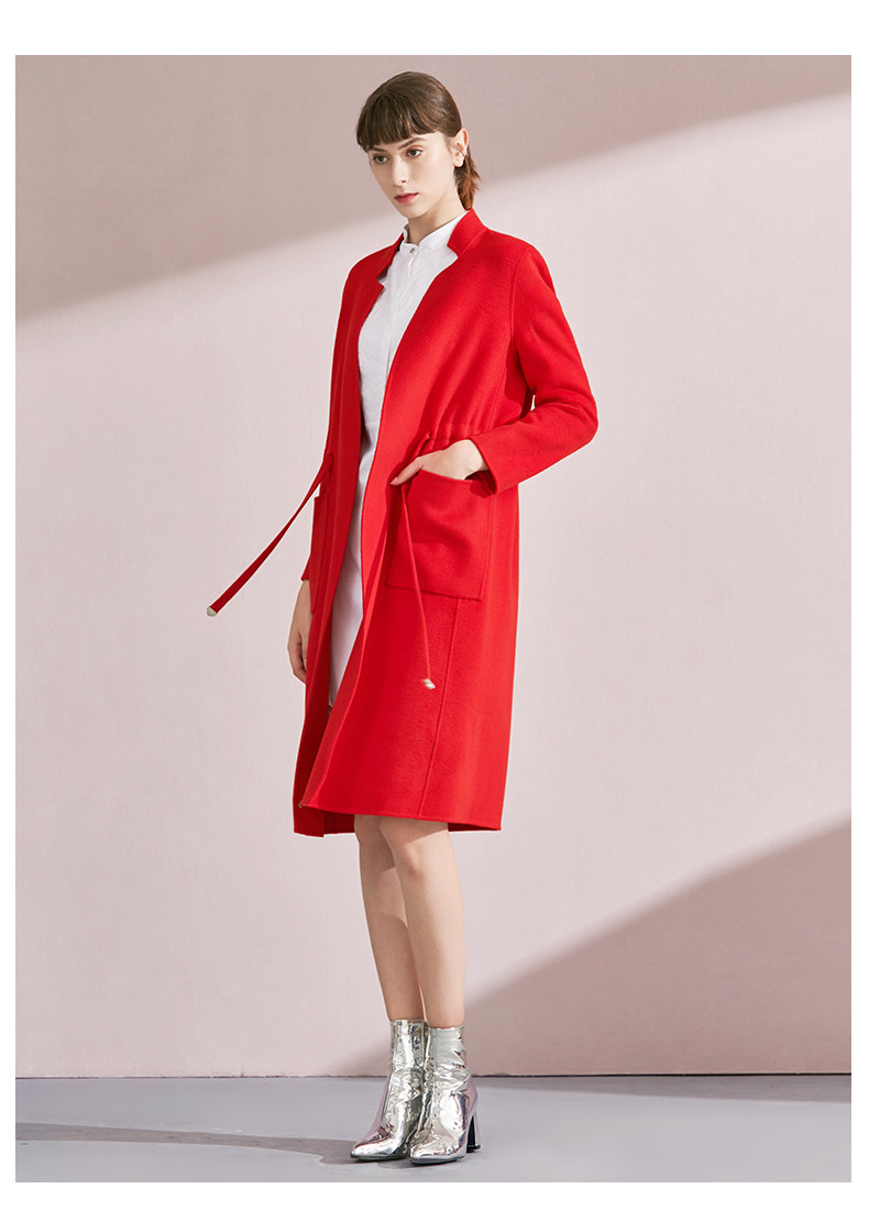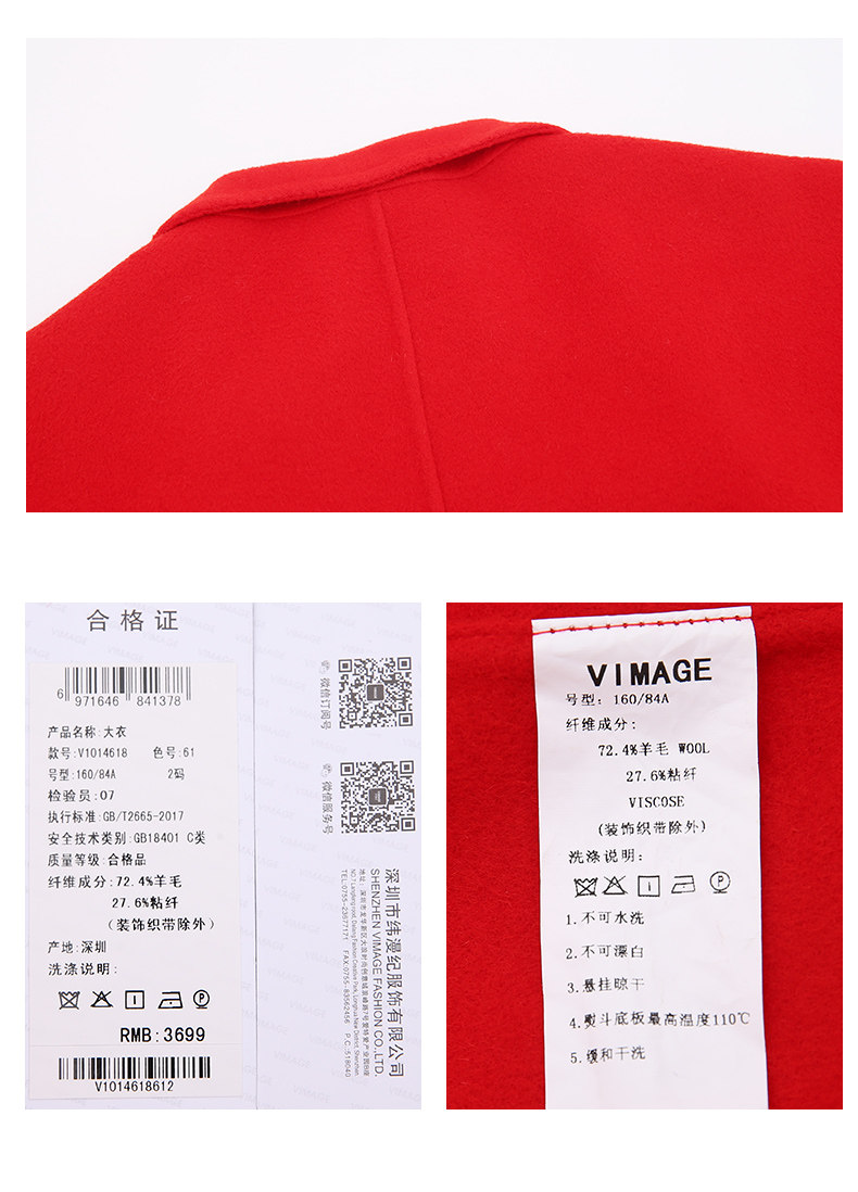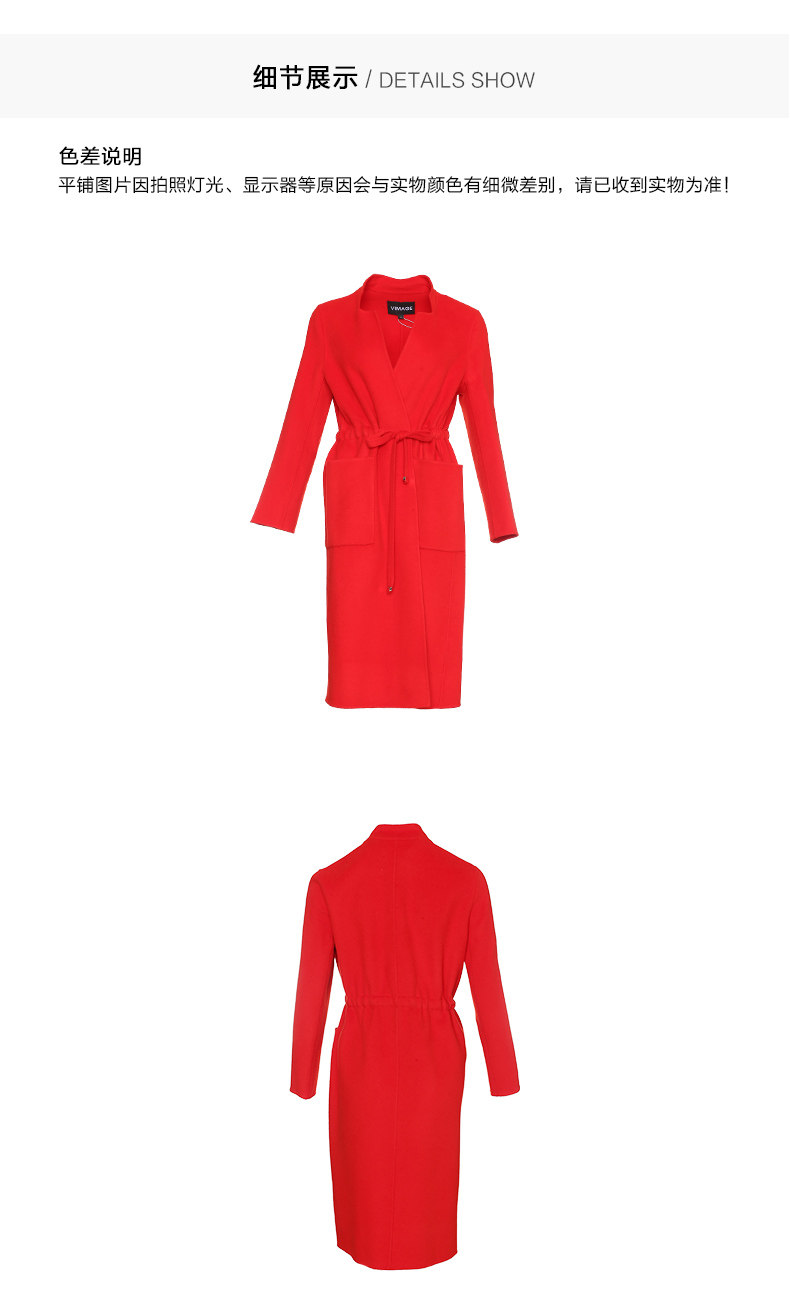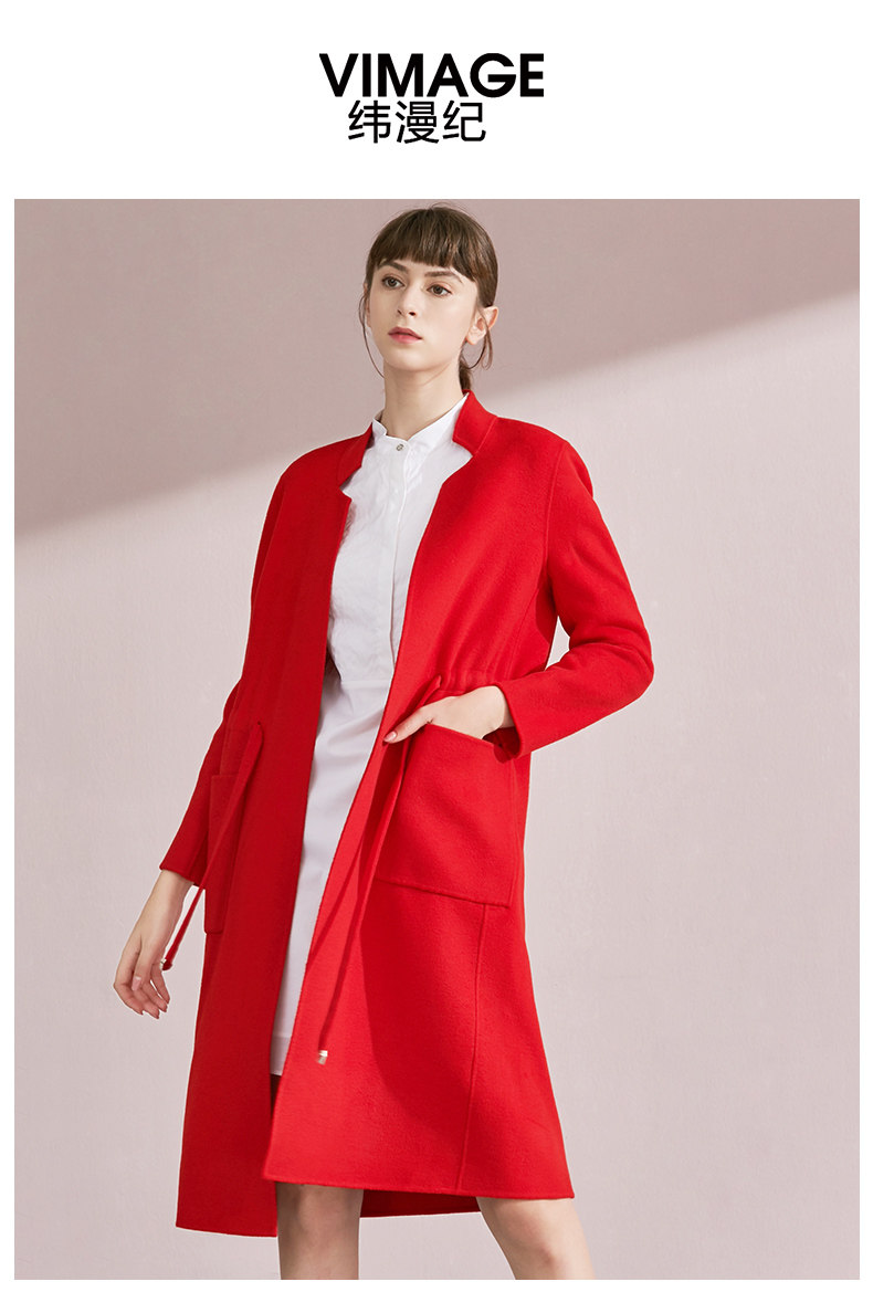 VIMAGE纬漫纪品牌女装冬季系带修身毛呢外套女中长款V1014618