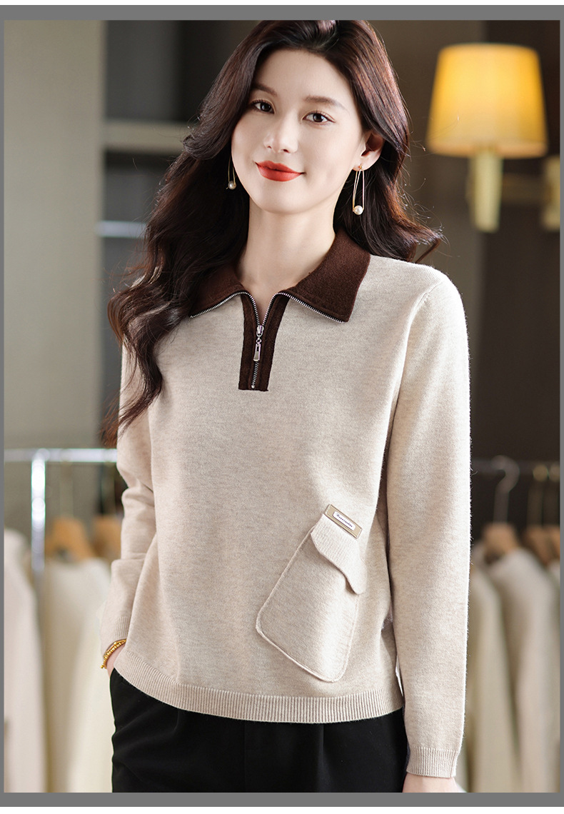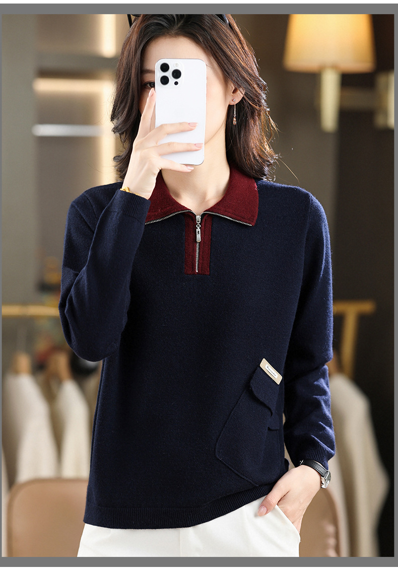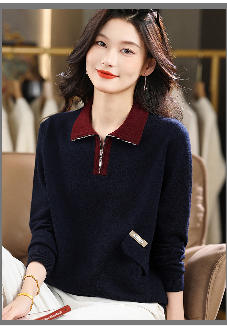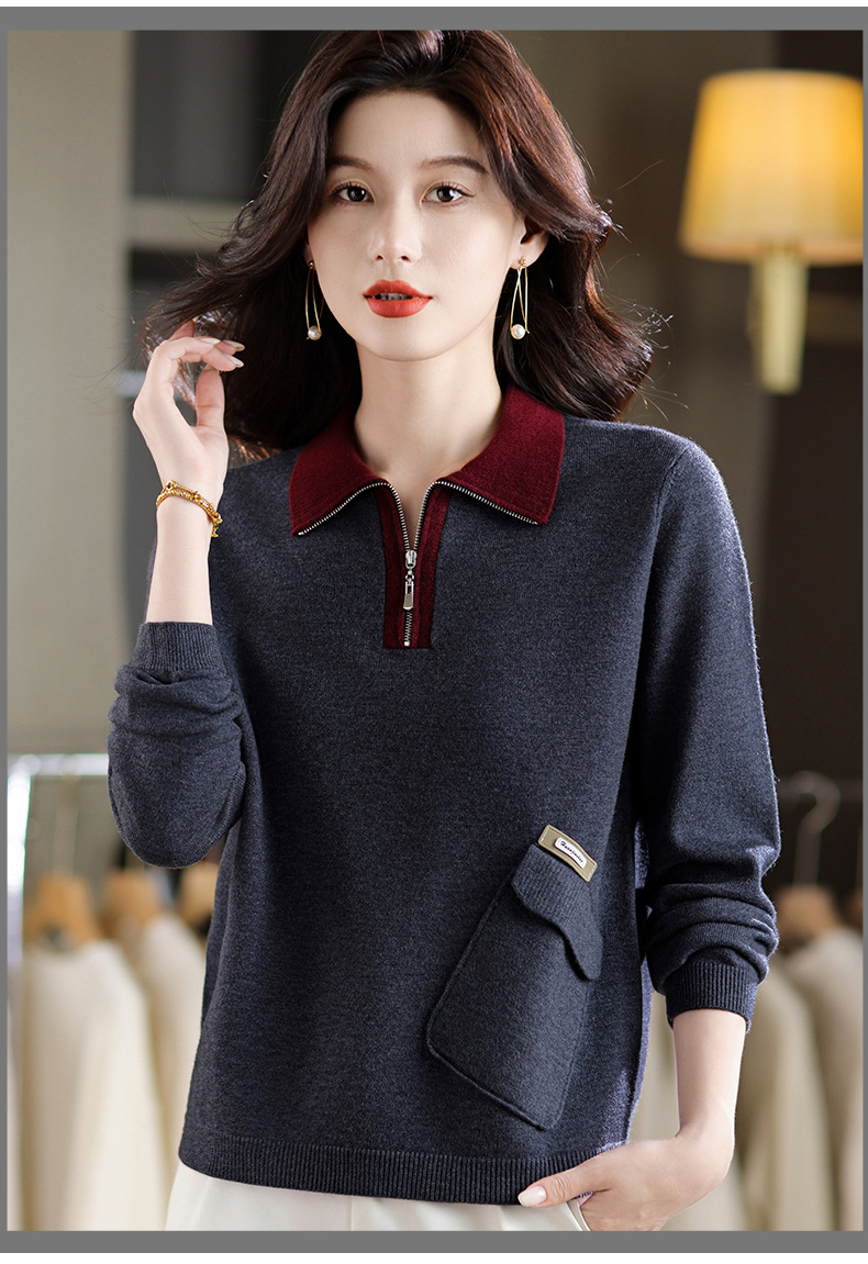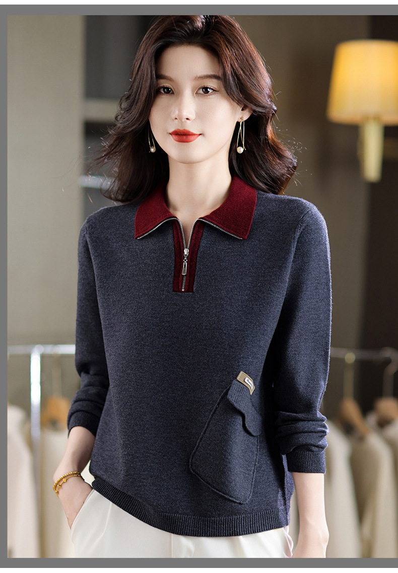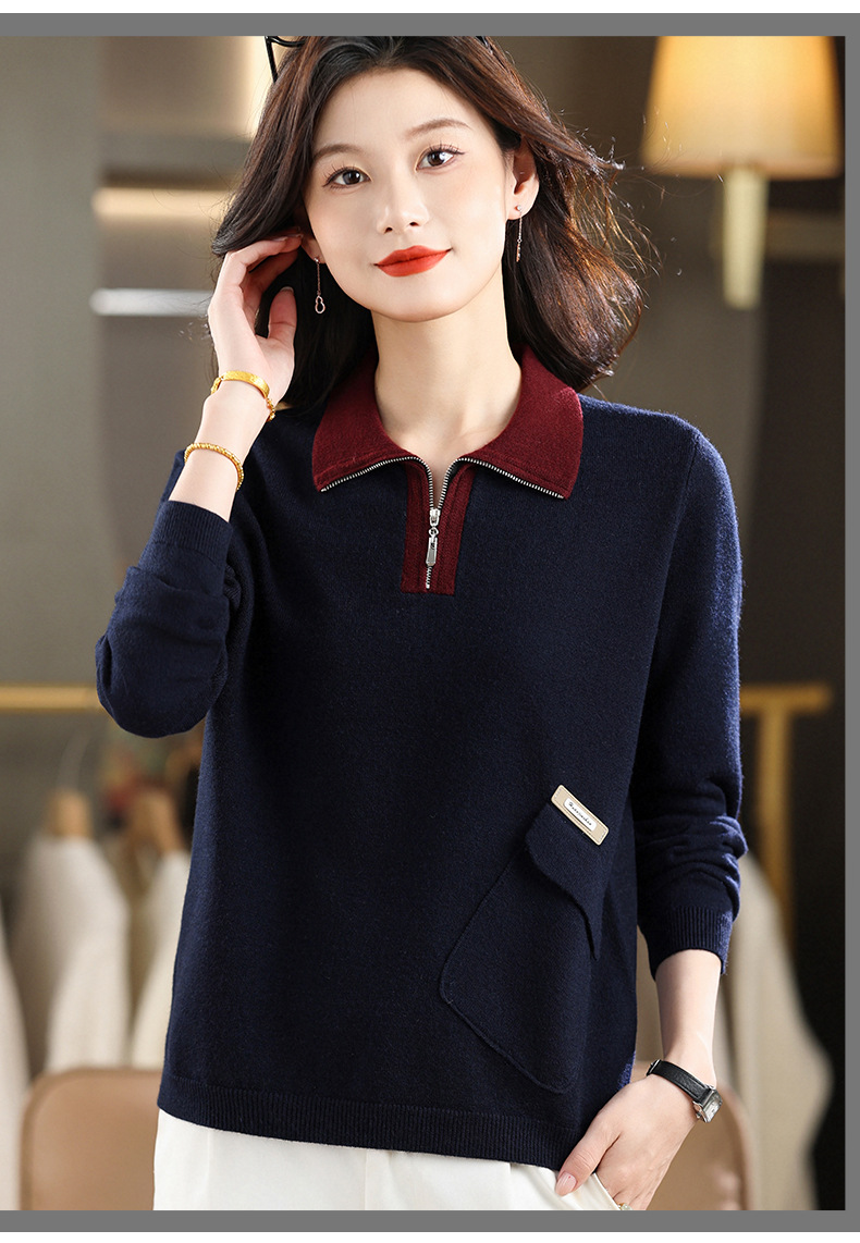 QF 105-1257翻领针织衫拼色宽松休闲毛衣