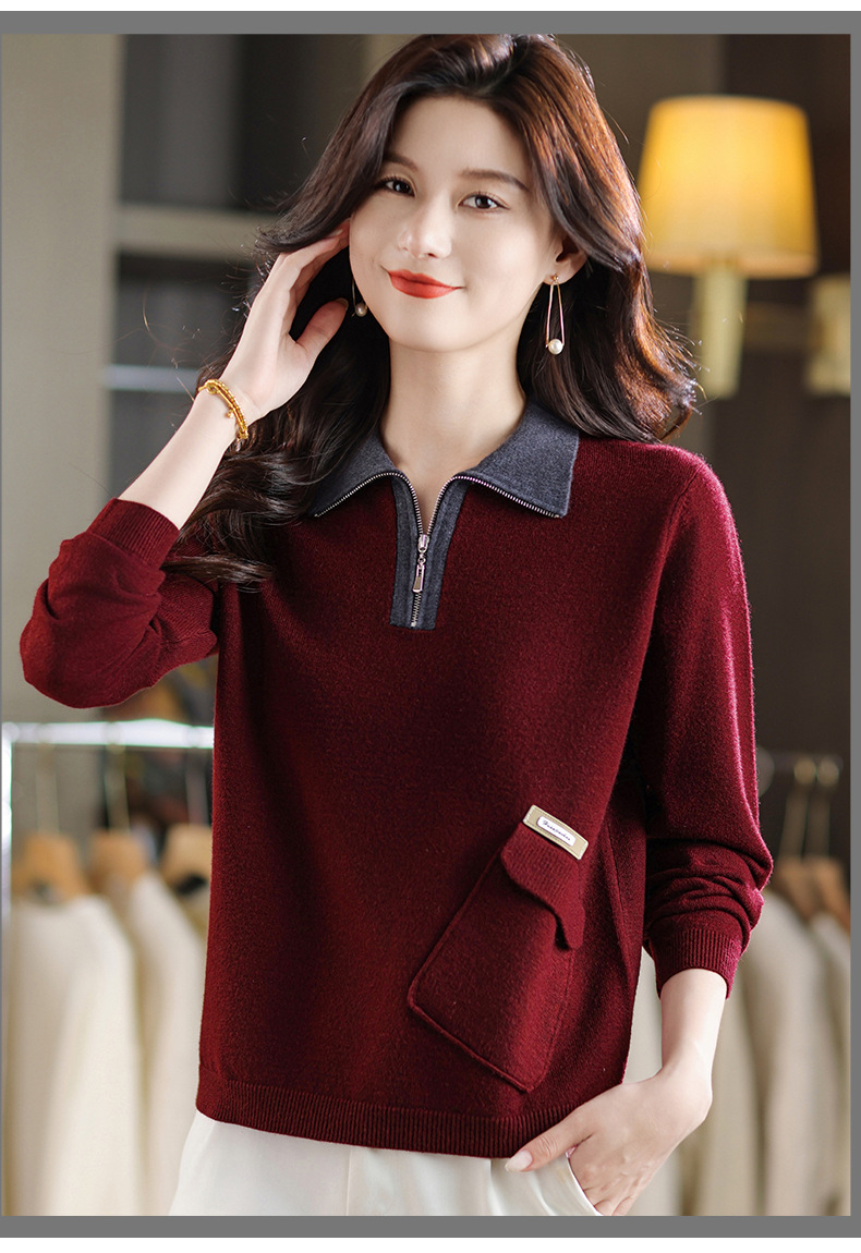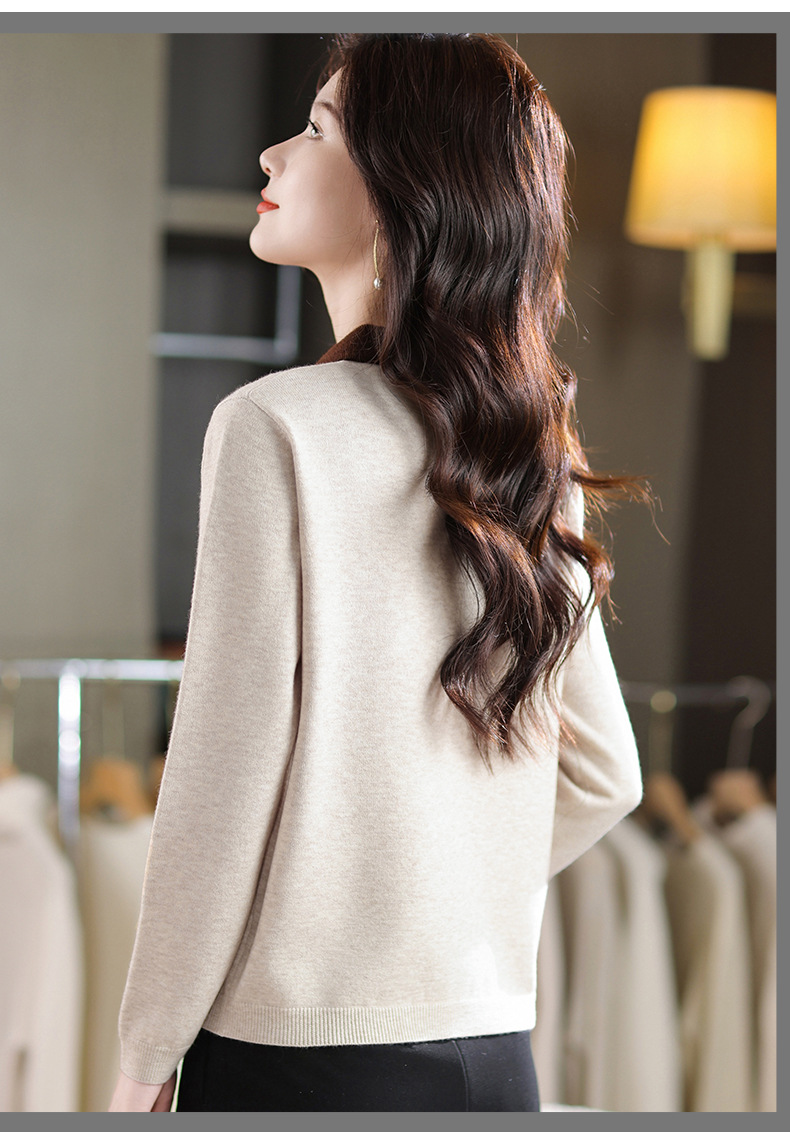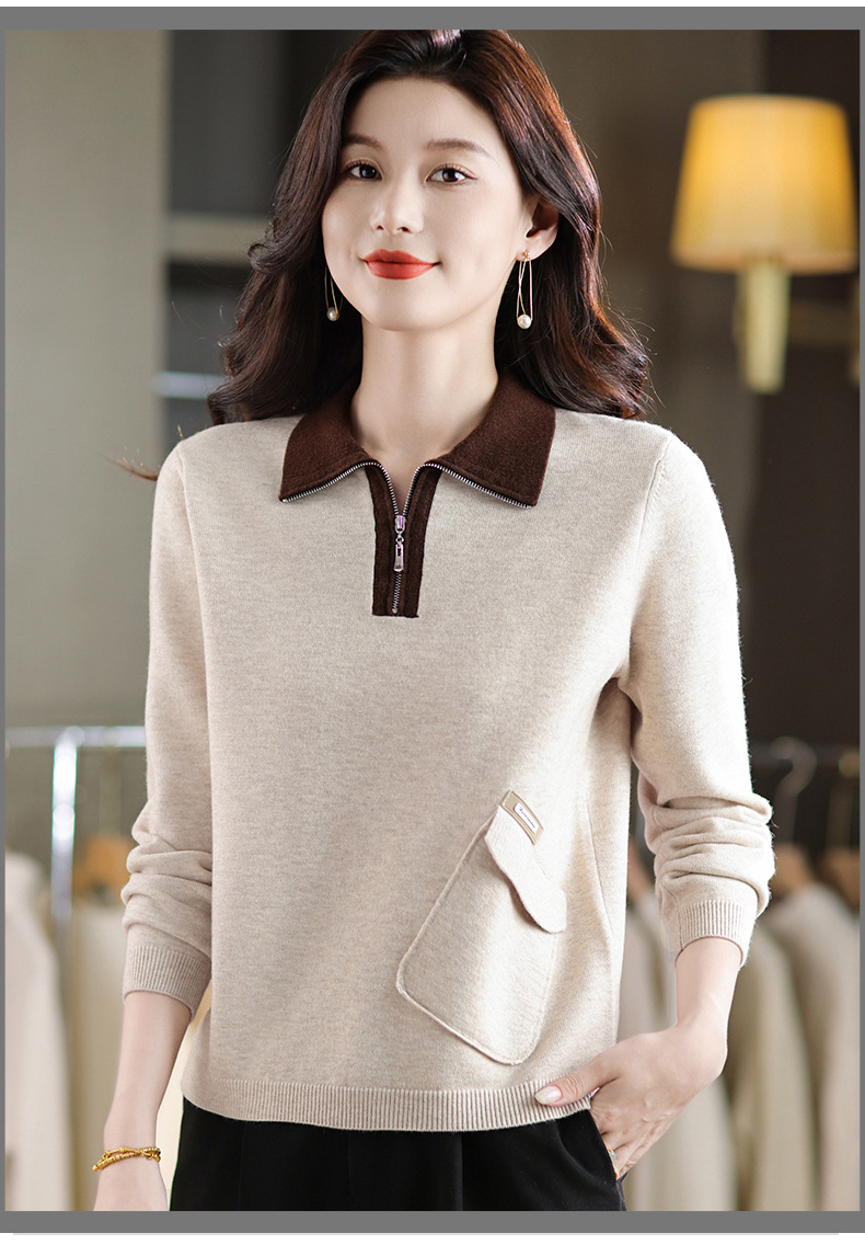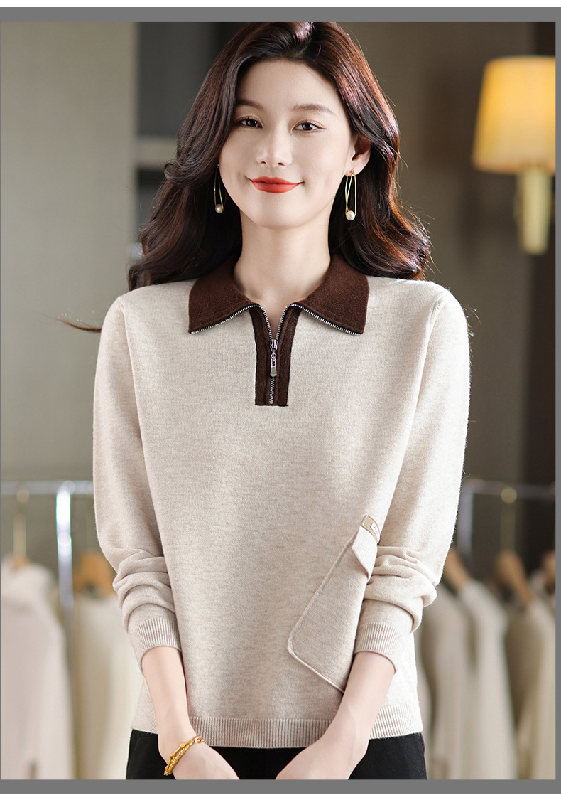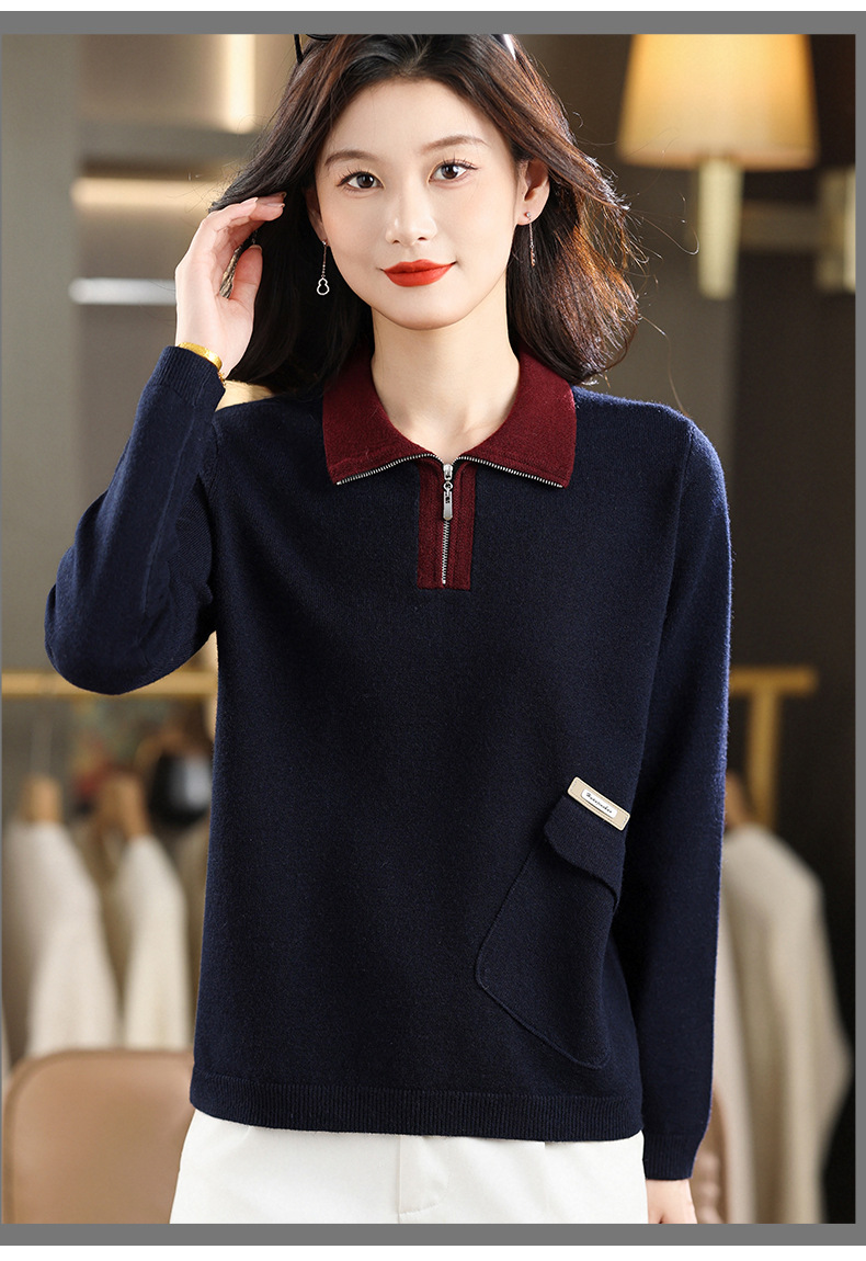 QF 105-1257翻领针织衫拼色宽松休闲毛衣