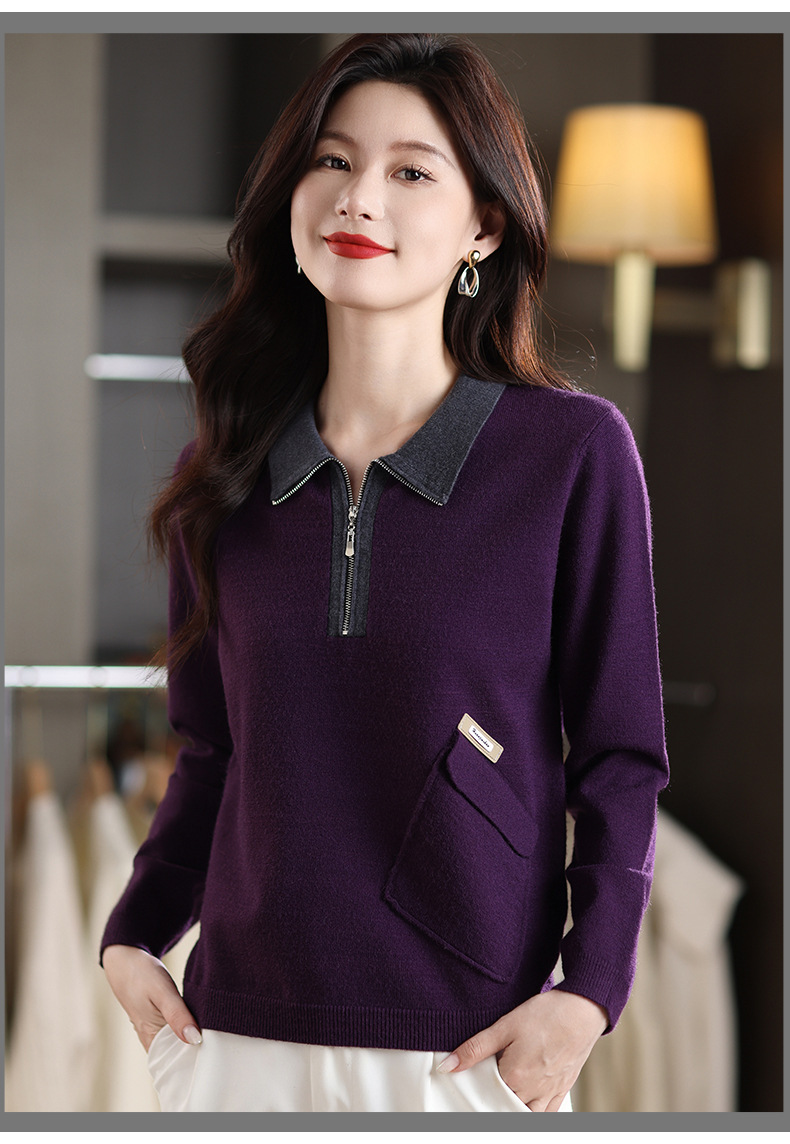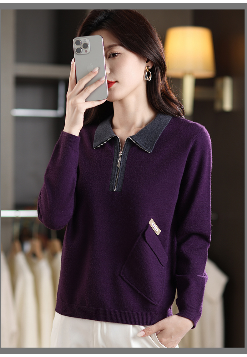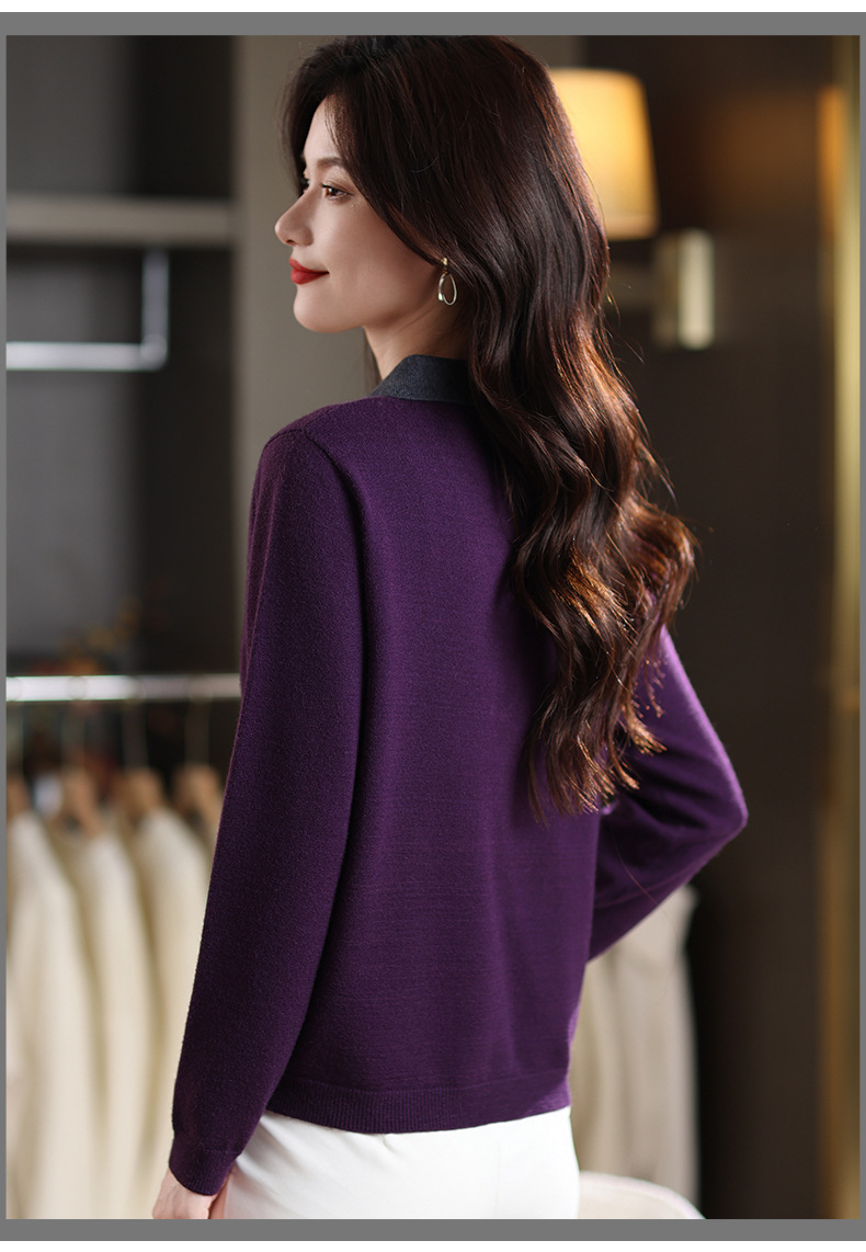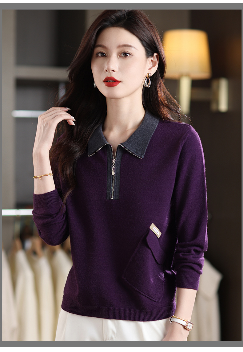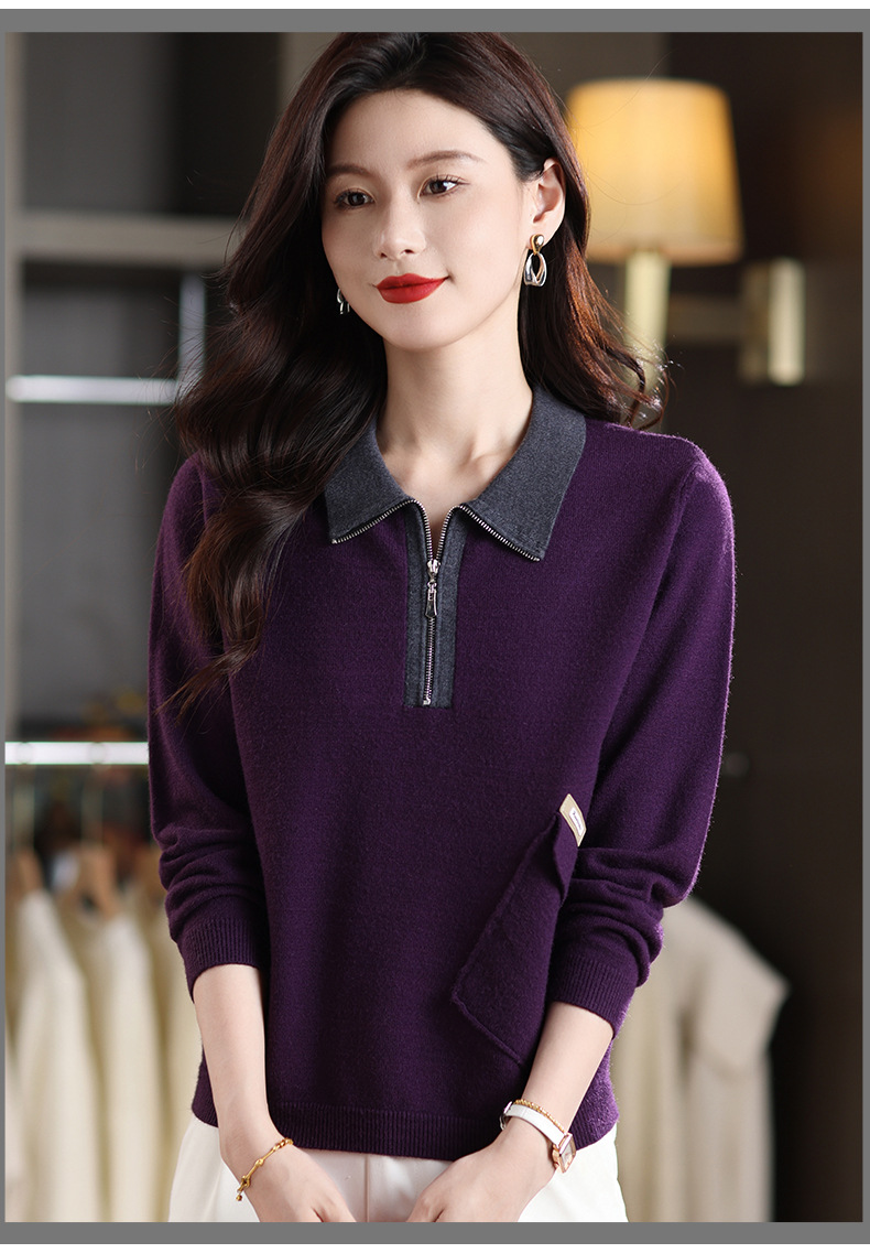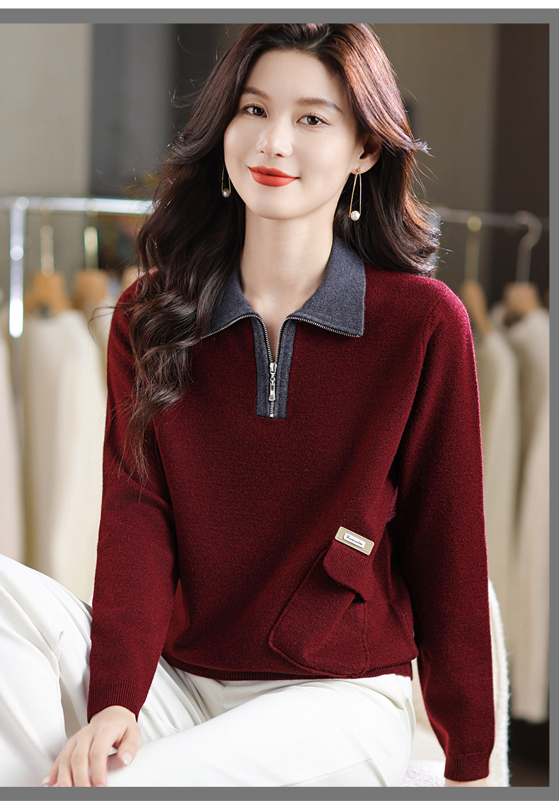 QF 105-1257翻领针织衫拼色宽松休闲毛衣