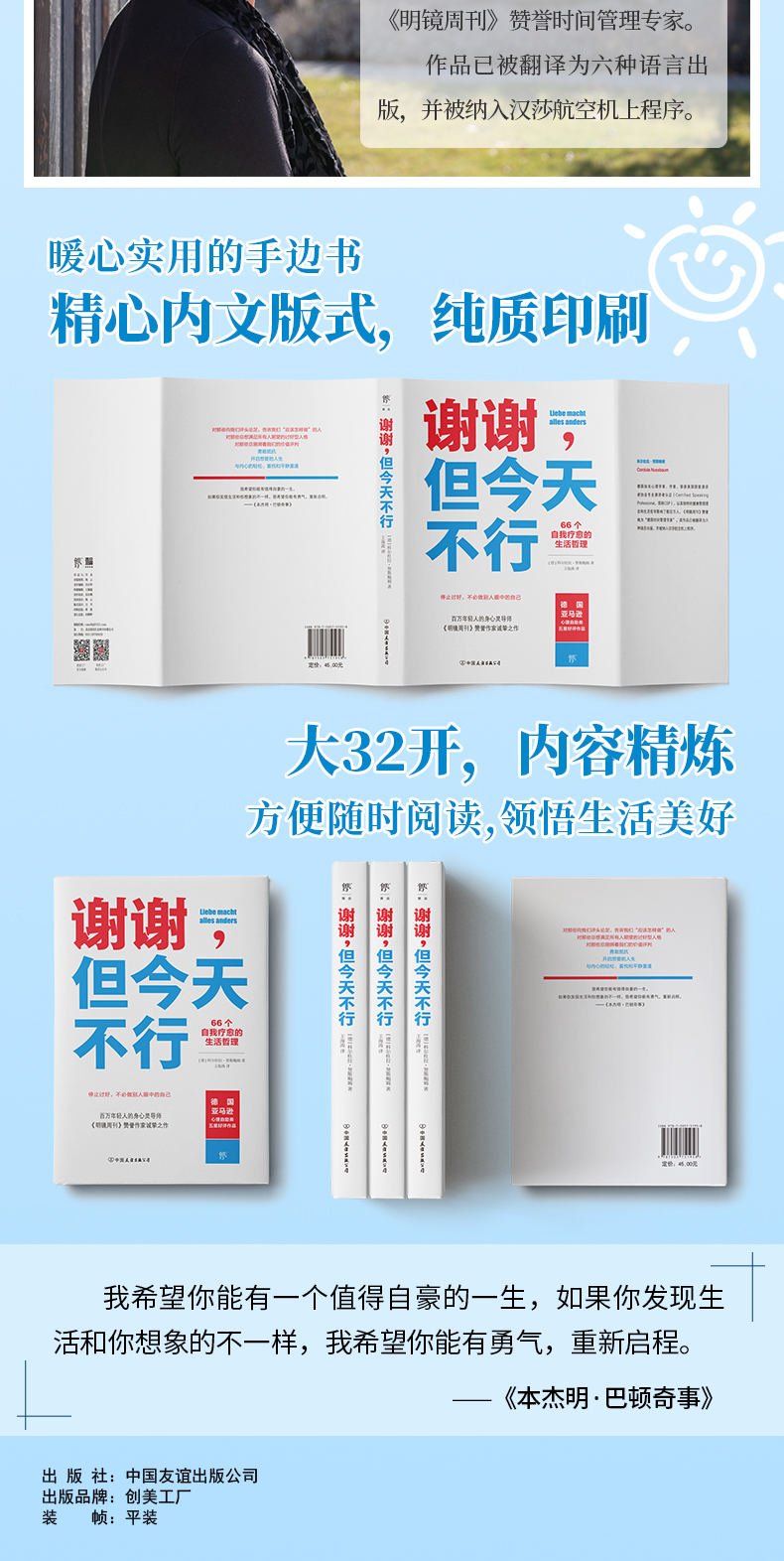 《谢谢,但今天不行》讲述了在当代社会,许多人都挣扎在快节奏的、繁杂的日常生活中,我们感受不到生命的轻快,只是感到压力、束缚和艰难。为了逃脱过度工作和疲惫不堪的恶性循环,我们必须学会说“谢谢,但是今天不行”。