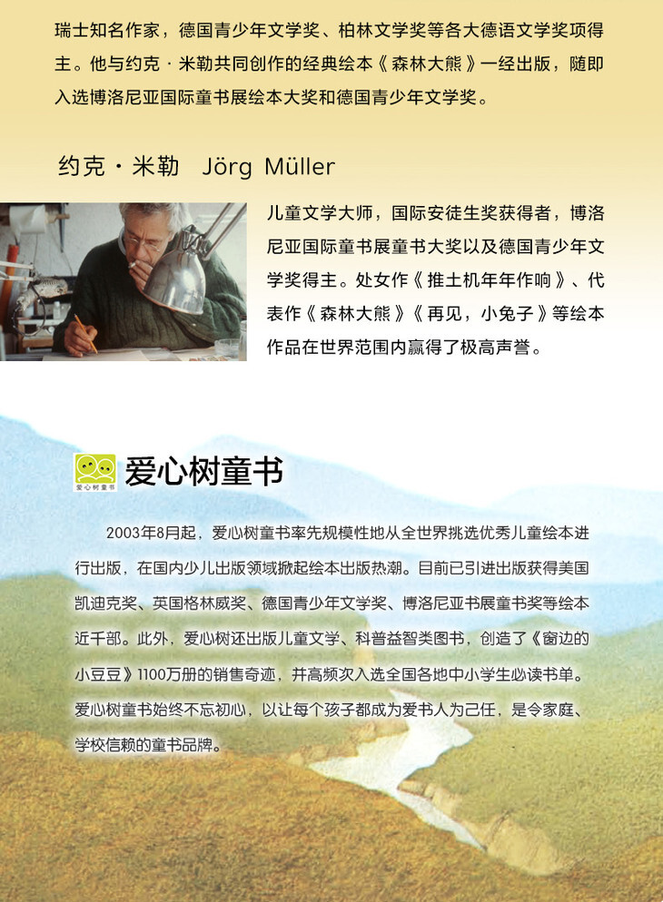 瑞士知名作家,德国青少年文学奖、柏林文学奖等各大德语文学奖项得主。1930年出生于瑞士比尔,从事过多年教育工作。20世纪50年代在一家青少年管教所的工作经历,对他后来的创作产生了深远影响。他开始关注社会边缘人群,并反思现代文明中人类的生存方式。在此思想影响下,他与约克·米勒重新演绎了美国作家弗兰克·塔什林的作品《不是熊的熊》(The Bear That Wasn’t),创作出脍炙人口的经典绘本《森林大熊》。该书一经出版,随即入选博洛尼亚***童书展绘本大奖和德国青少年文学奖。