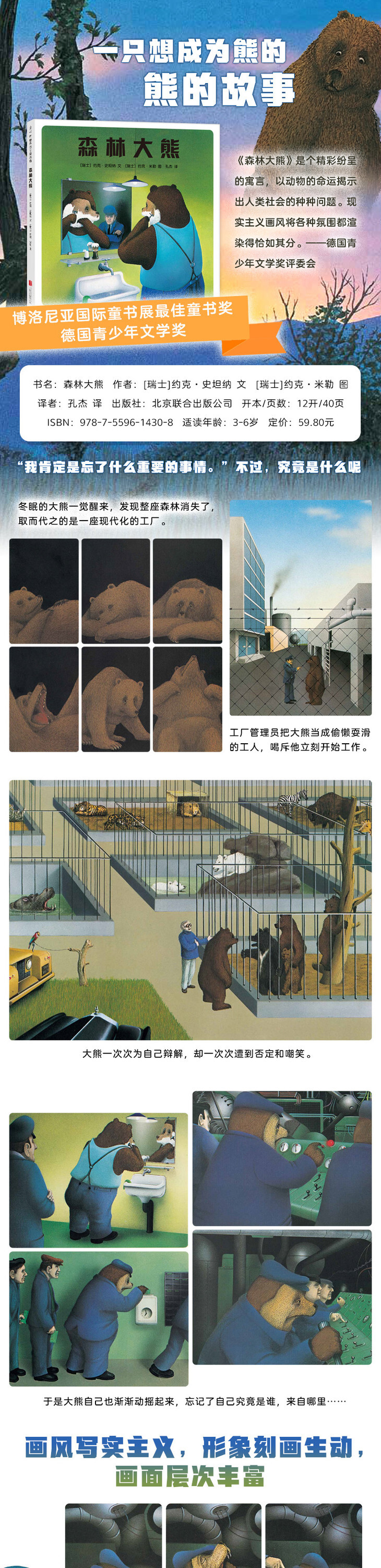 ★《森林大熊》是个精彩纷呈的寓言,以动物的命运揭示出人类社会的种种问题。现实主义画风将各种氛围都渲染得恰如其分。——德国青少年文学奖评委会